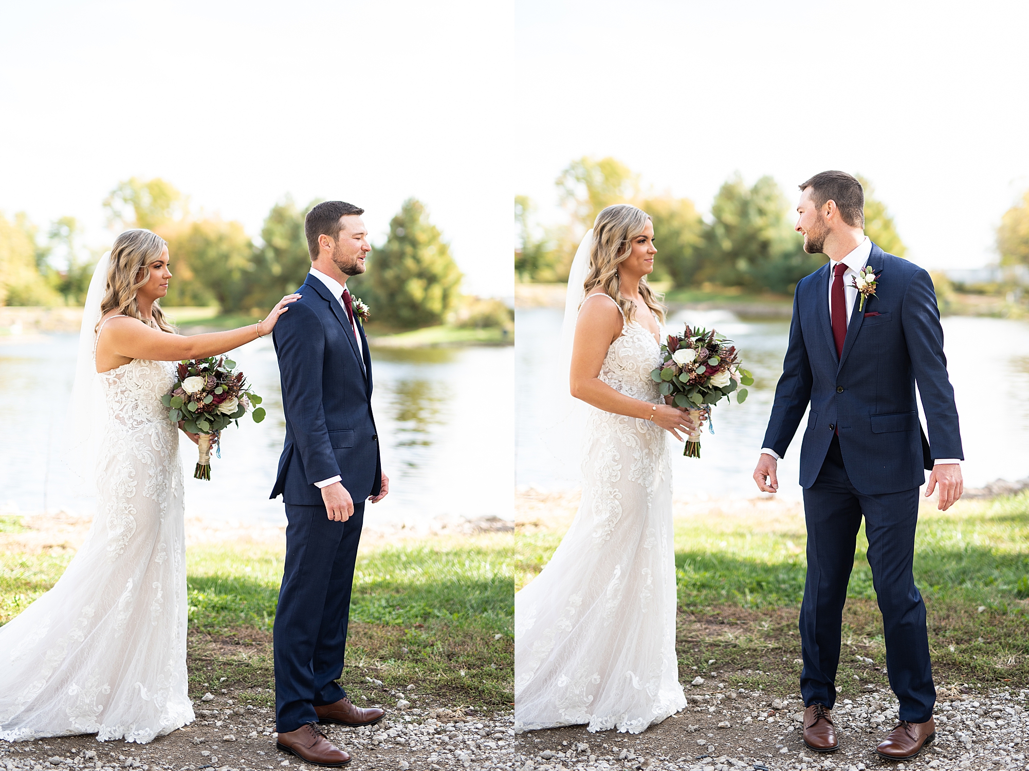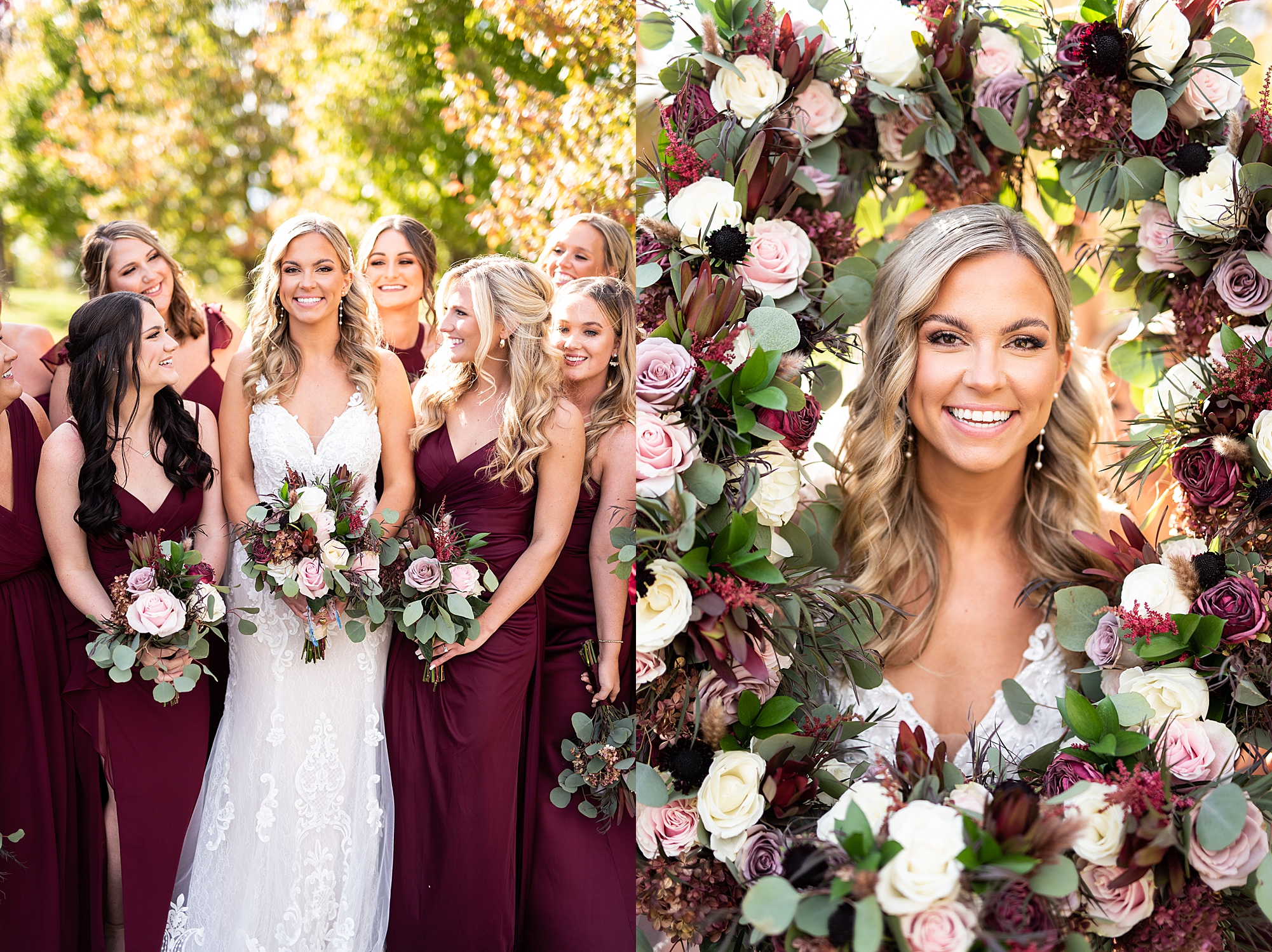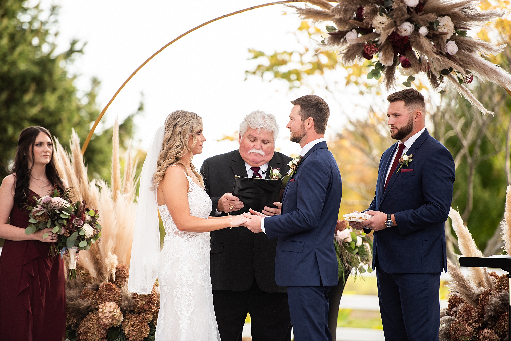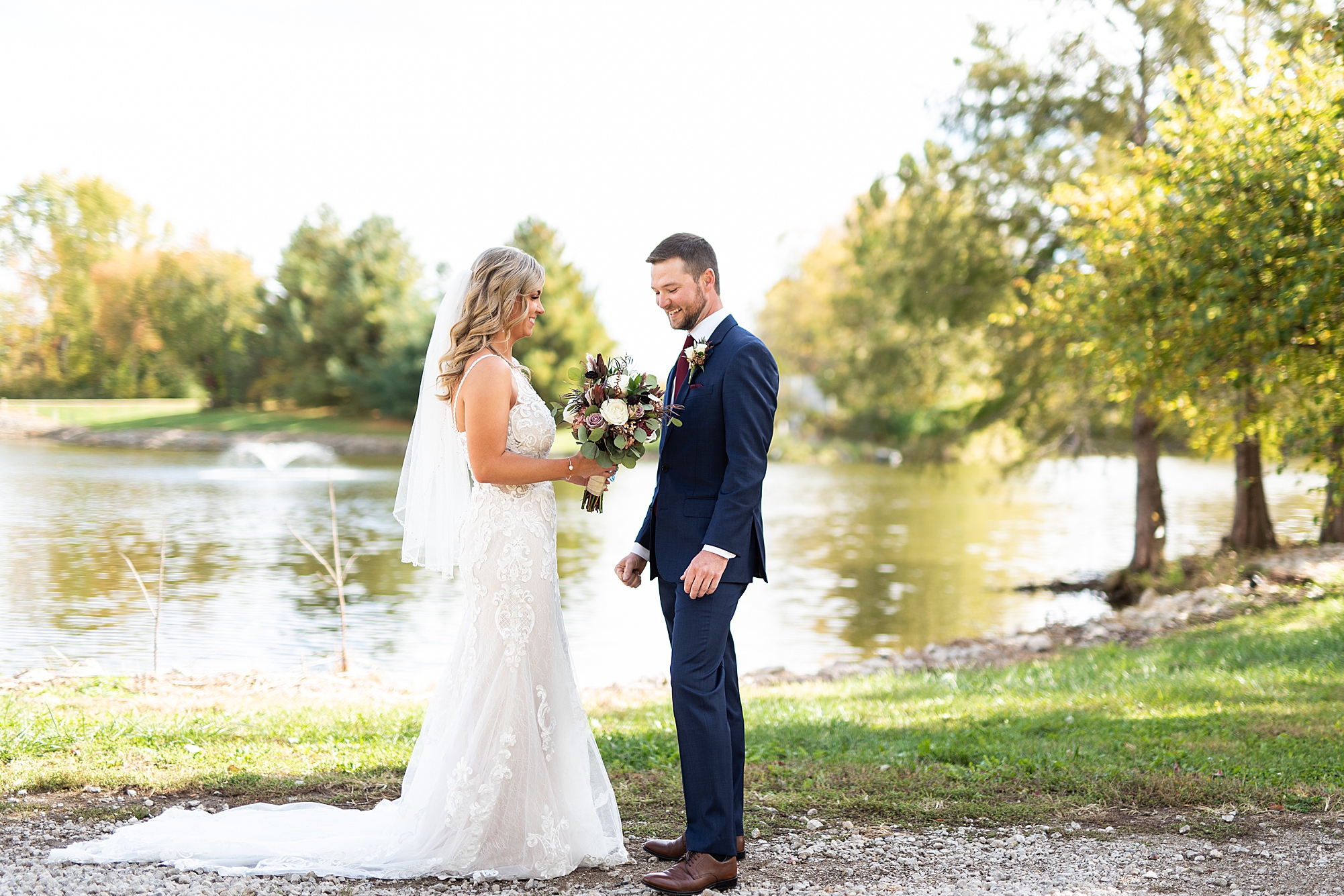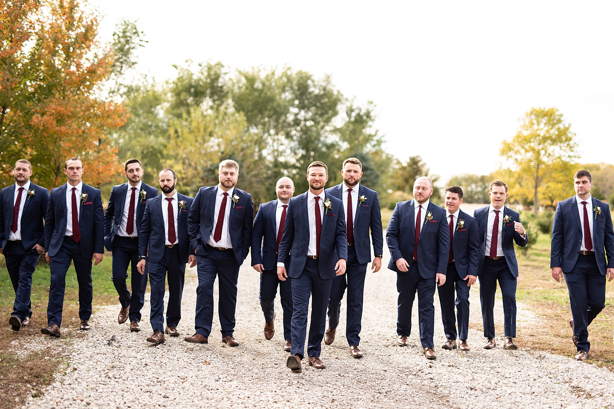 Morgan spent the morning getting ready at home with her bridesmaids and then her mom helped her put on her final touches before it was time to go meet Brett. Brett got ready at the venue, Paul Tree Farms with his groomsmen while he waiting for Morgan’s arrival. They shared a sweet first look overlooking the pond, both of them smiling so big when they saw each other! It was an absolutely beautiful fall day, full of sunshine and warm weather. We spent that afternoon taking photos of them together and then with their wedding party who truly made the whole day so much fun!