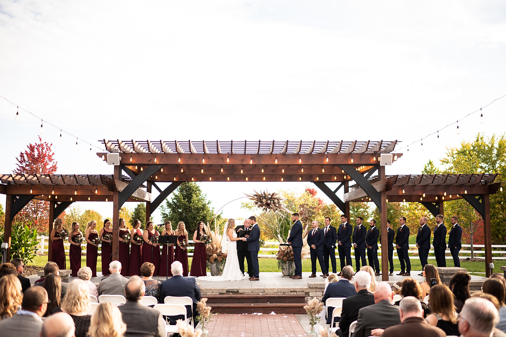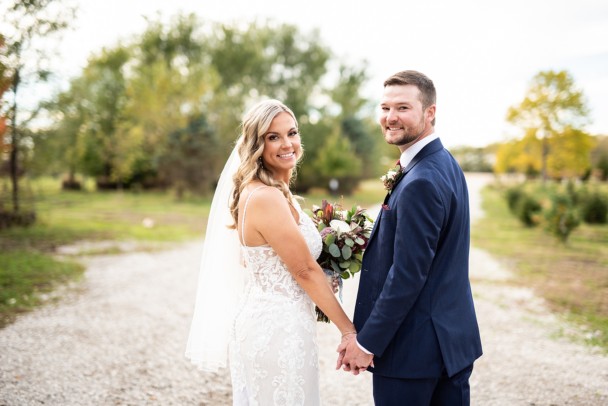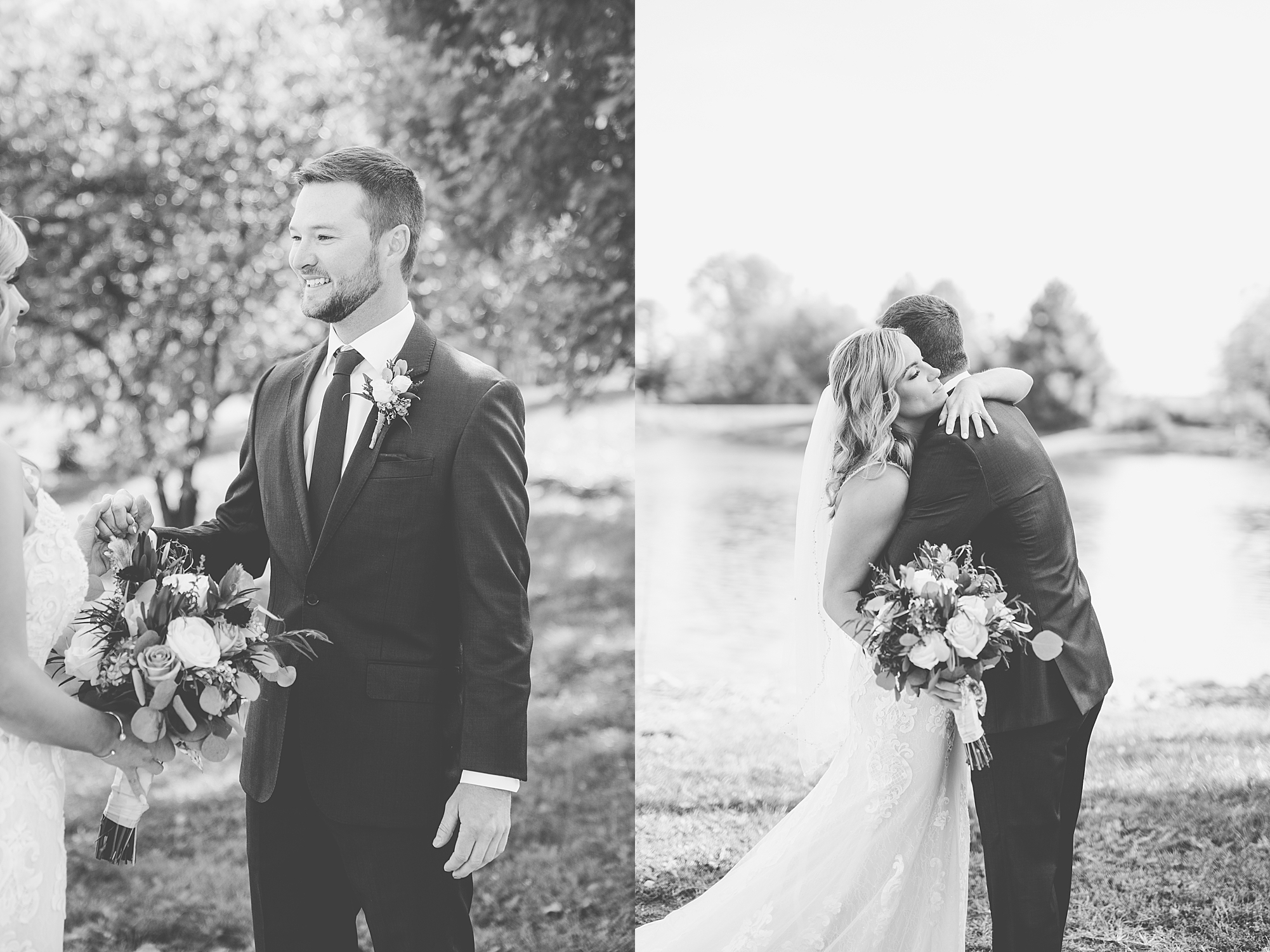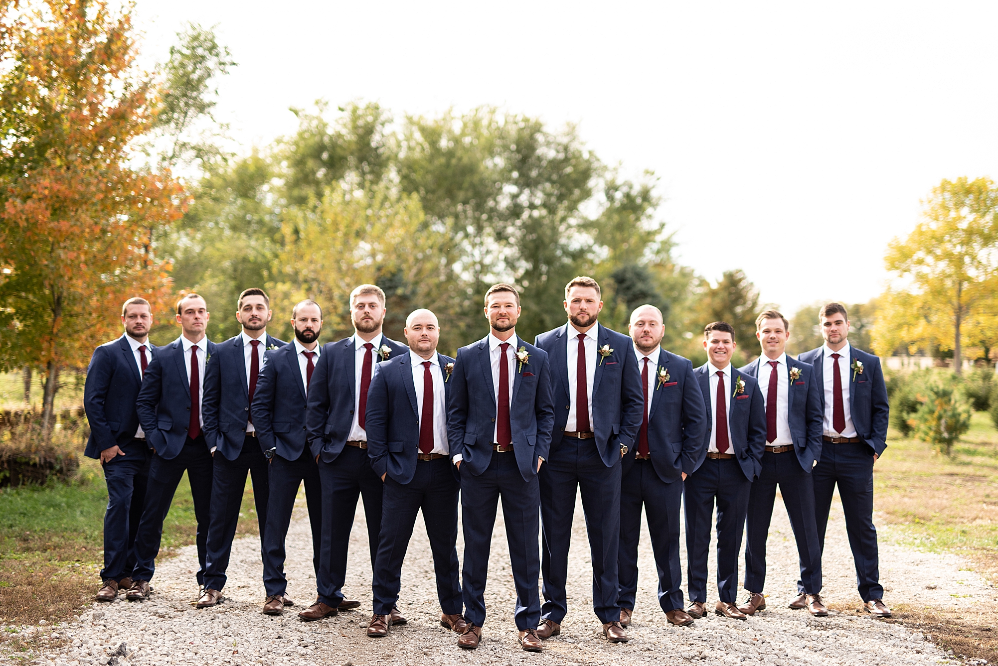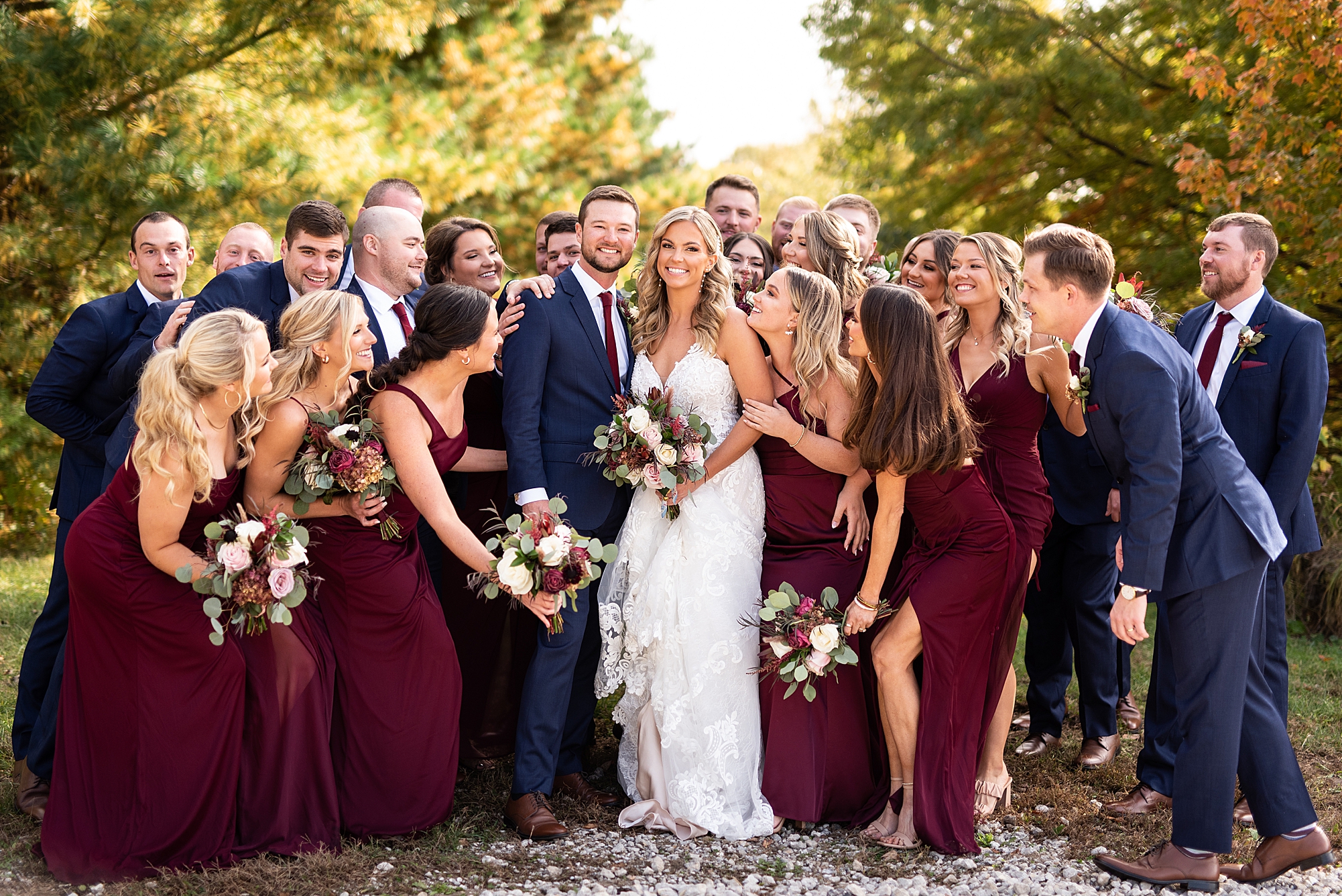 Morgan spent the morning getting ready at home with her bridesmaids and then her mom helped her put on her final touches before it was time to go meet Brett. Brett got ready at the venue, Paul Tree Farms with his groomsmen while he waiting for Morgan’s arrival. They shared a sweet first look overlooking the pond, both of them smiling so big when they saw each other! It was an absolutely beautiful fall day, full of sunshine and warm weather. We spent that afternoon taking photos of them together and then with their wedding party who truly made the whole day so much fun!