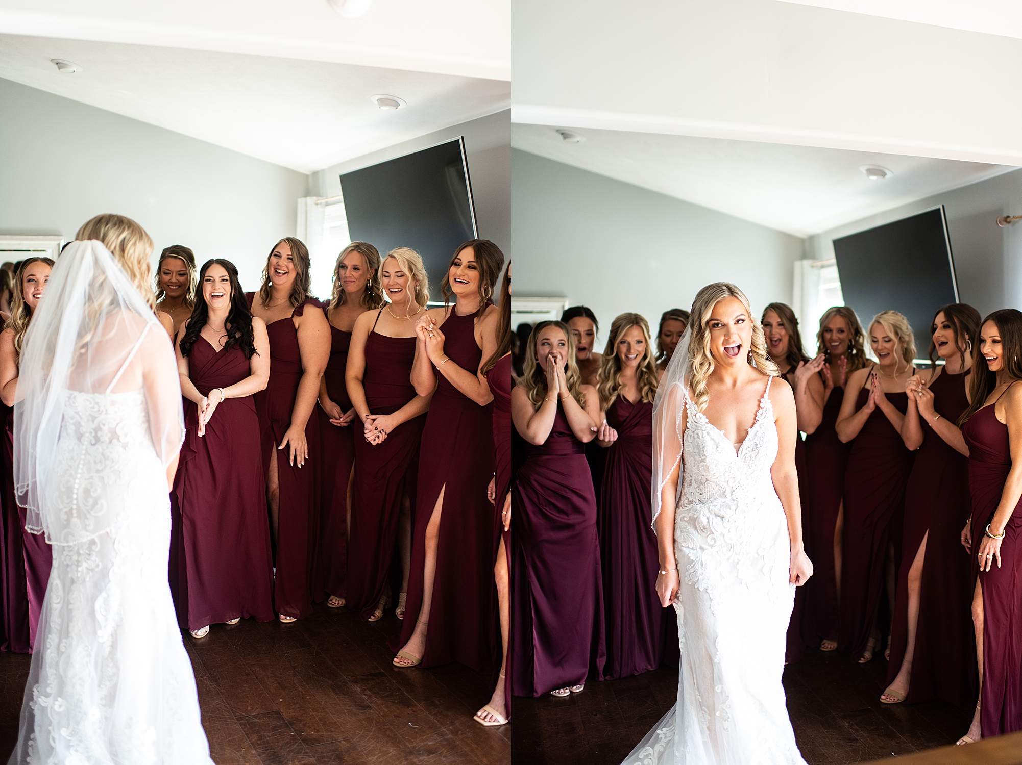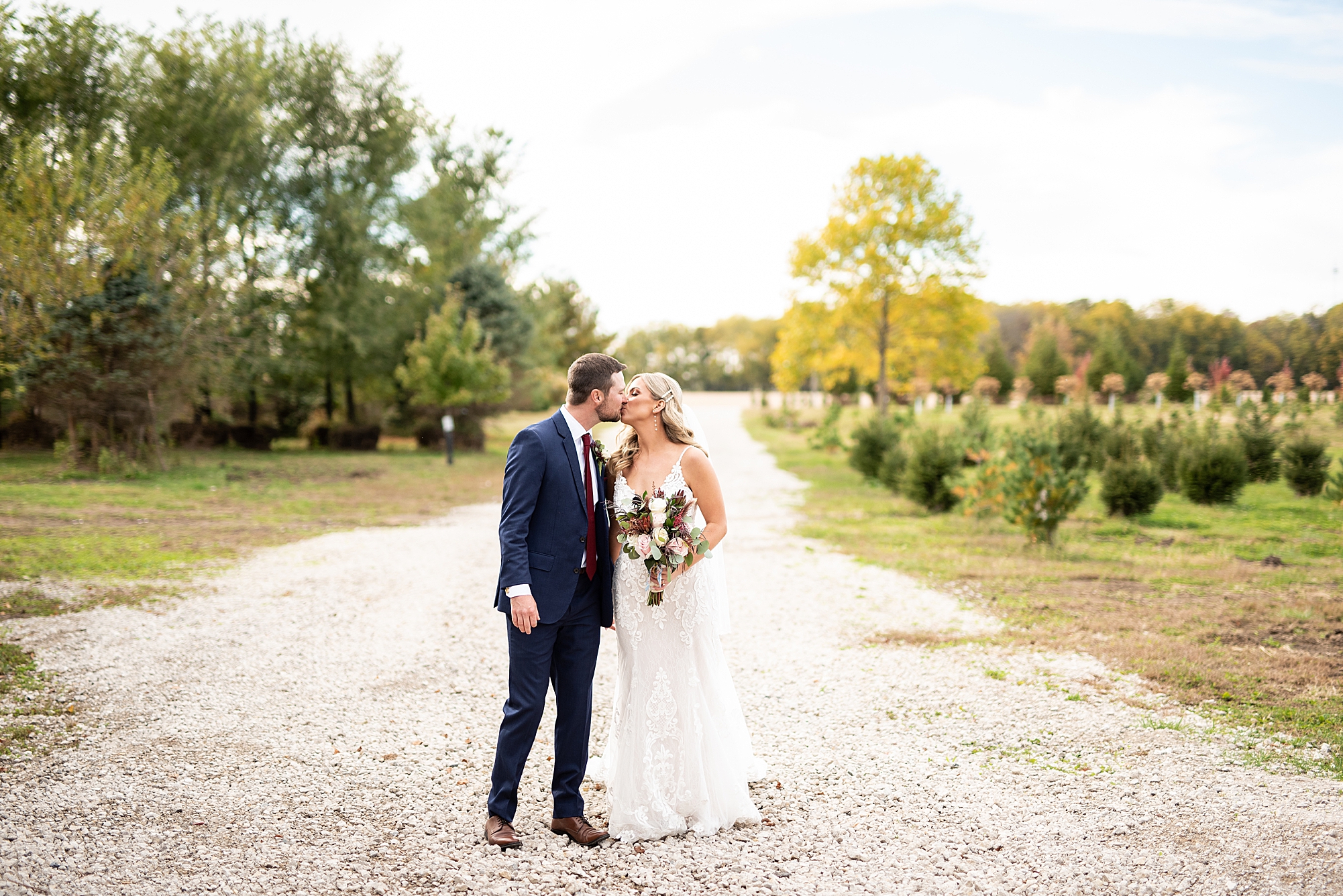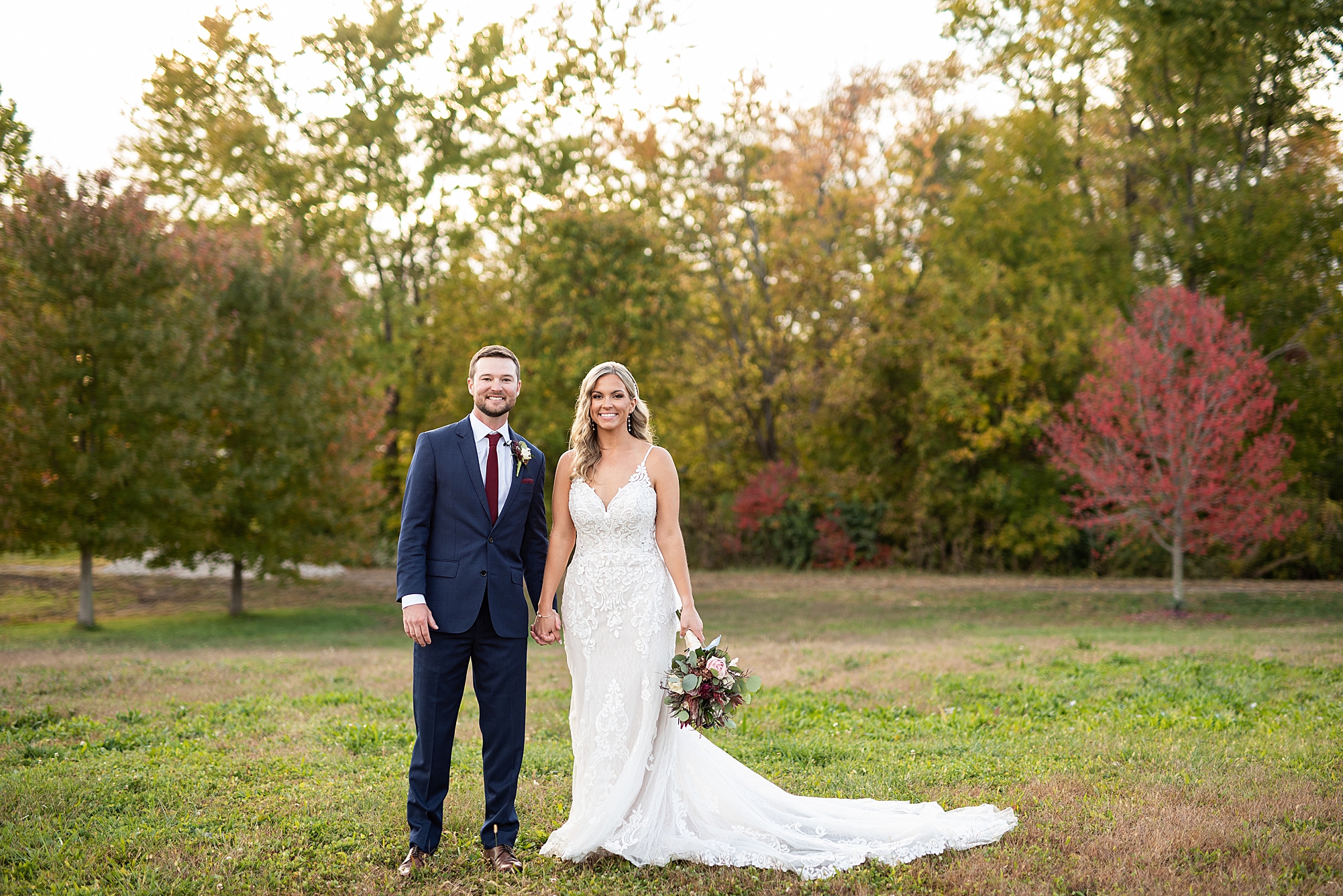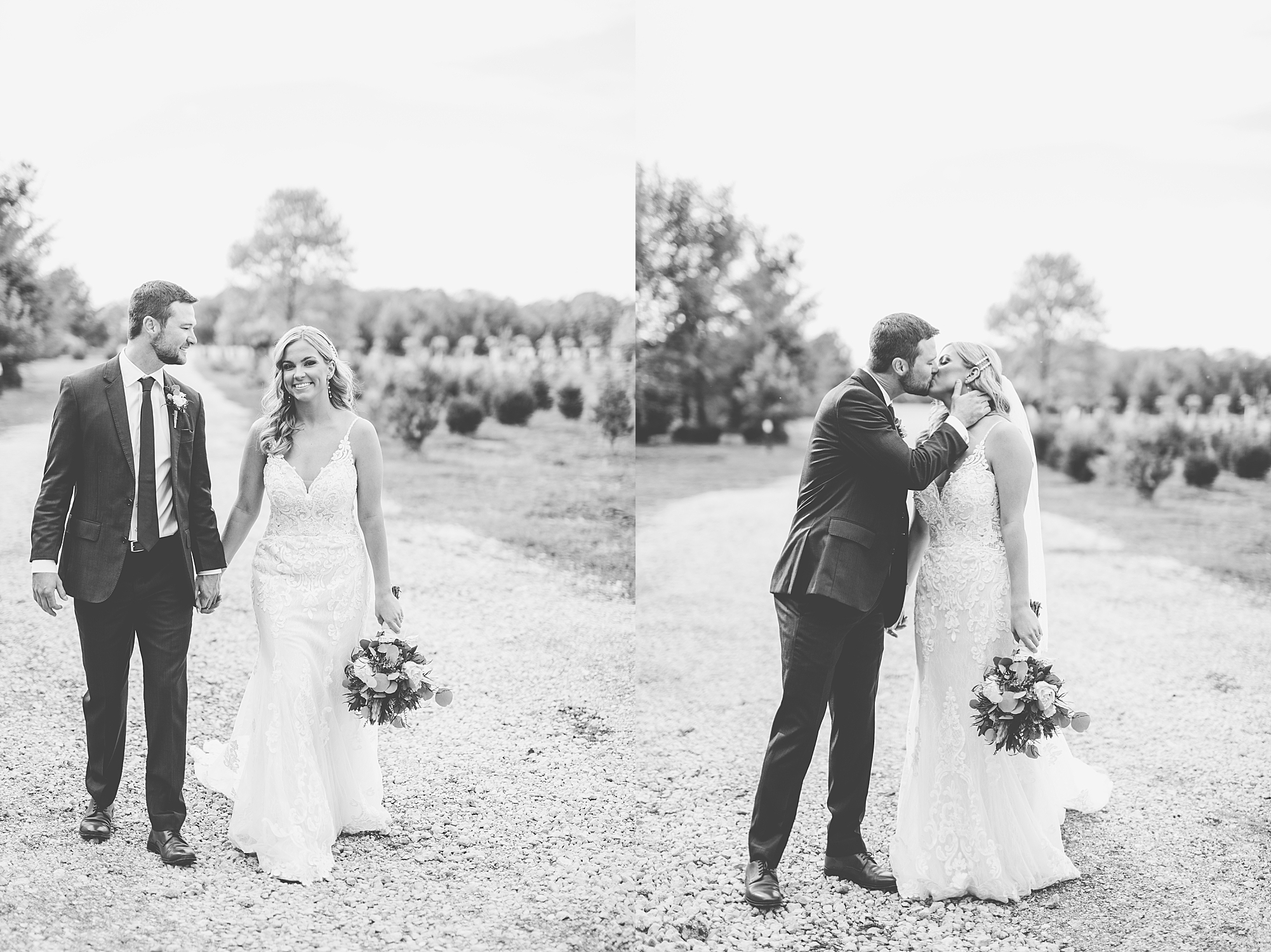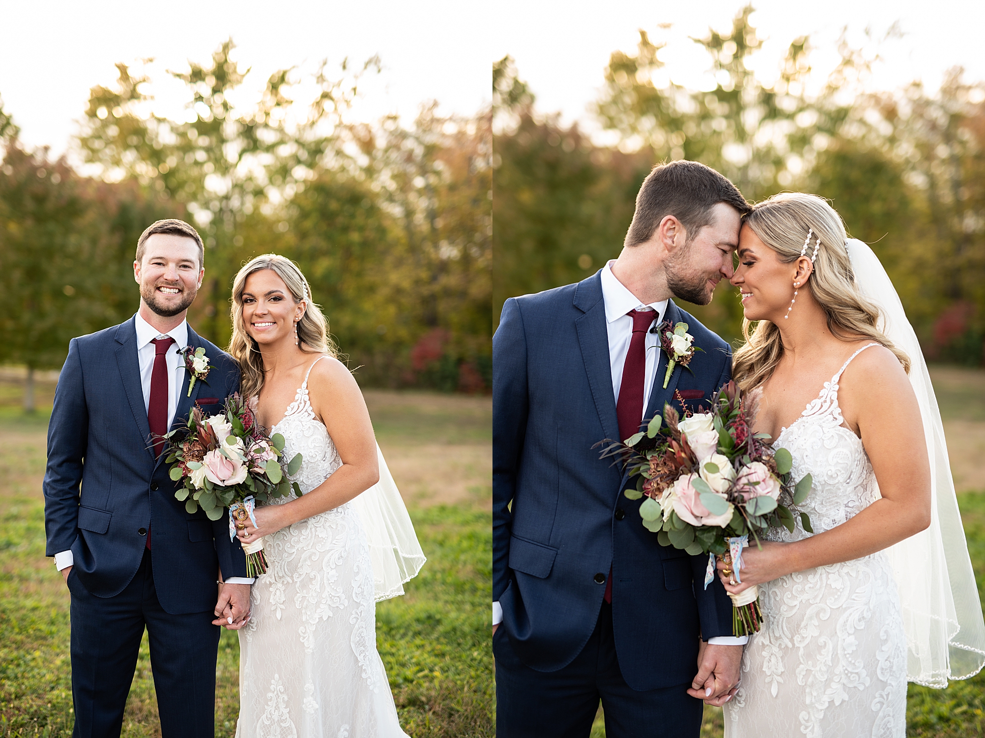 Morgan spent the morning getting ready at home with her bridesmaids and then her mom helped her put on her final touches before it was time to go meet Brett. Brett got ready at the venue, Paul Tree Farms with his groomsmen while he waiting for Morgan’s arrival. They shared a sweet first look overlooking the pond, both of them smiling so big when they saw each other! It was an absolutely beautiful fall day, full of sunshine and warm weather. We spent that afternoon taking photos of them together and then with their wedding party who truly made the whole day so much fun!