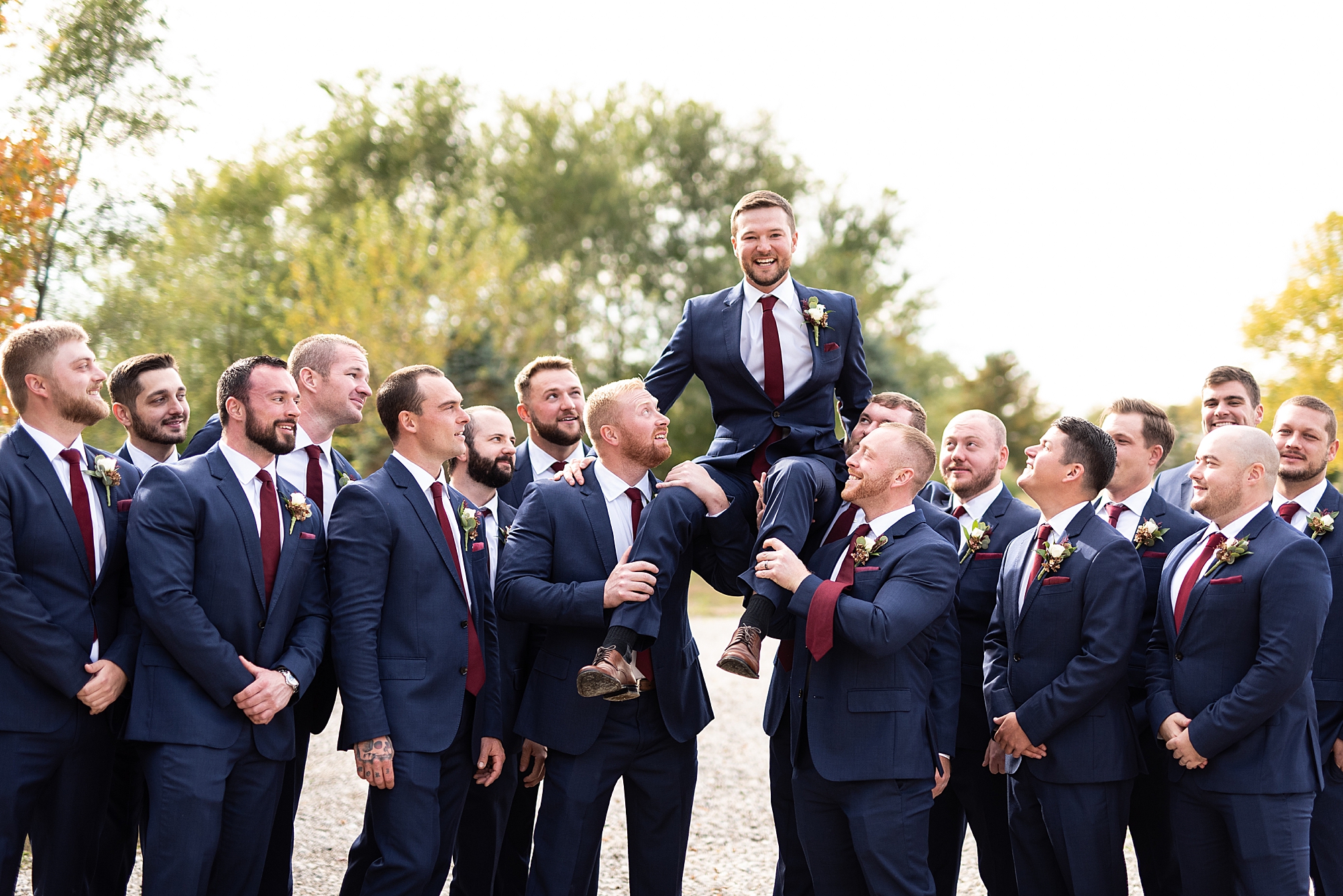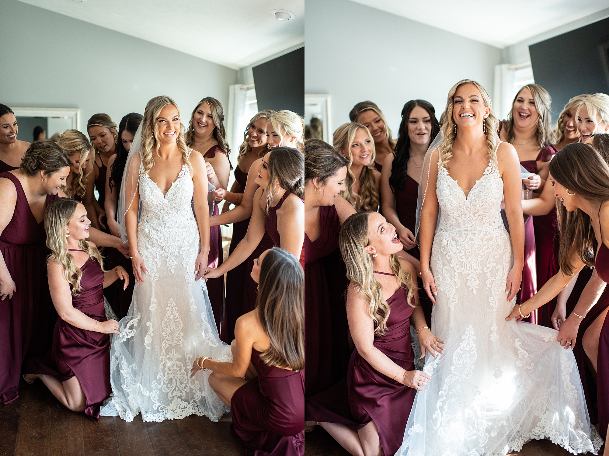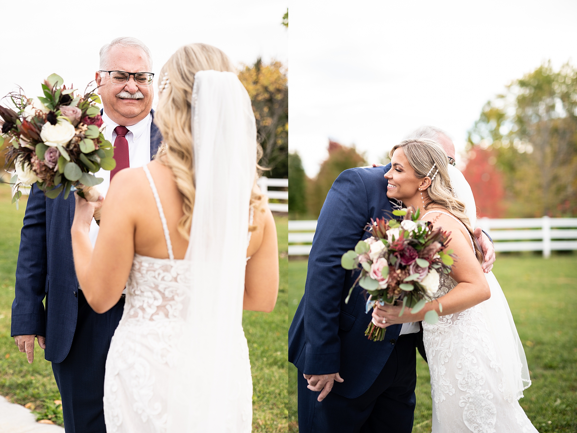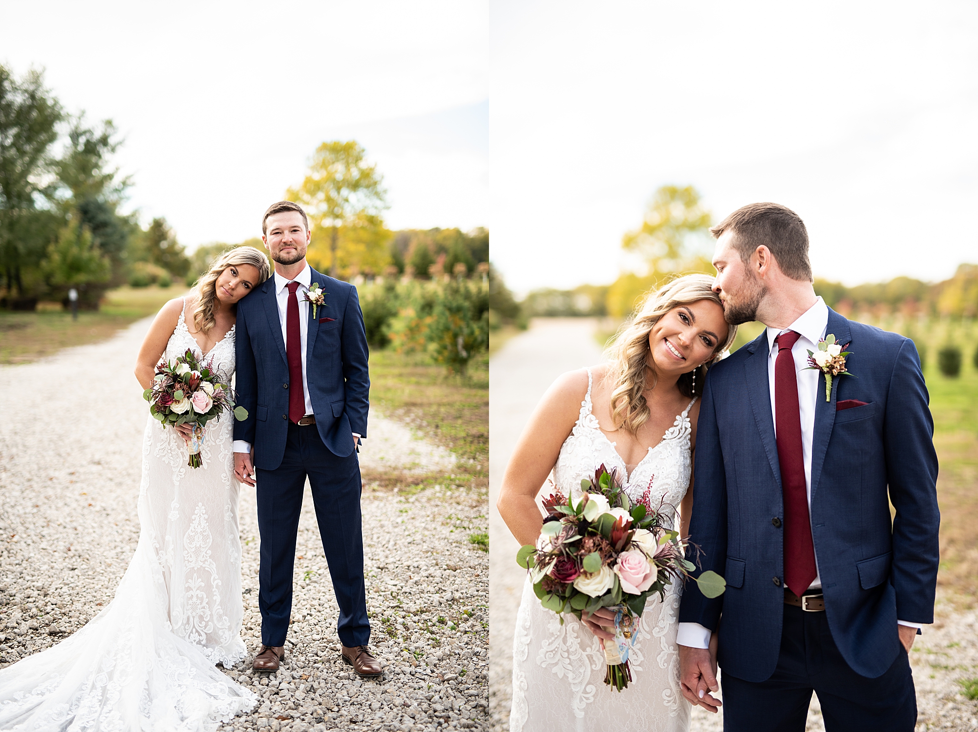 Morgan spent the morning getting ready at home with her bridesmaids and then her mom helped her put on her final touches before it was time to go meet Brett. Brett got ready at the venue, Paul Tree Farms with his groomsmen while he waiting for Morgan’s arrival. They shared a sweet first look overlooking the pond, both of them smiling so big when they saw each other! It was an absolutely beautiful fall day, full of sunshine and warm weather. We spent that afternoon taking photos of them together and then with their wedding party who truly made the whole day so much fun!