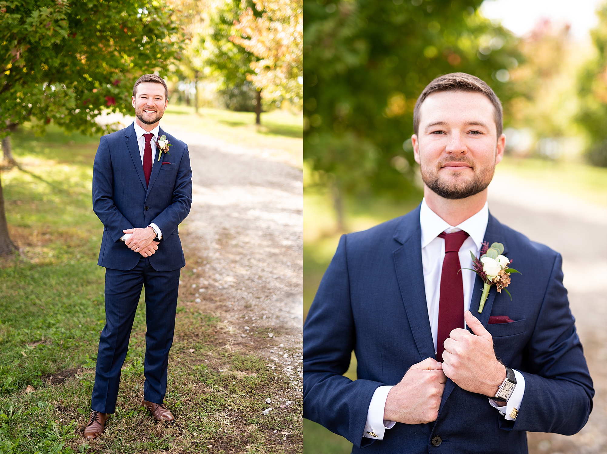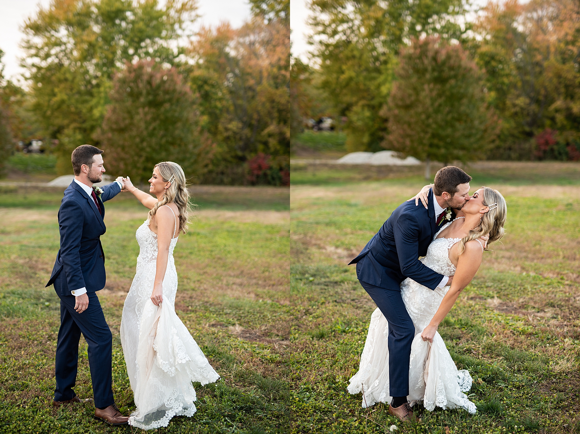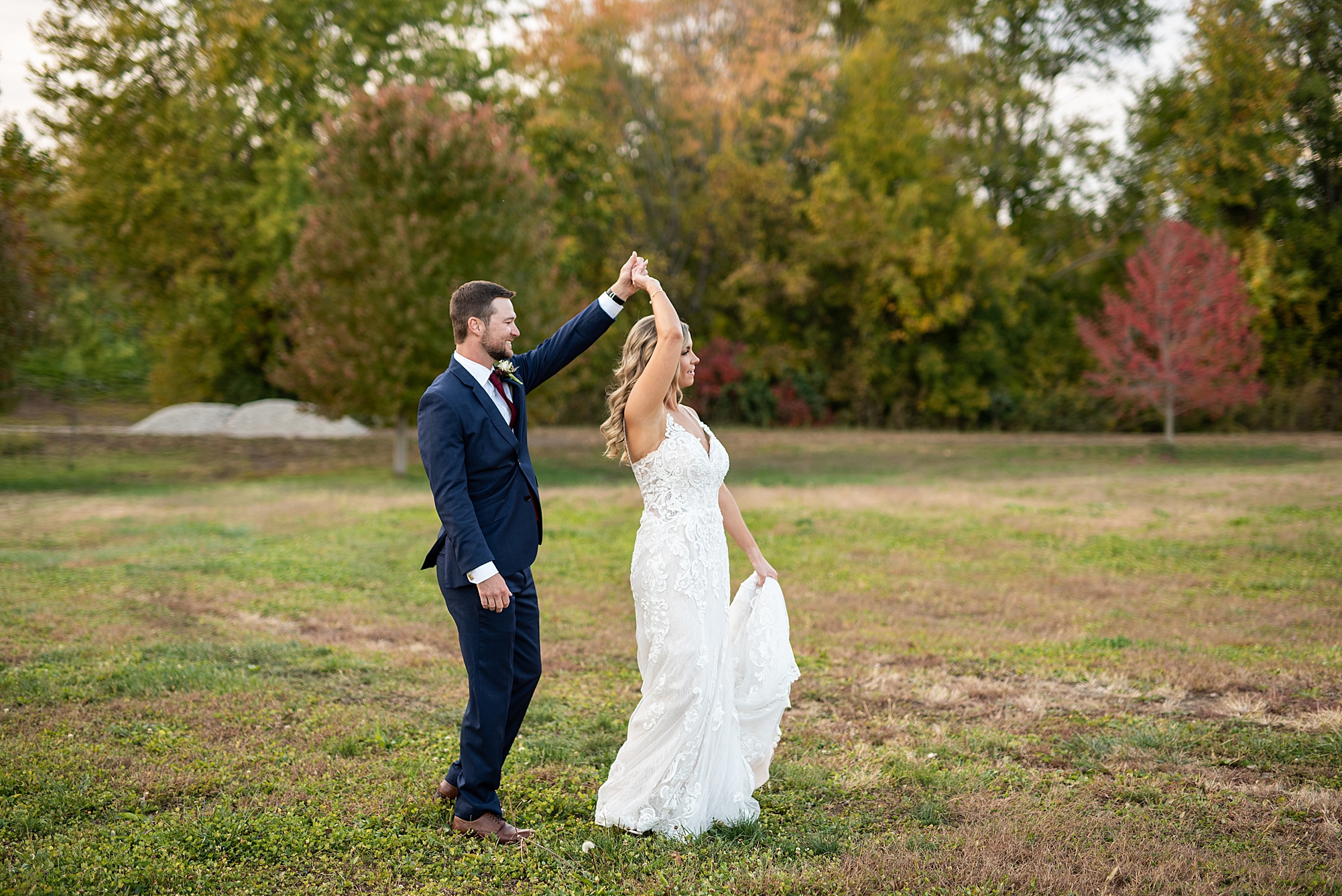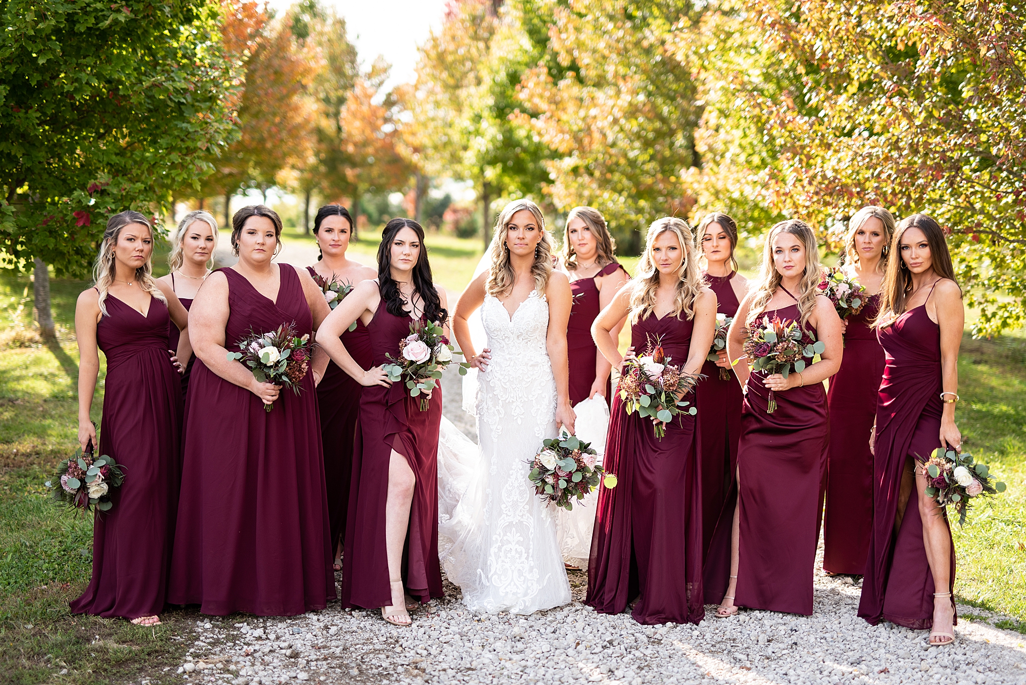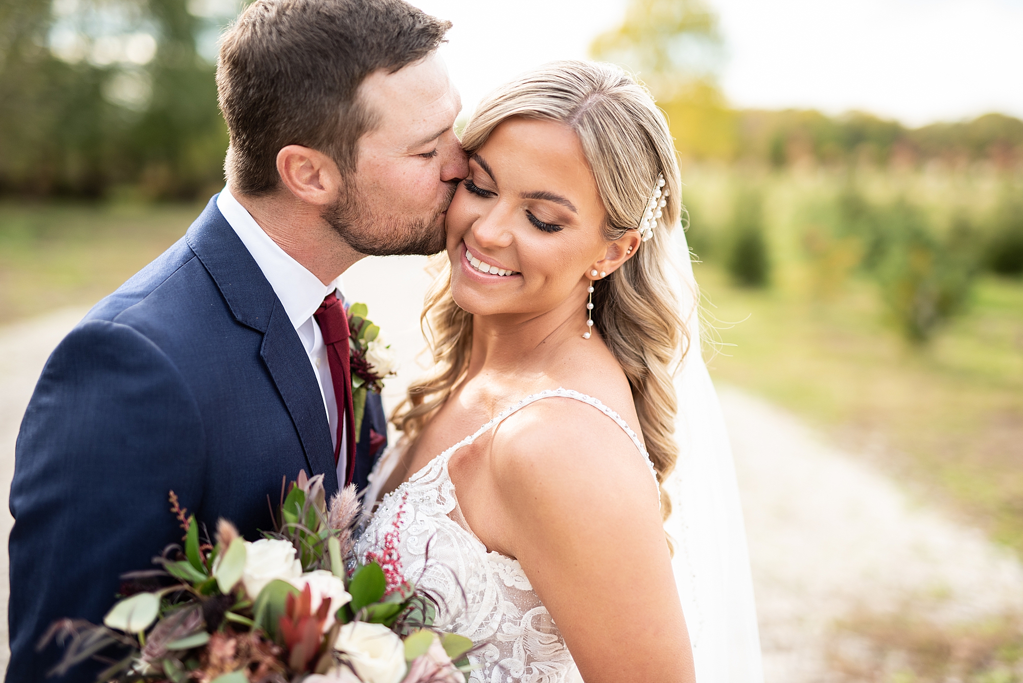 Morgan spent the morning getting ready at home with her bridesmaids and then her mom helped her put on her final touches before it was time to go meet Brett. Brett got ready at the venue, Paul Tree Farms with his groomsmen while he waiting for Morgan’s arrival. They shared a sweet first look overlooking the pond, both of them smiling so big when they saw each other! It was an absolutely beautiful fall day, full of sunshine and warm weather. We spent that afternoon taking photos of them together and then with their wedding party who truly made the whole day so much fun!