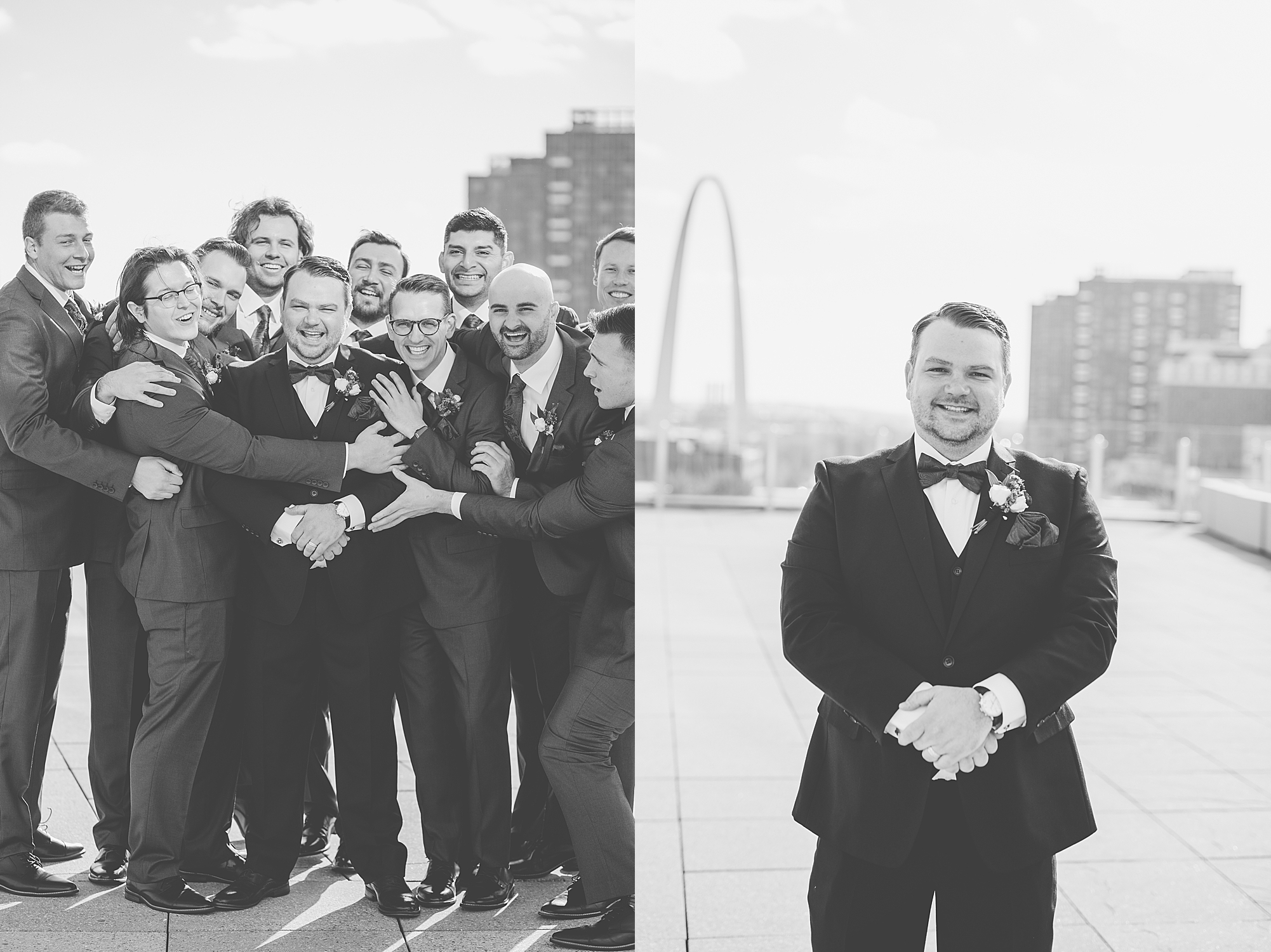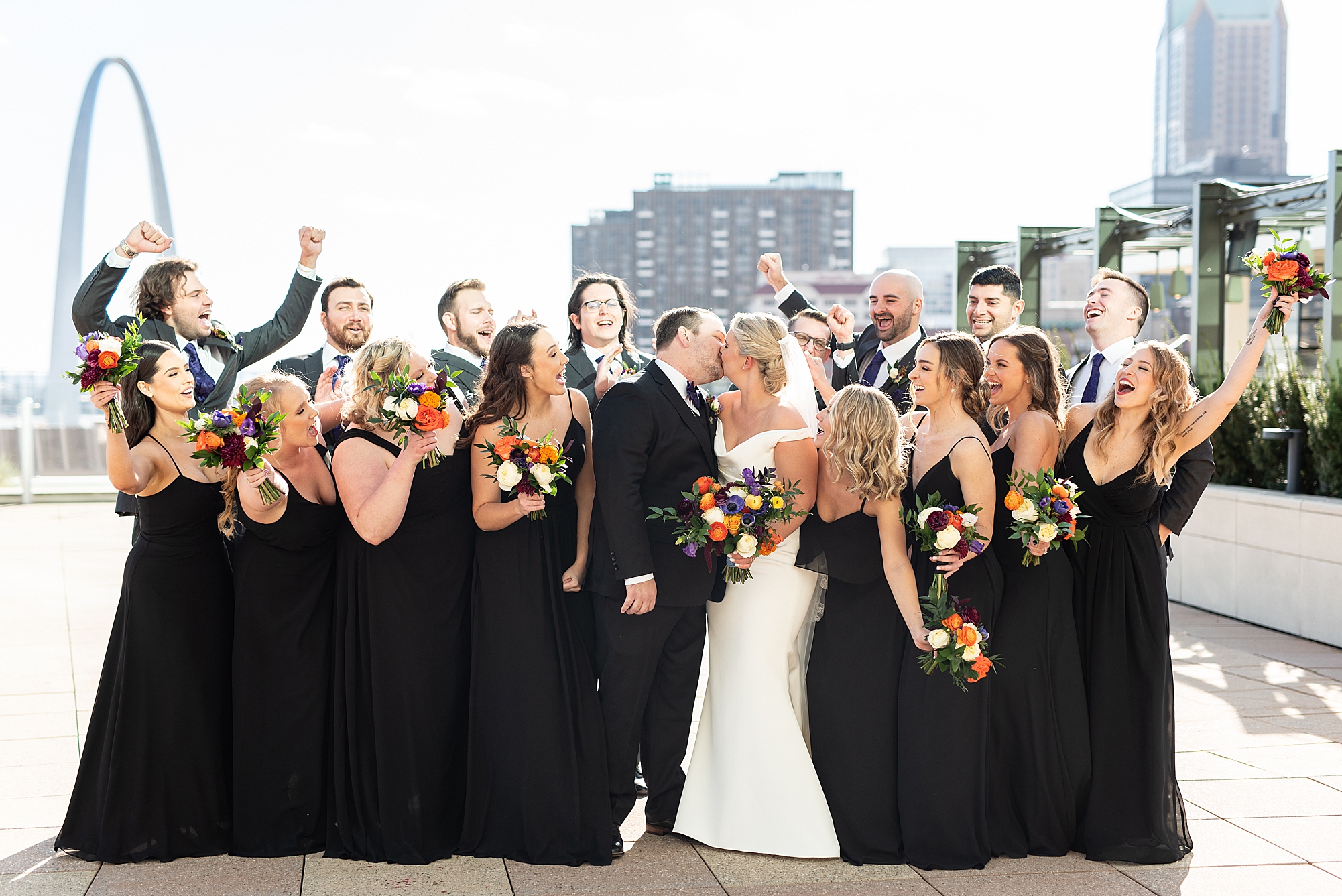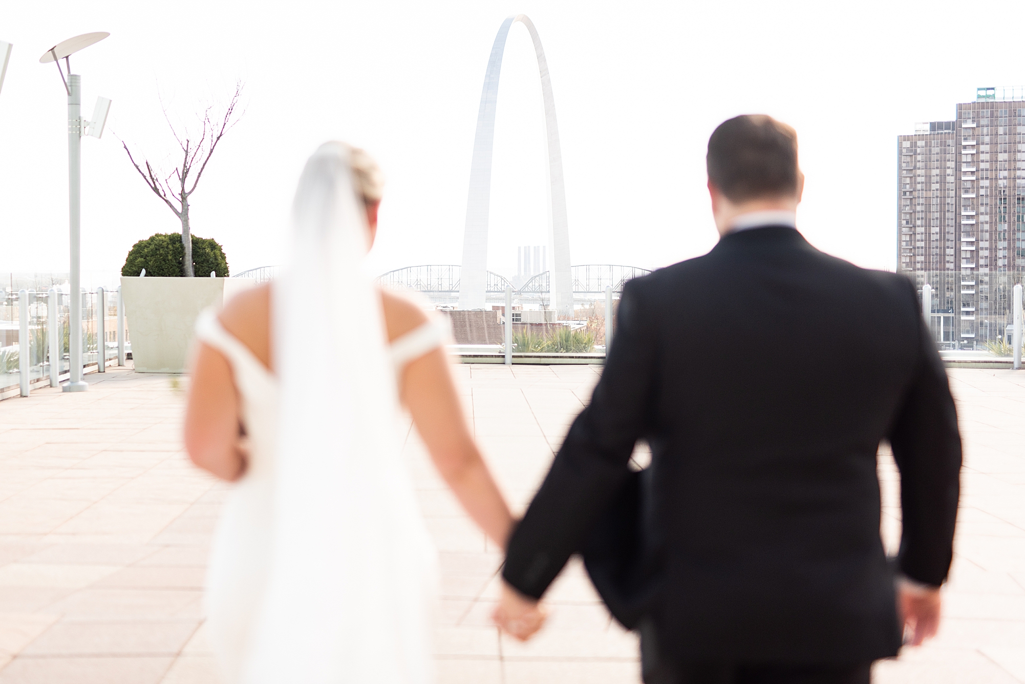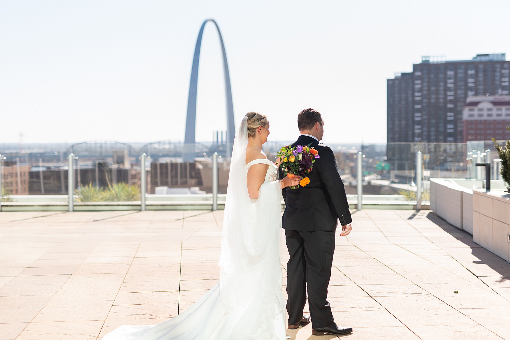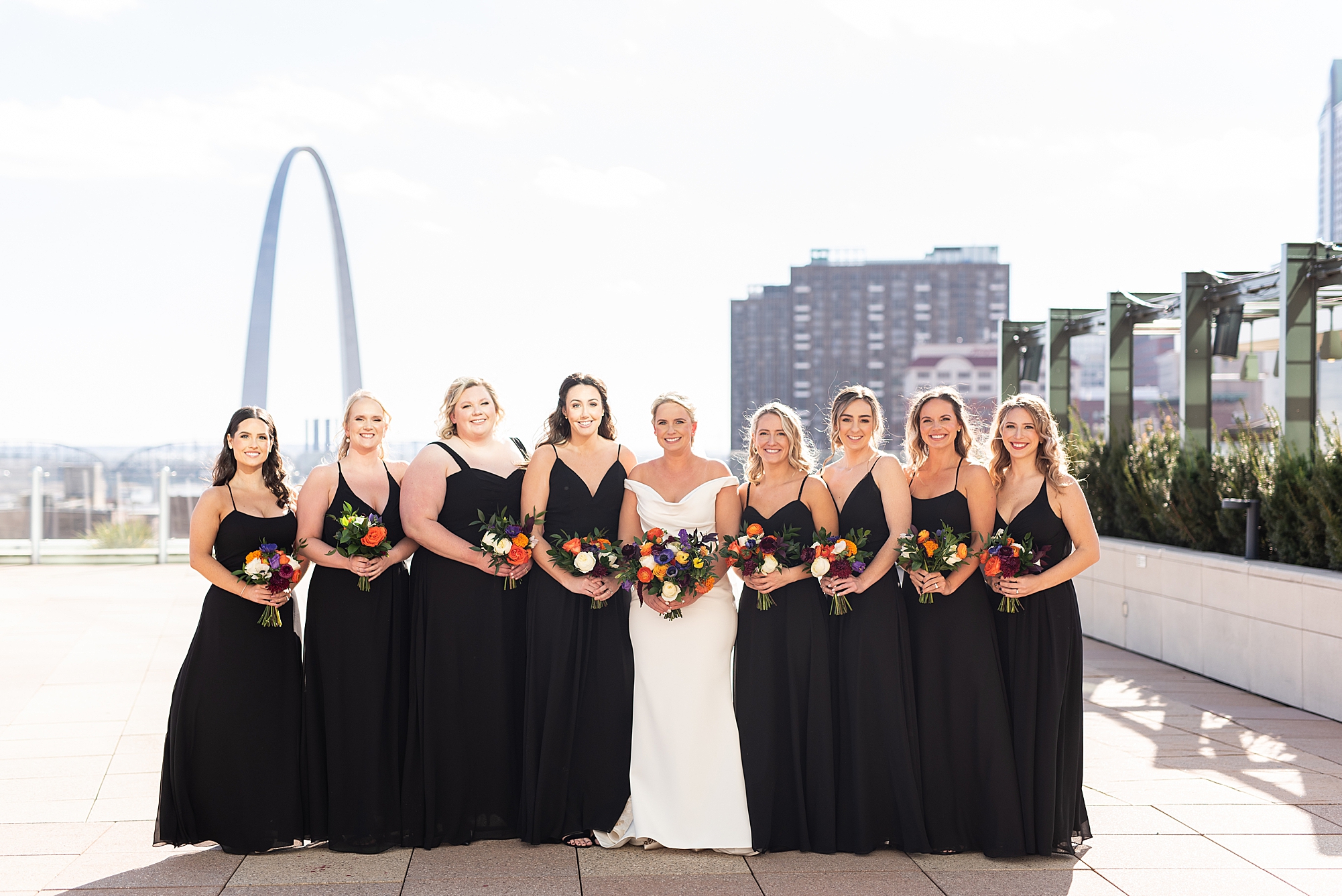 Sami and Matt have a huge love for the city of St. Louis so it was the perfect setting for their wedding day. They both got ready at the gorgeous Four Seasons Hotel, then shared a first look on the rooftop with the perfect view of the arch. They read adorable letters to each other reminiscing on their years together so far and anticipating their future together. Then we loaded up their bridal bridal party and traveled around the city for a bit hitting a few of their favorite spots like the old courthouse, Busch Stadium and the Arch Park. Their bridal party was so much fun and full of celebration!