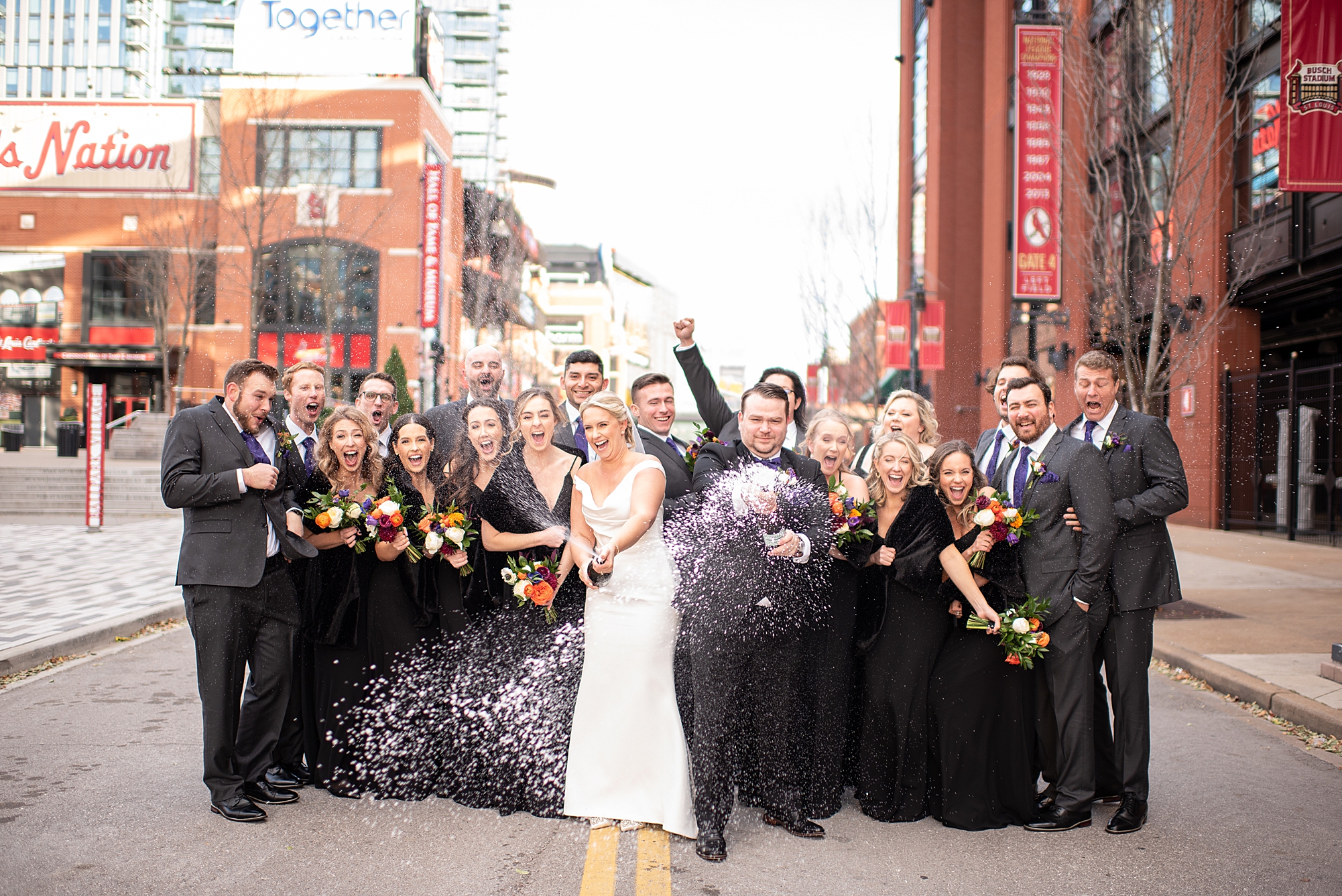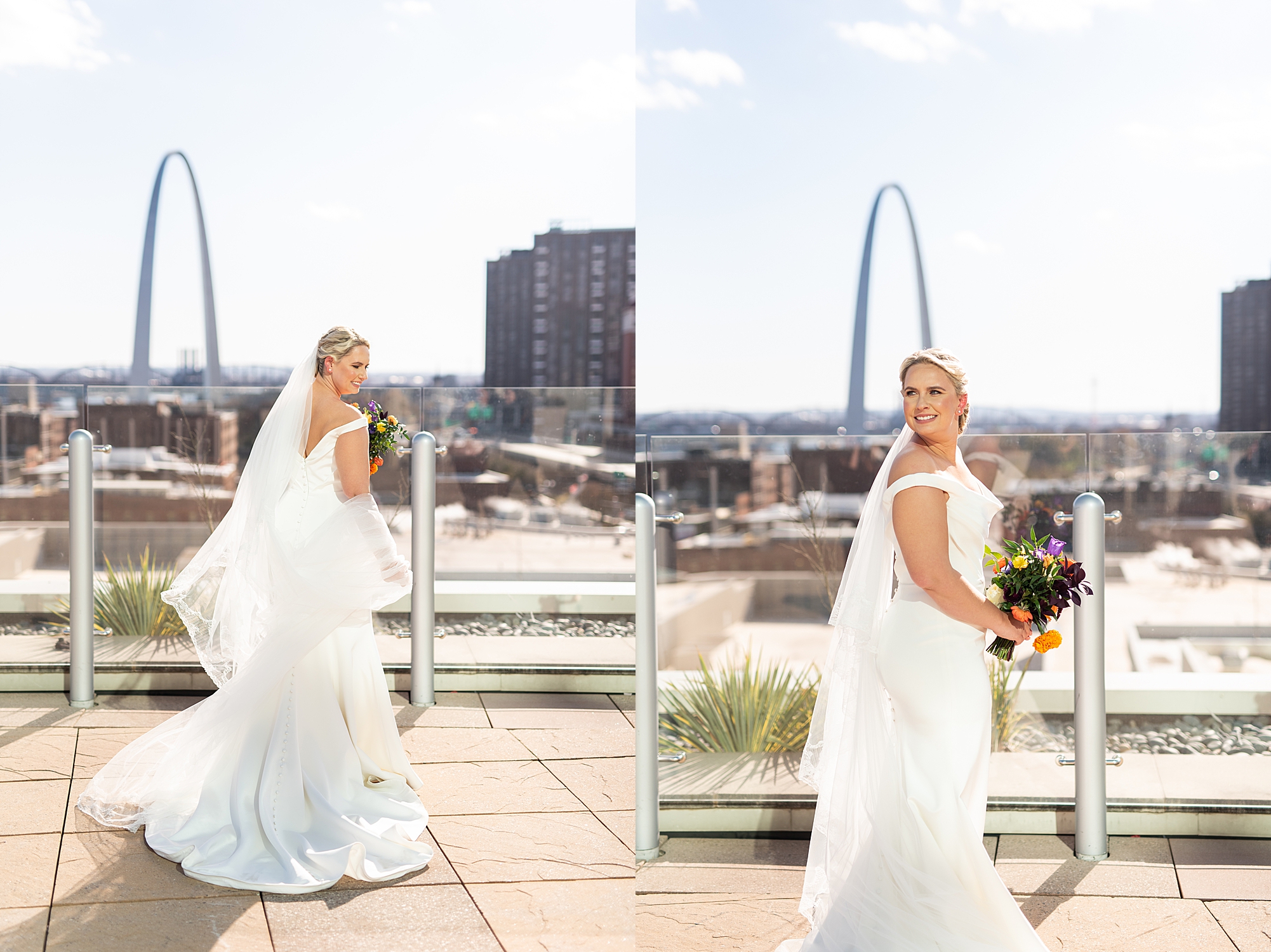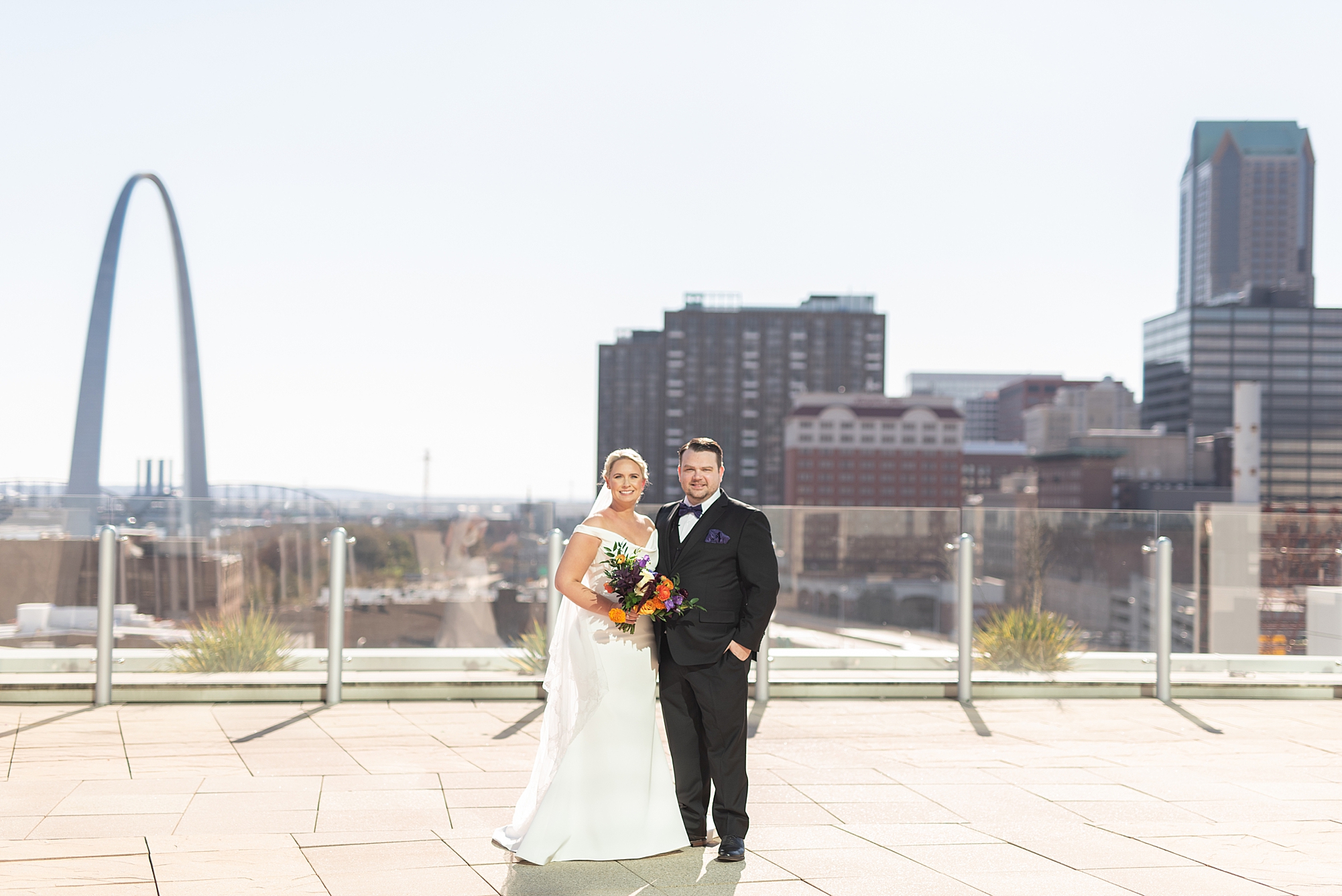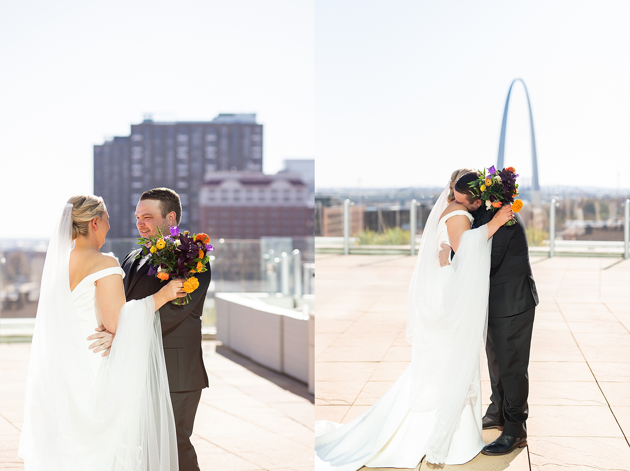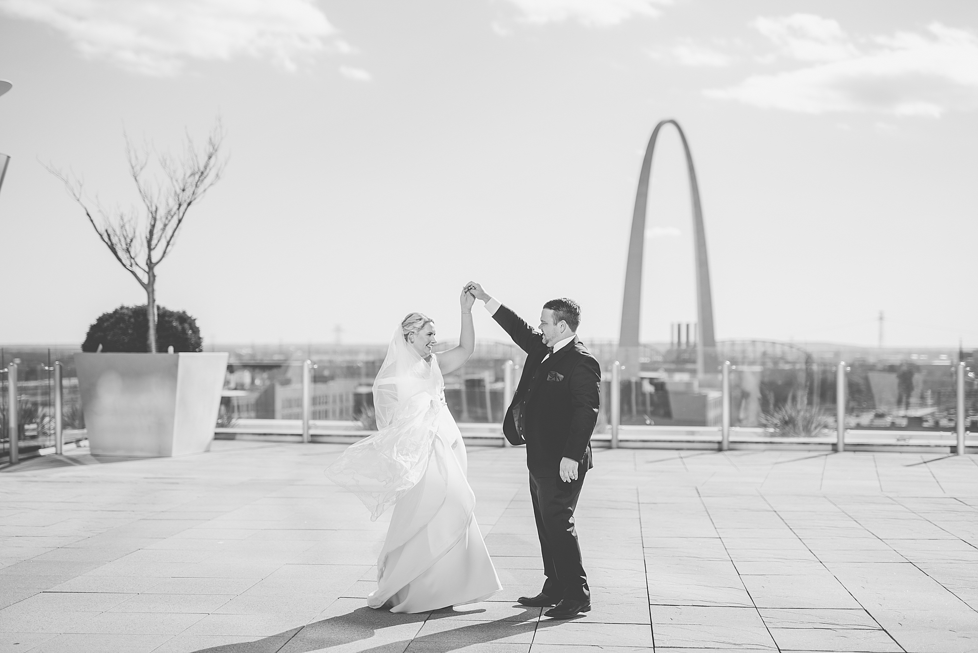 Sami and Matt have a huge love for the city of St. Louis so it was the perfect setting for their wedding day. They both got ready at the gorgeous Four Seasons Hotel, then shared a first look on the rooftop with the perfect view of the arch. They read adorable letters to each other reminiscing on their years together so far and anticipating their future together. Then we loaded up their bridal bridal party and traveled around the city for a bit hitting a few of their favorite spots like the old courthouse, Busch Stadium and the Arch Park. Their bridal party was so much fun and full of celebration!