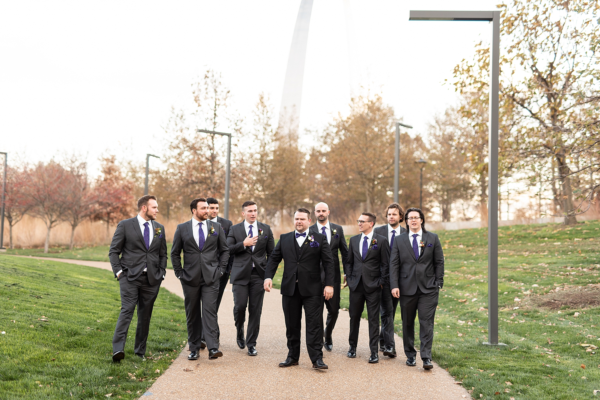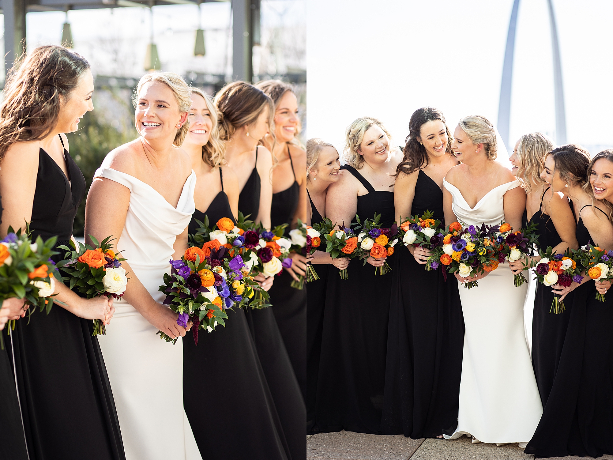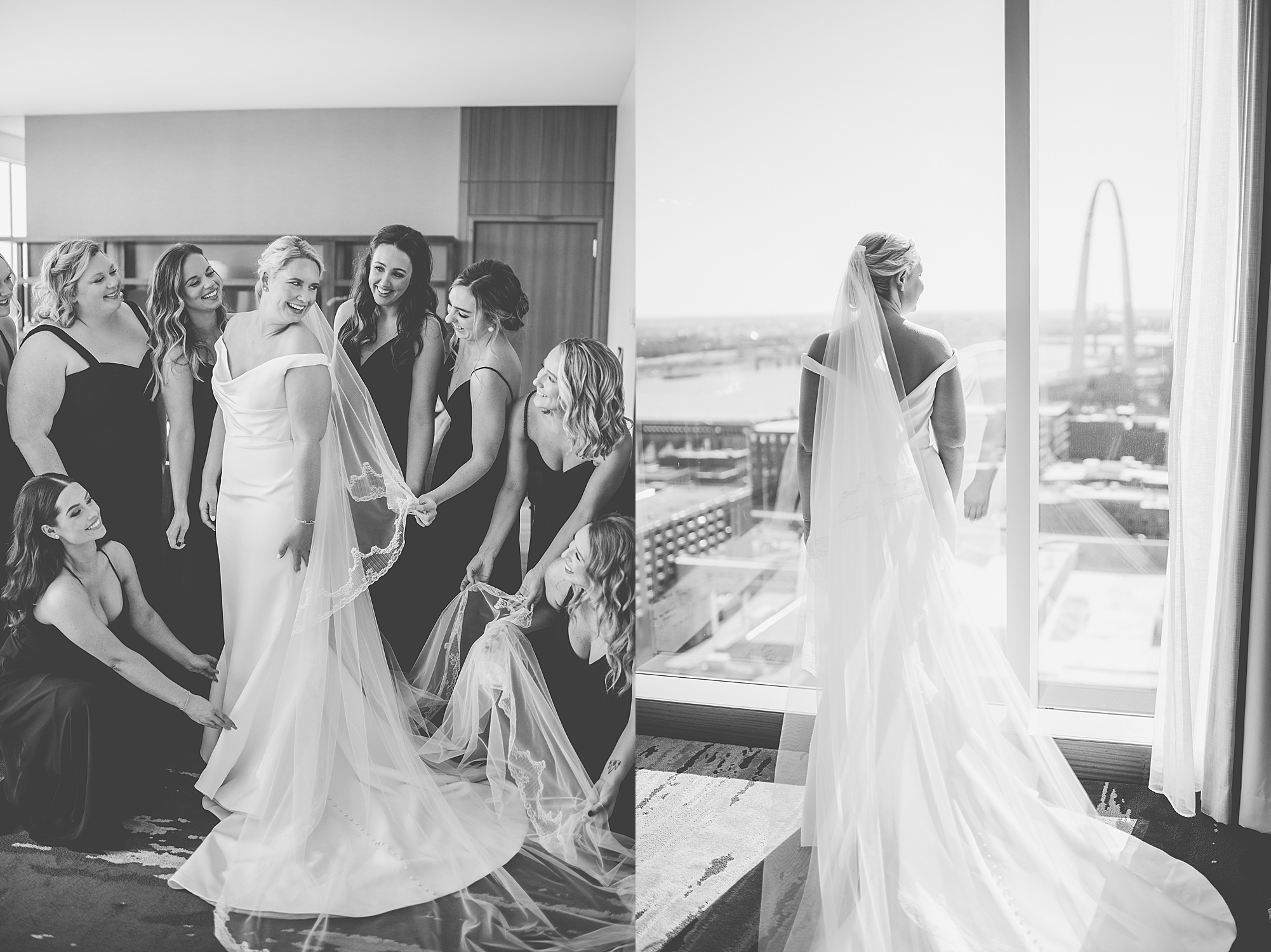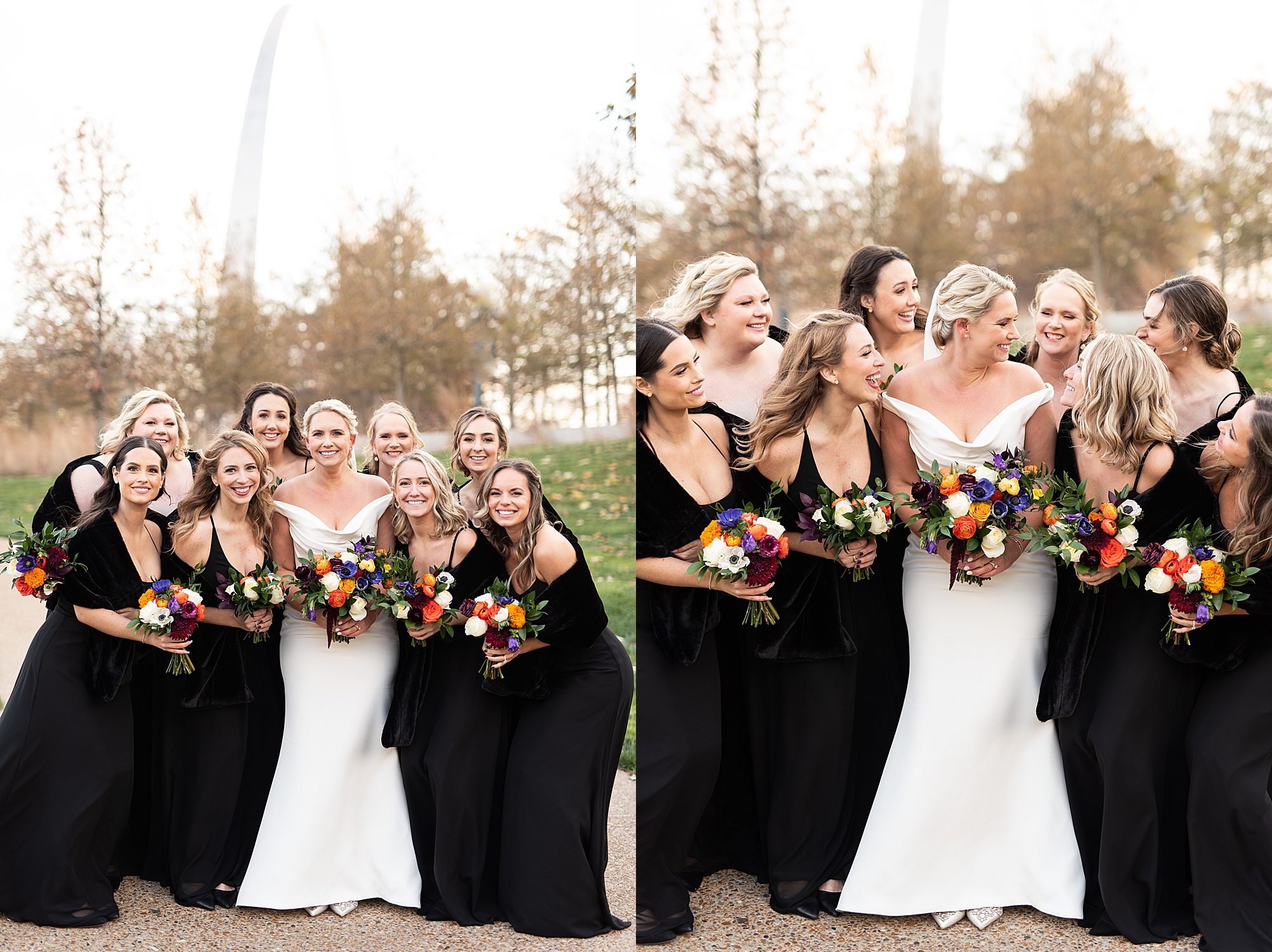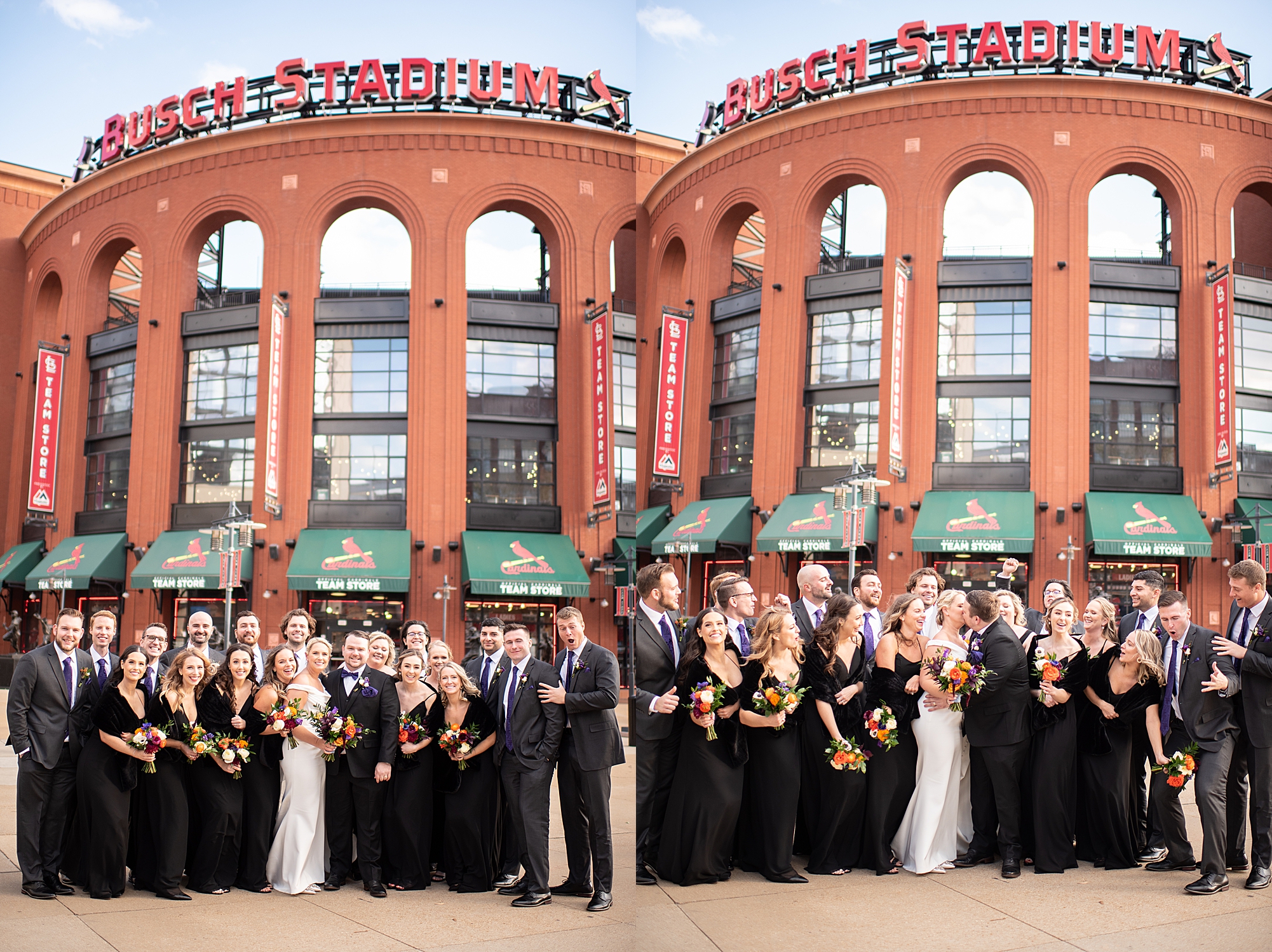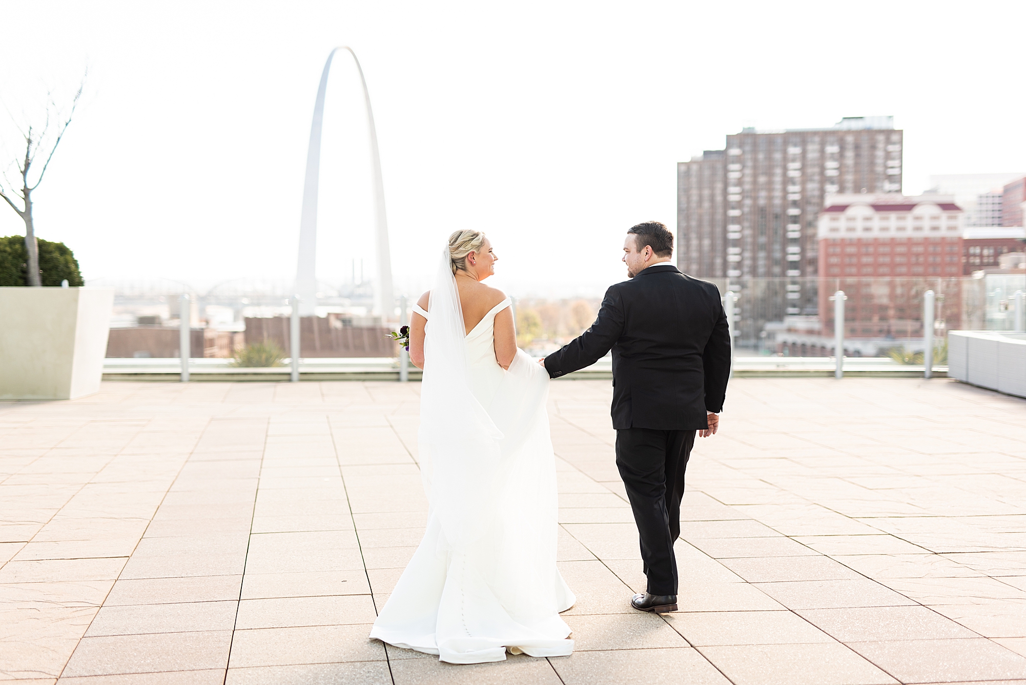 Sami and Matt have a huge love for the city of St. Louis so it was the perfect setting for their wedding day. They both got ready at the gorgeous Four Seasons Hotel, then shared a first look on the rooftop with the perfect view of the arch. They read adorable letters to each other reminiscing on their years together so far and anticipating their future together. Then we loaded up their bridal bridal party and traveled around the city for a bit hitting a few of their favorite spots like the old courthouse, Busch Stadium and the Arch Park. Their bridal party was so much fun and full of celebration!