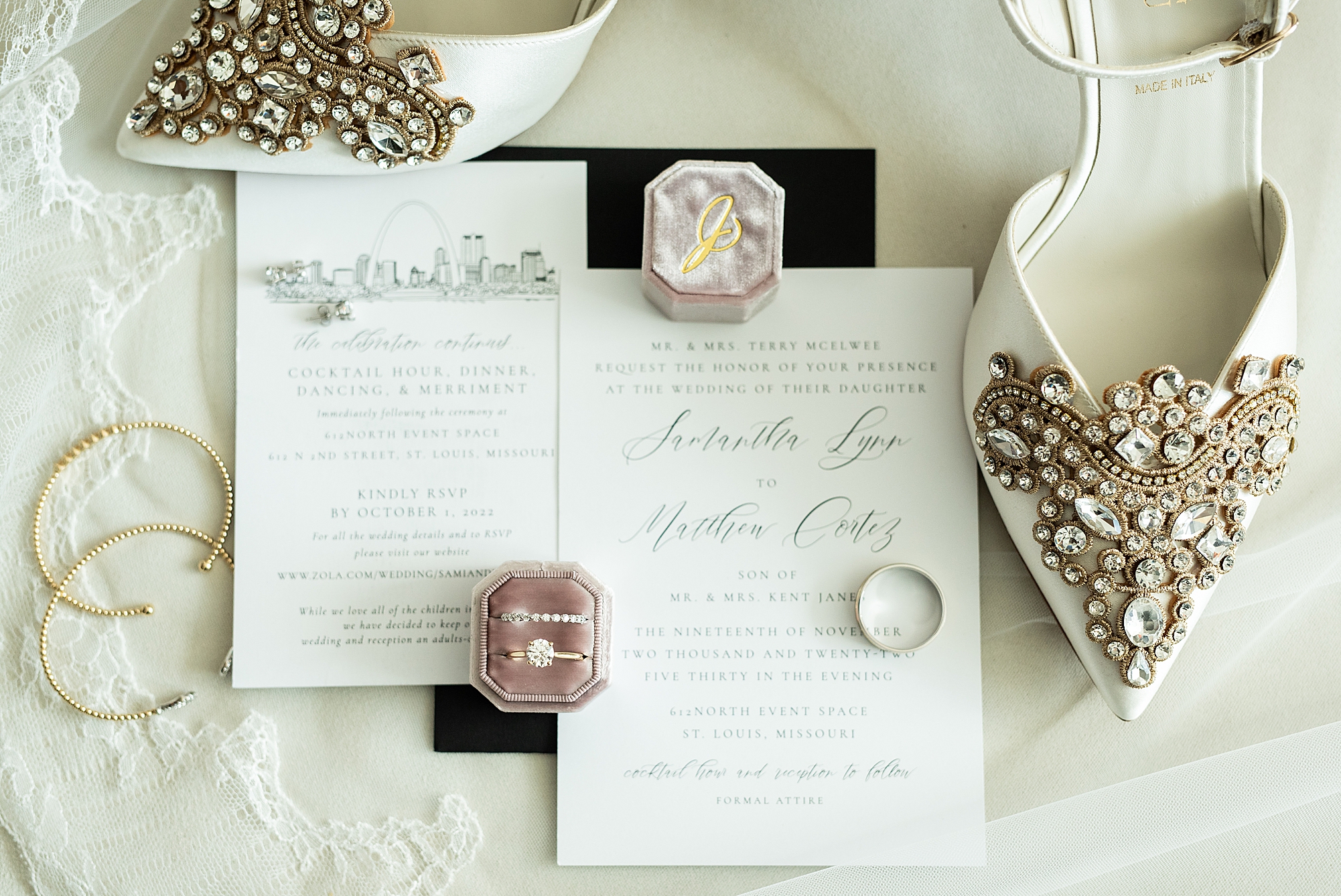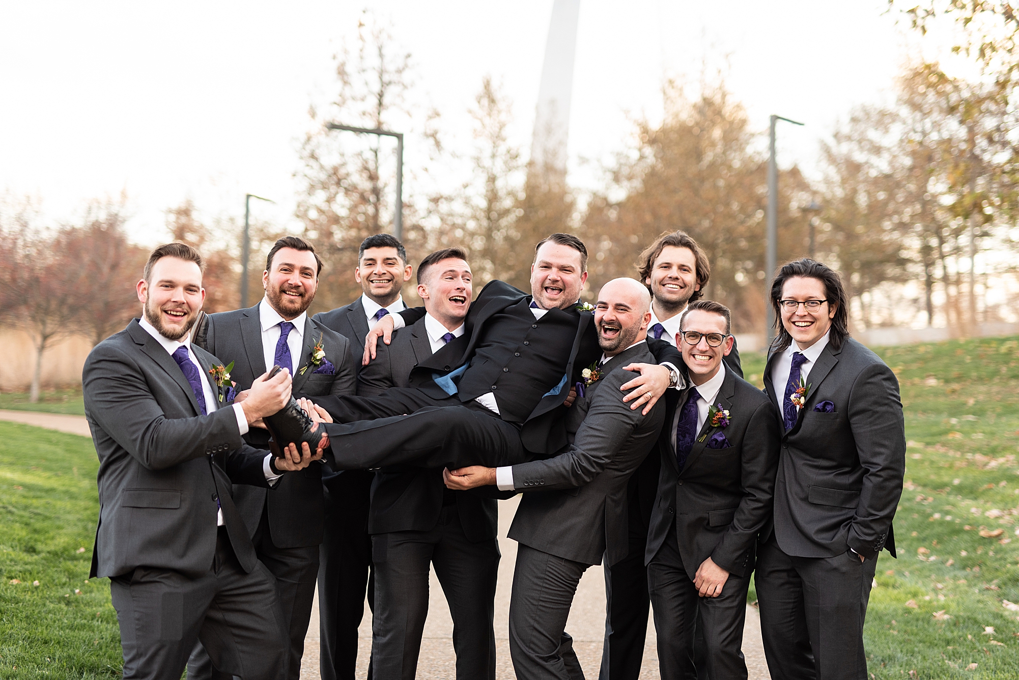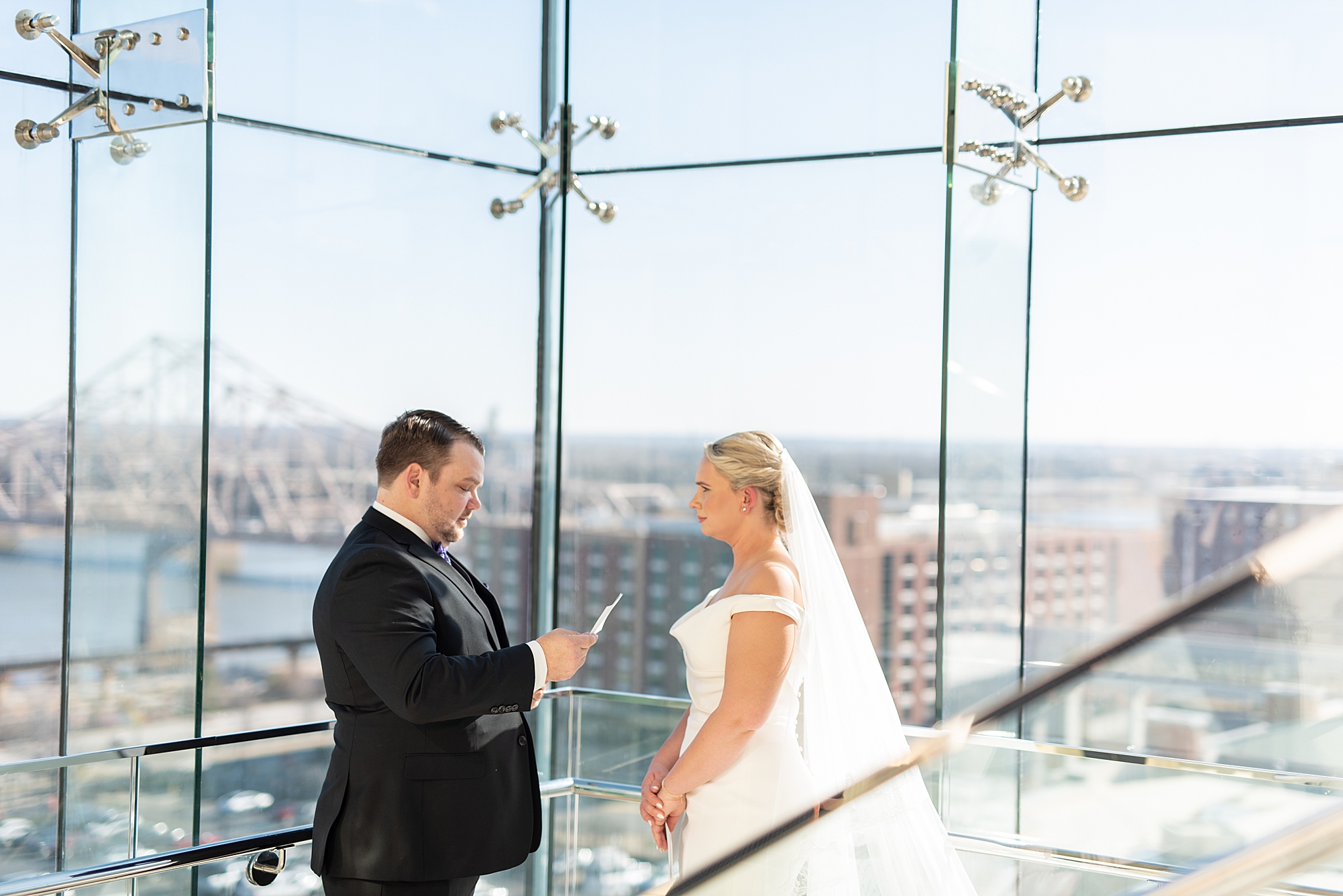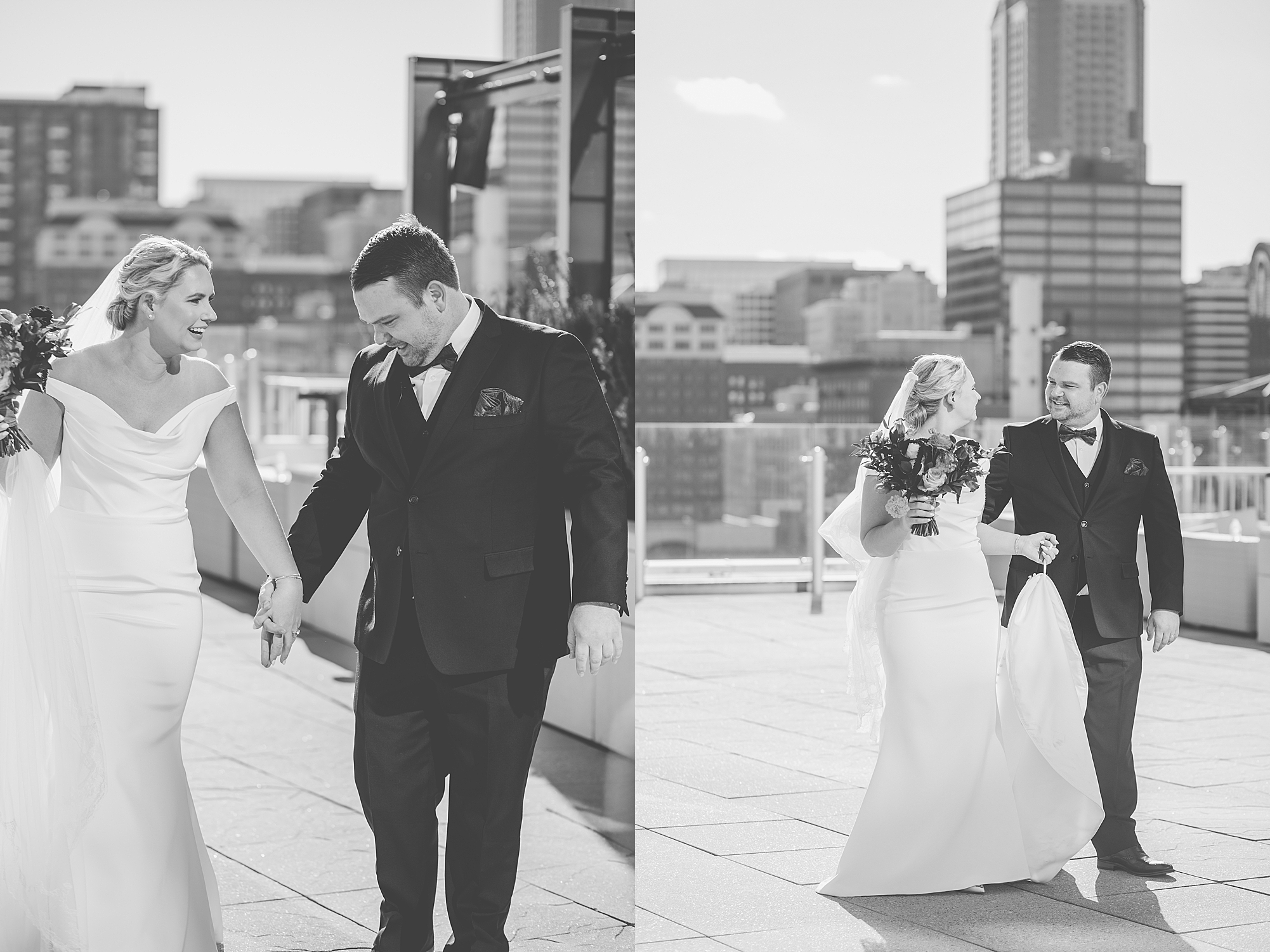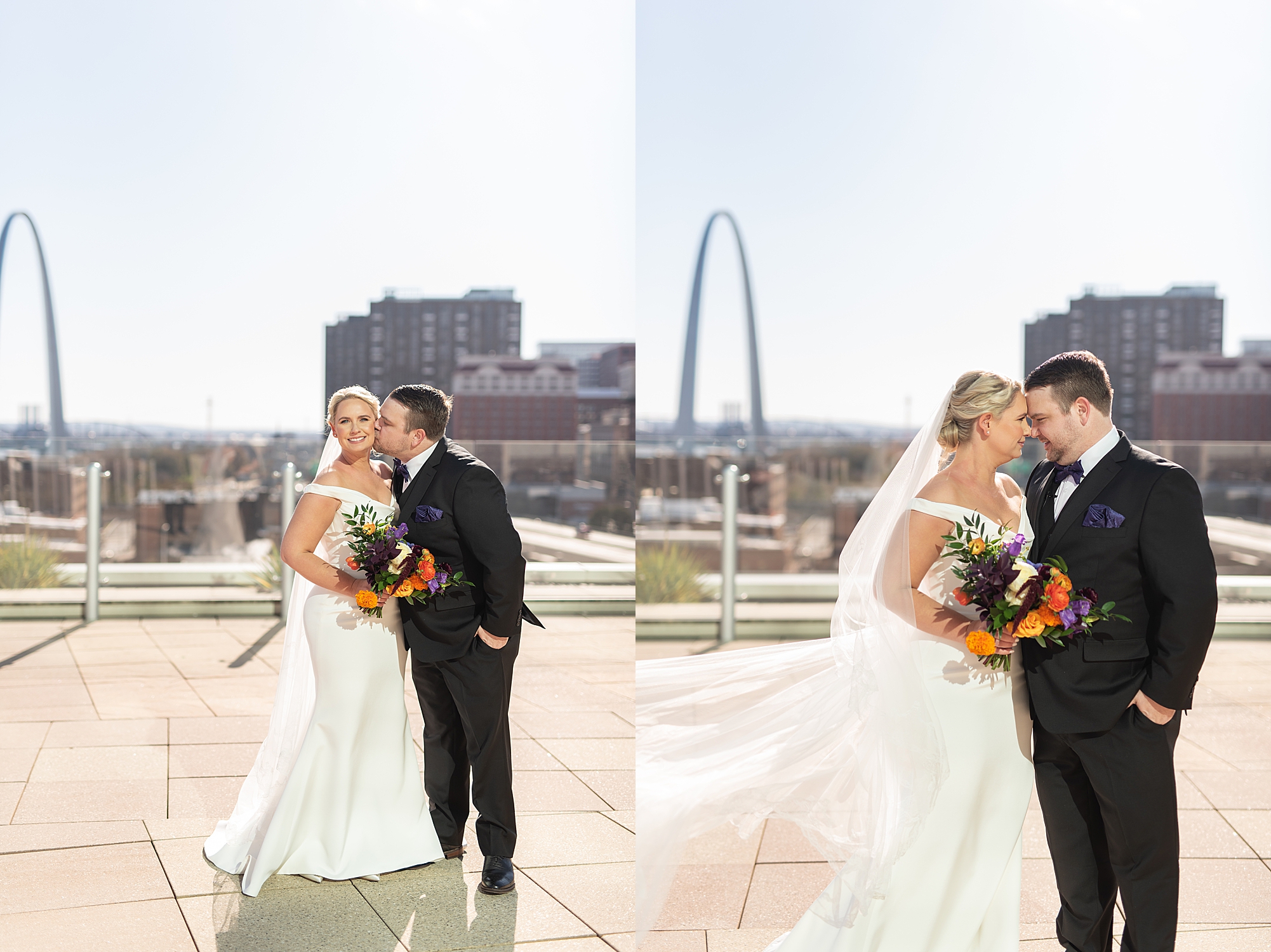Sami and Matt have a huge love for the city of St. Louis so it was the perfect setting for their wedding day. They both got ready at the gorgeous Four Seasons Hotel, then shared a first look on the rooftop with the perfect view of the arch. They read adorable letters to each other reminiscing on their years together so far and anticipating their future together. Then we loaded up their bridal bridal party and traveled around the city for a bit hitting a few of their favorite spots like the old courthouse, Busch Stadium and the Arch Park. Their bridal party was so much fun and full of celebration!