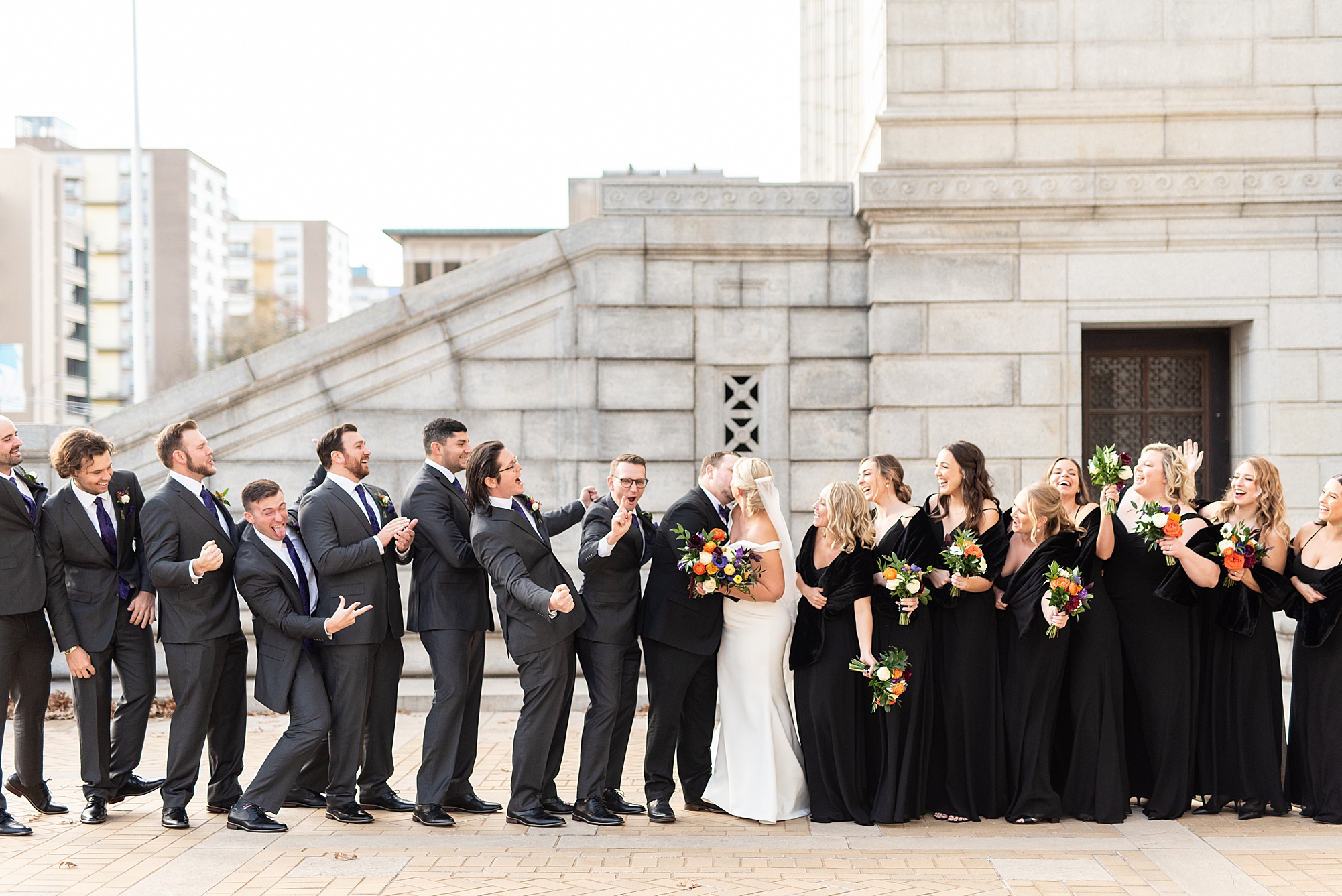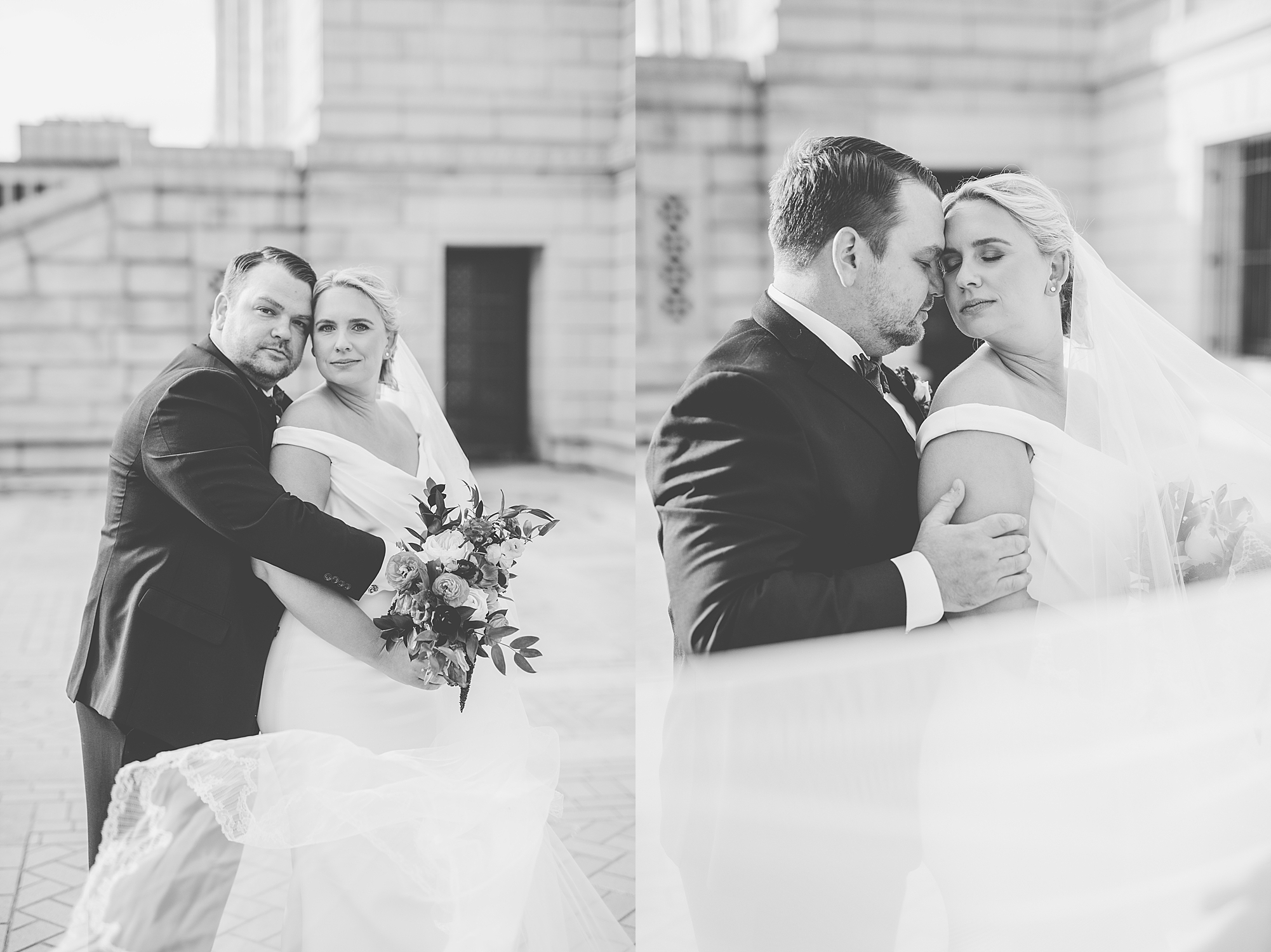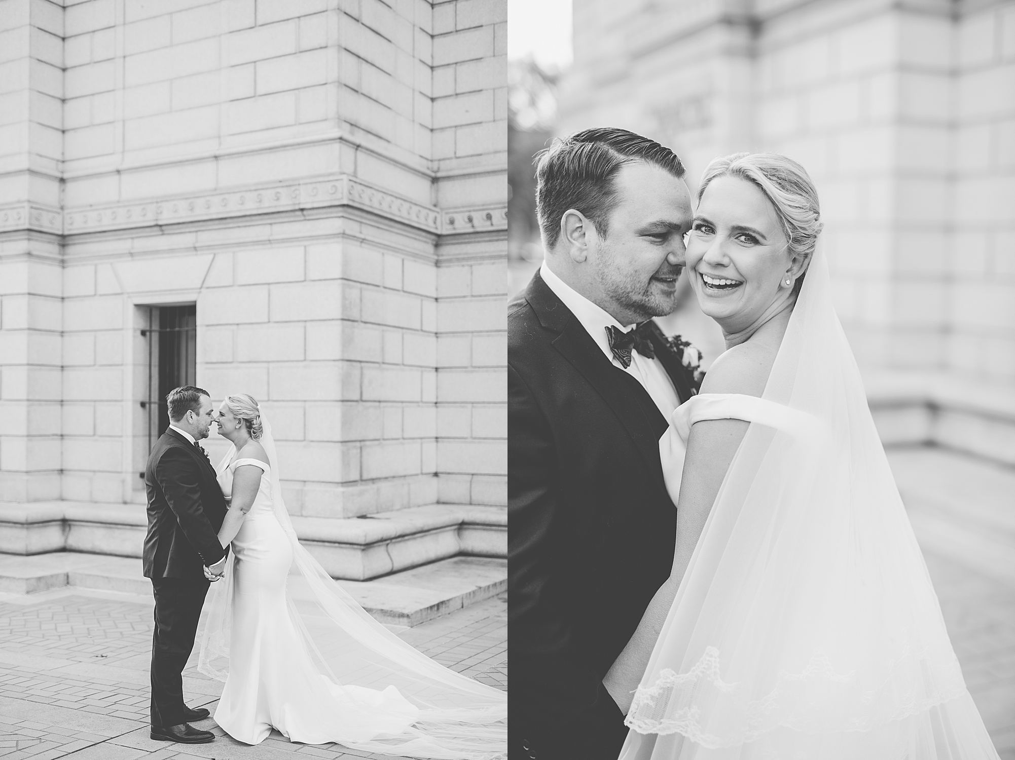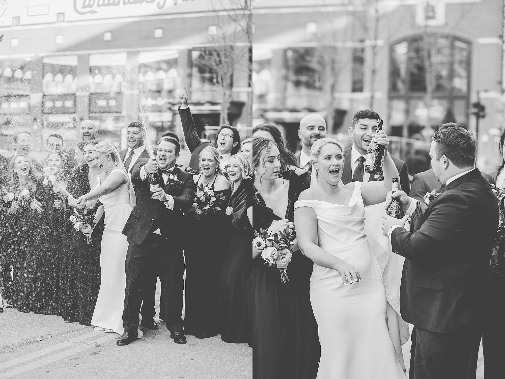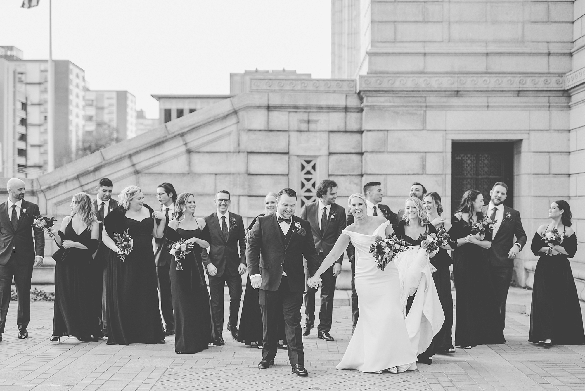 Sami and Matt have a huge love for the city of St. Louis so it was the perfect setting for their wedding day. They both got ready at the gorgeous Four Seasons Hotel, then shared a first look on the rooftop with the perfect view of the arch. They read adorable letters to each other reminiscing on their years together so far and anticipating their future together. Then we loaded up their bridal bridal party and traveled around the city for a bit hitting a few of their favorite spots like the old courthouse, Busch Stadium and the Arch Park. Their bridal party was so much fun and full of celebration!