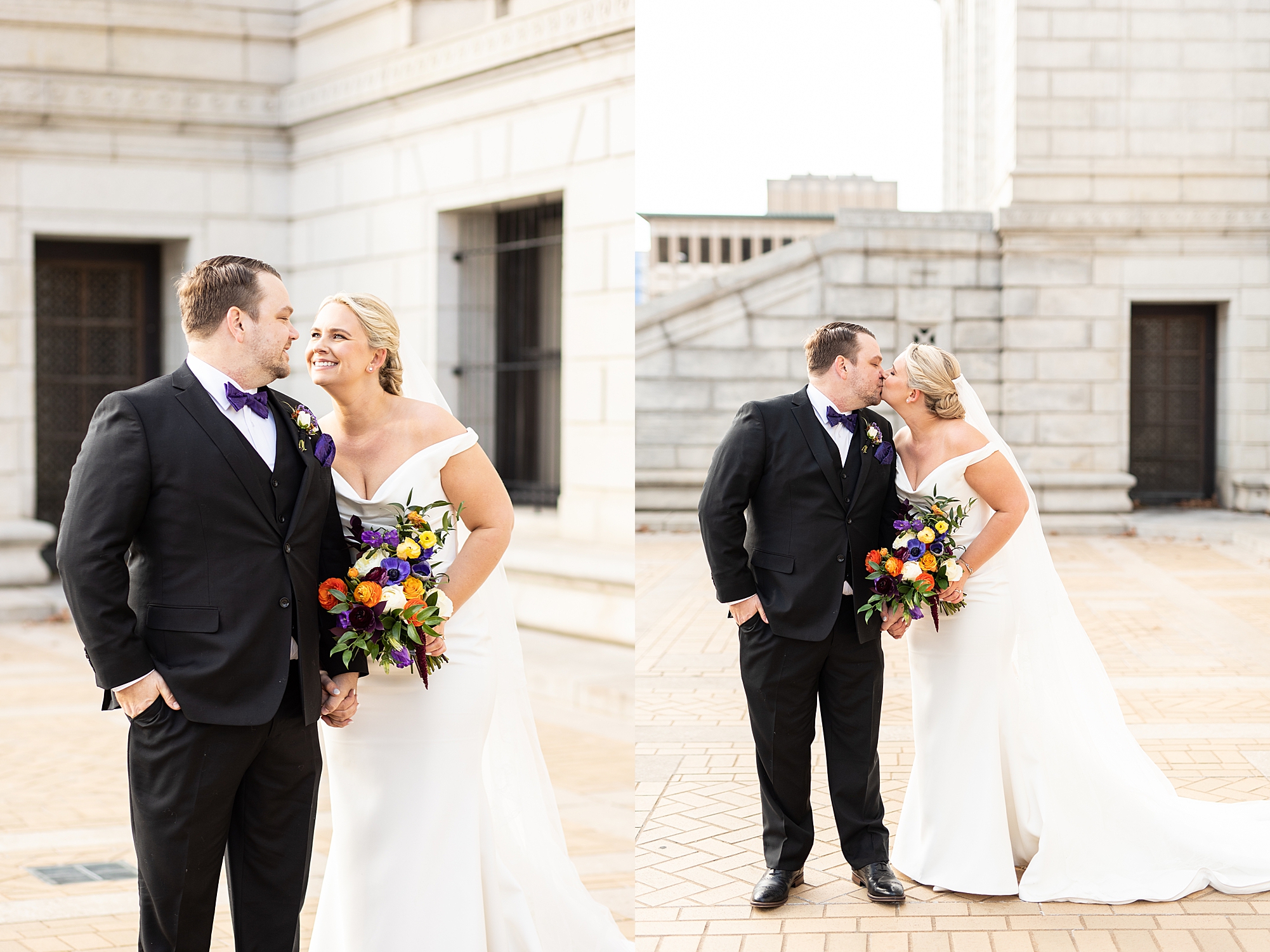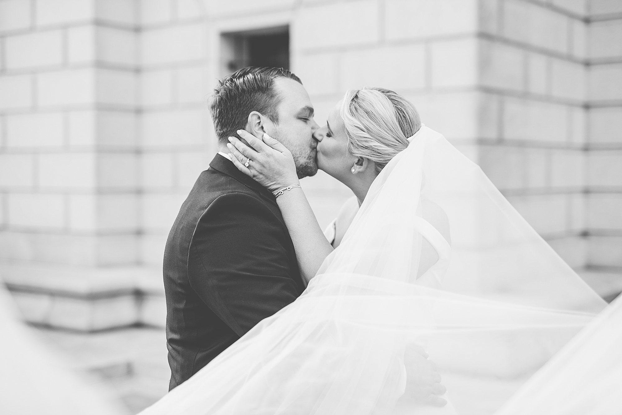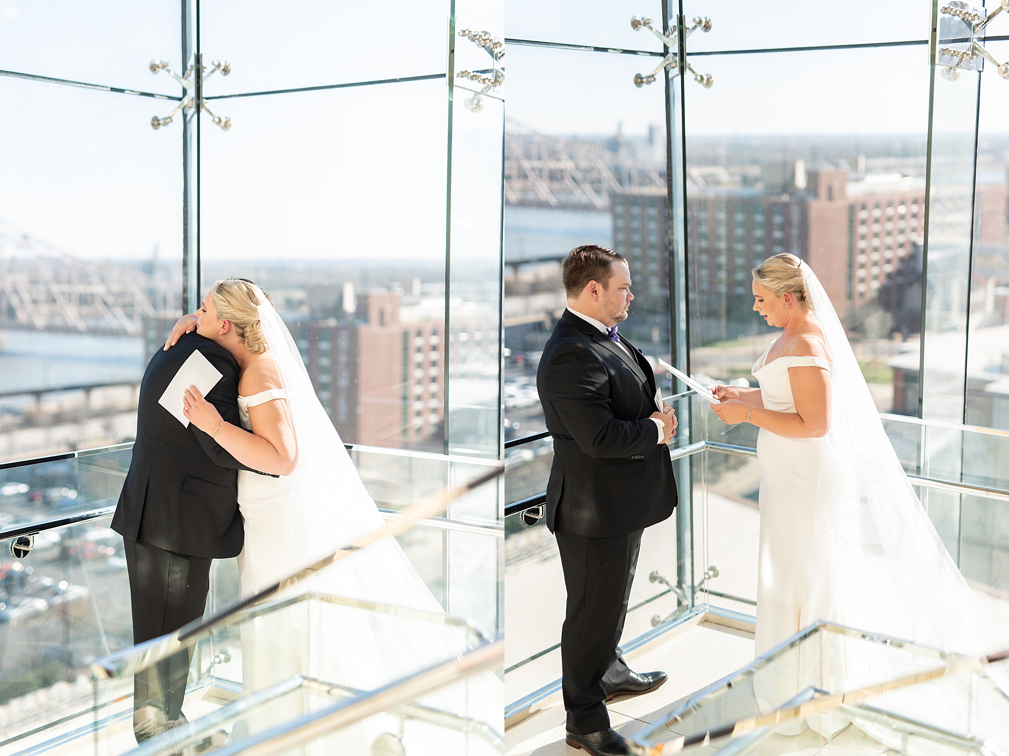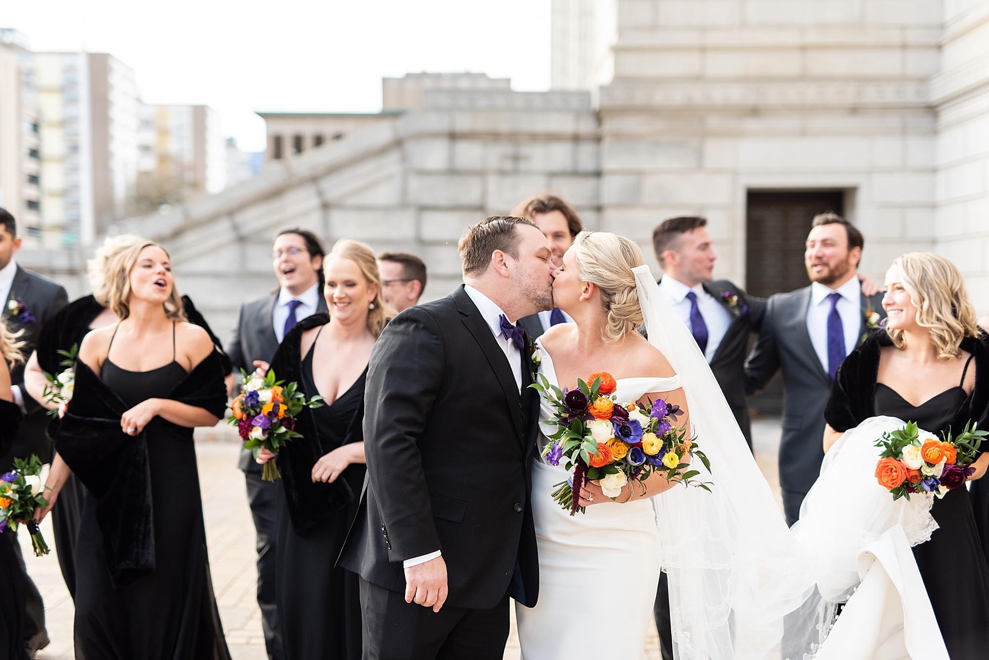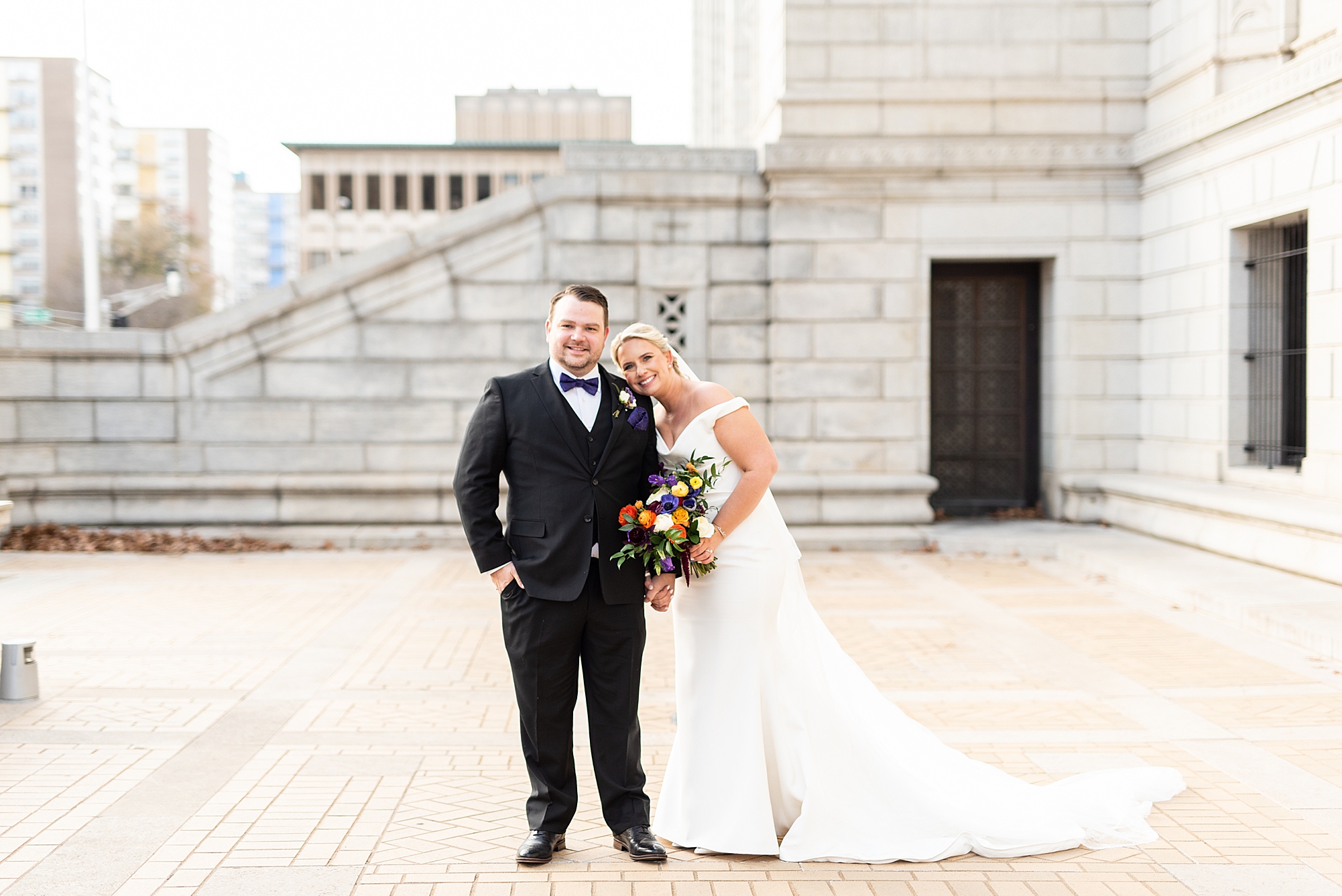 Sami and Matt have a huge love for the city of St. Louis so it was the perfect setting for their wedding day. They both got ready at the gorgeous Four Seasons Hotel, then shared a first look on the rooftop with the perfect view of the arch. They read adorable letters to each other reminiscing on their years together so far and anticipating their future together. Then we loaded up their bridal bridal party and traveled around the city for a bit hitting a few of their favorite spots like the old courthouse, Busch Stadium and the Arch Park. Their bridal party was so much fun and full of celebration!