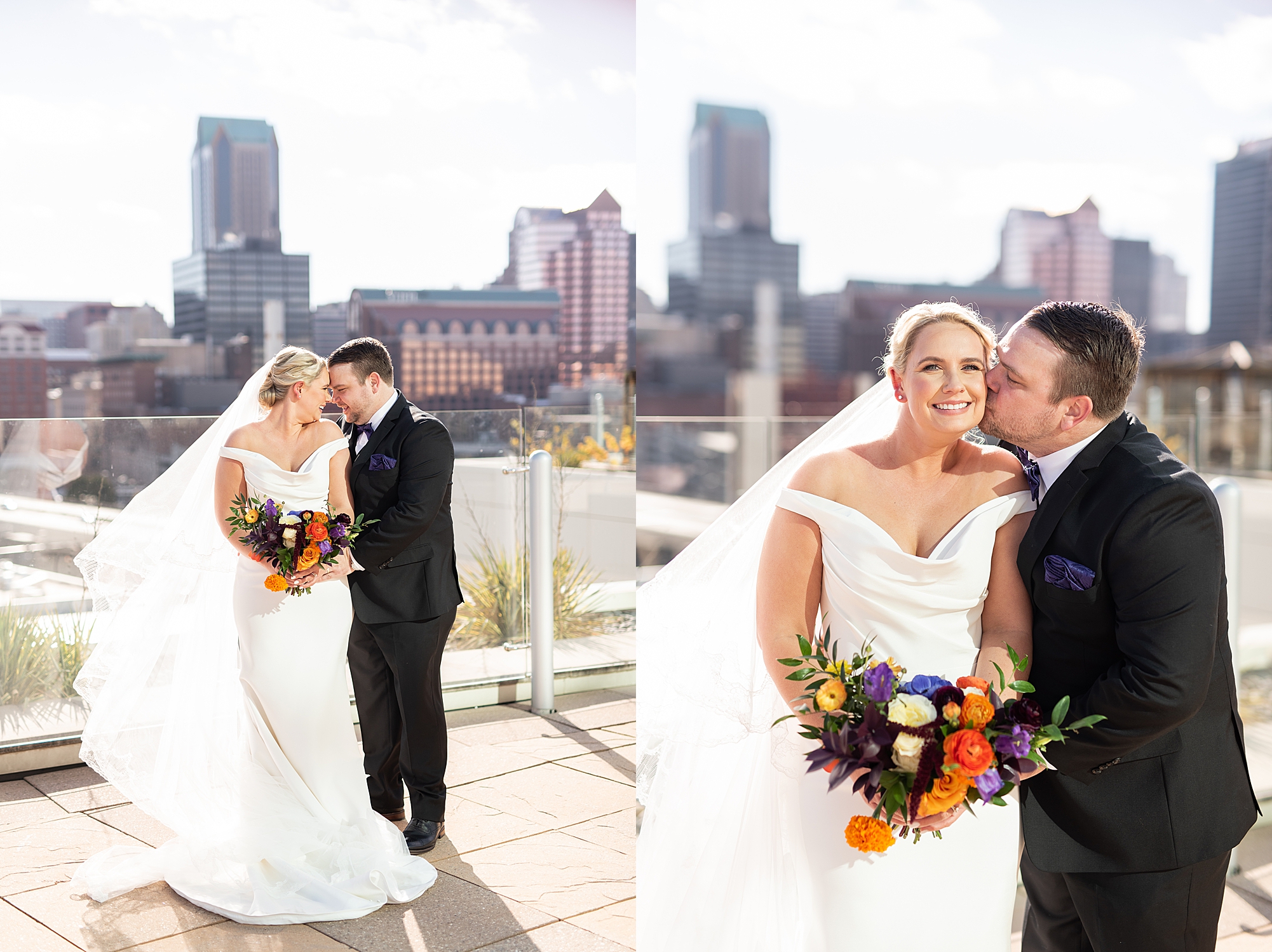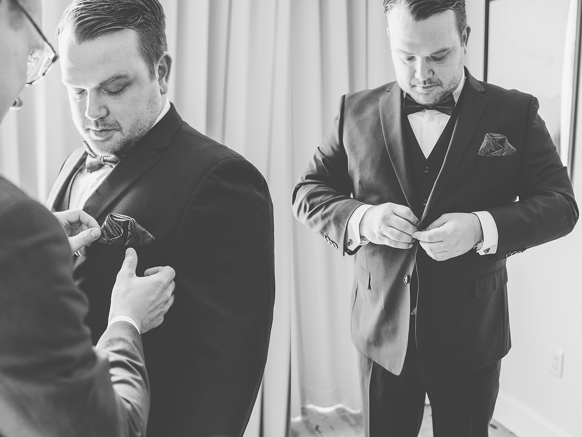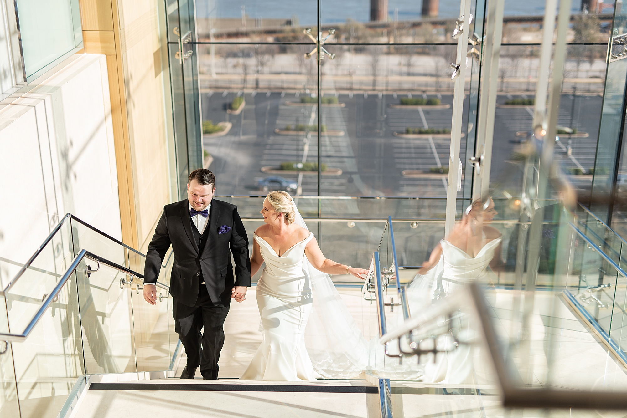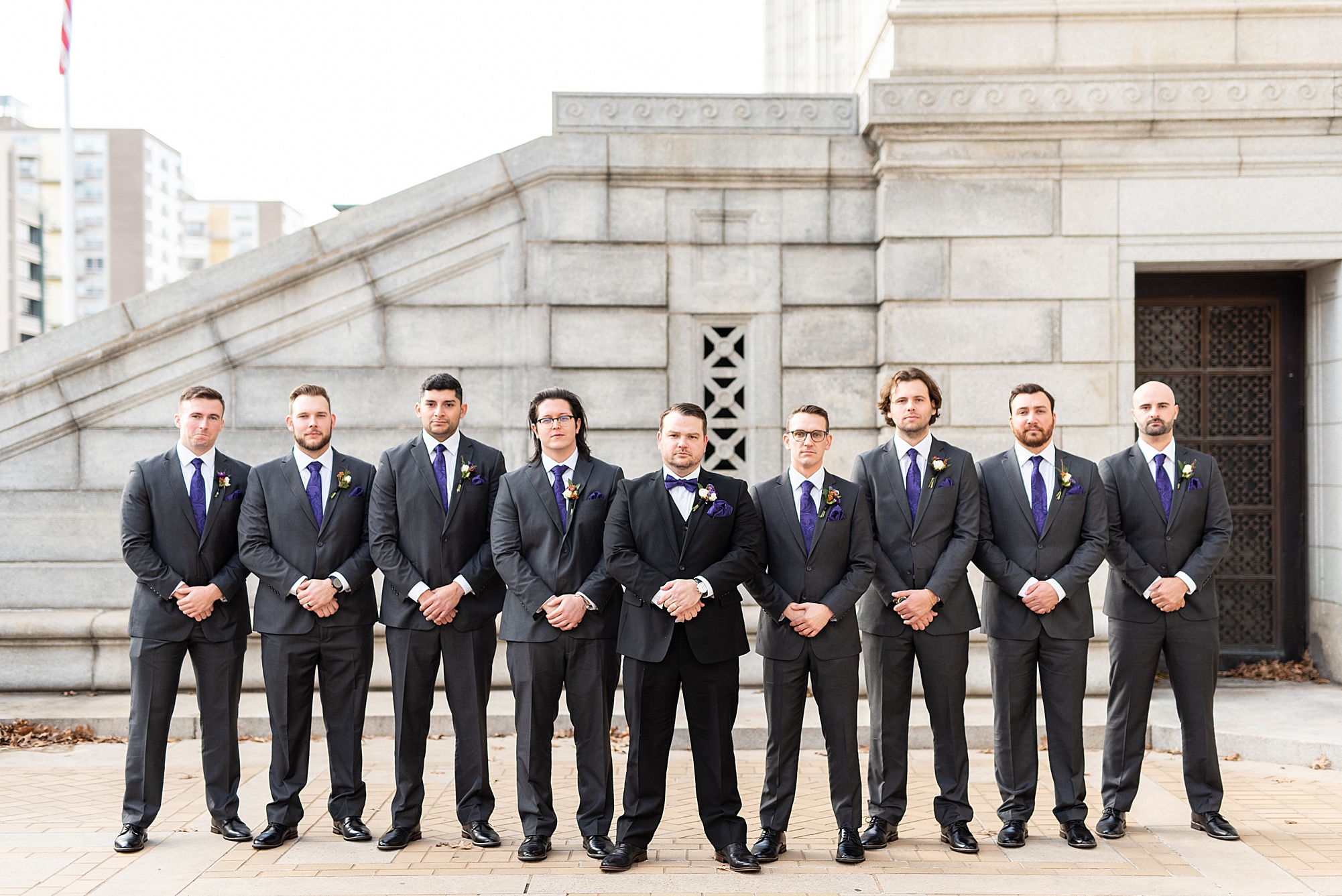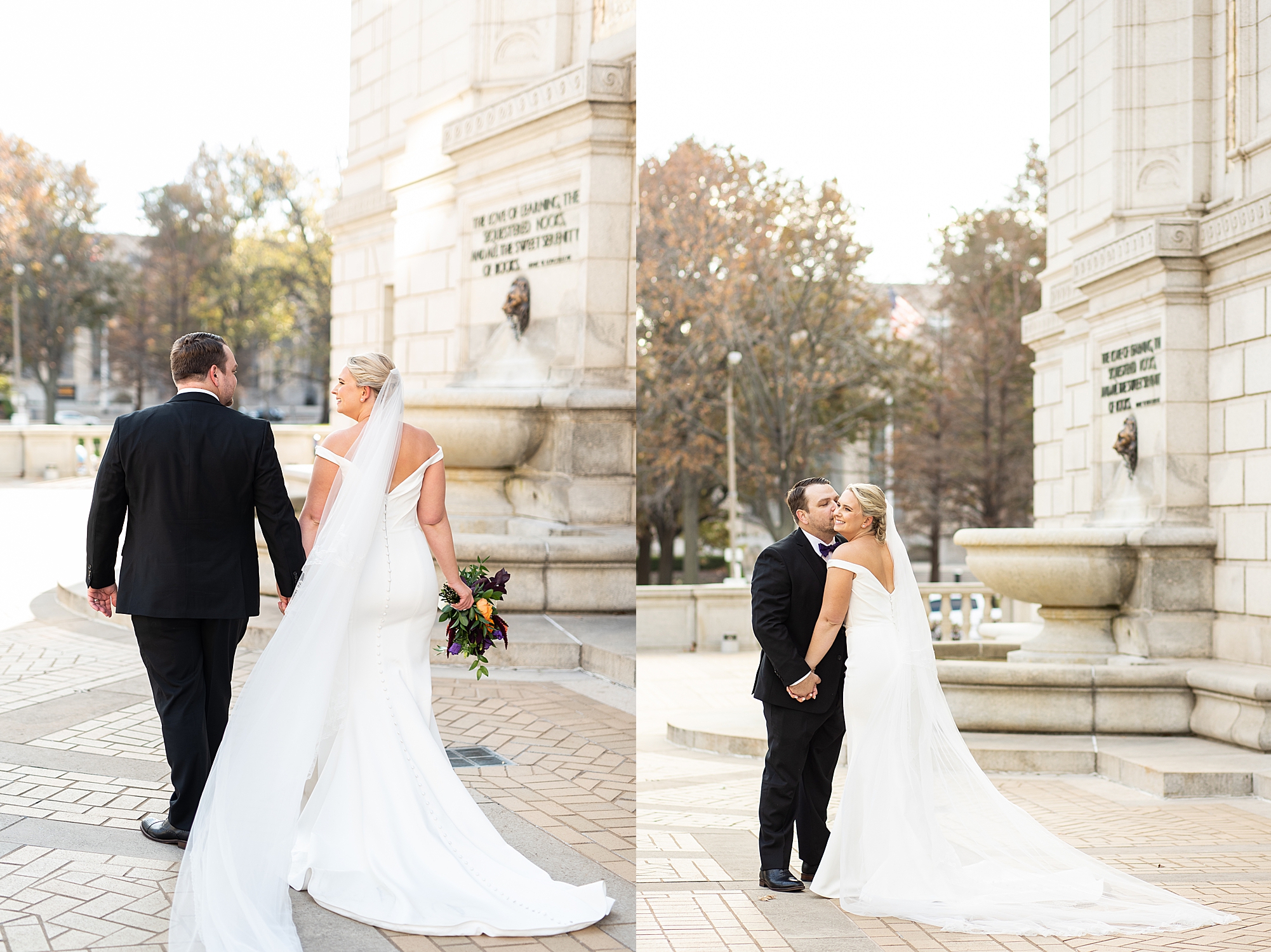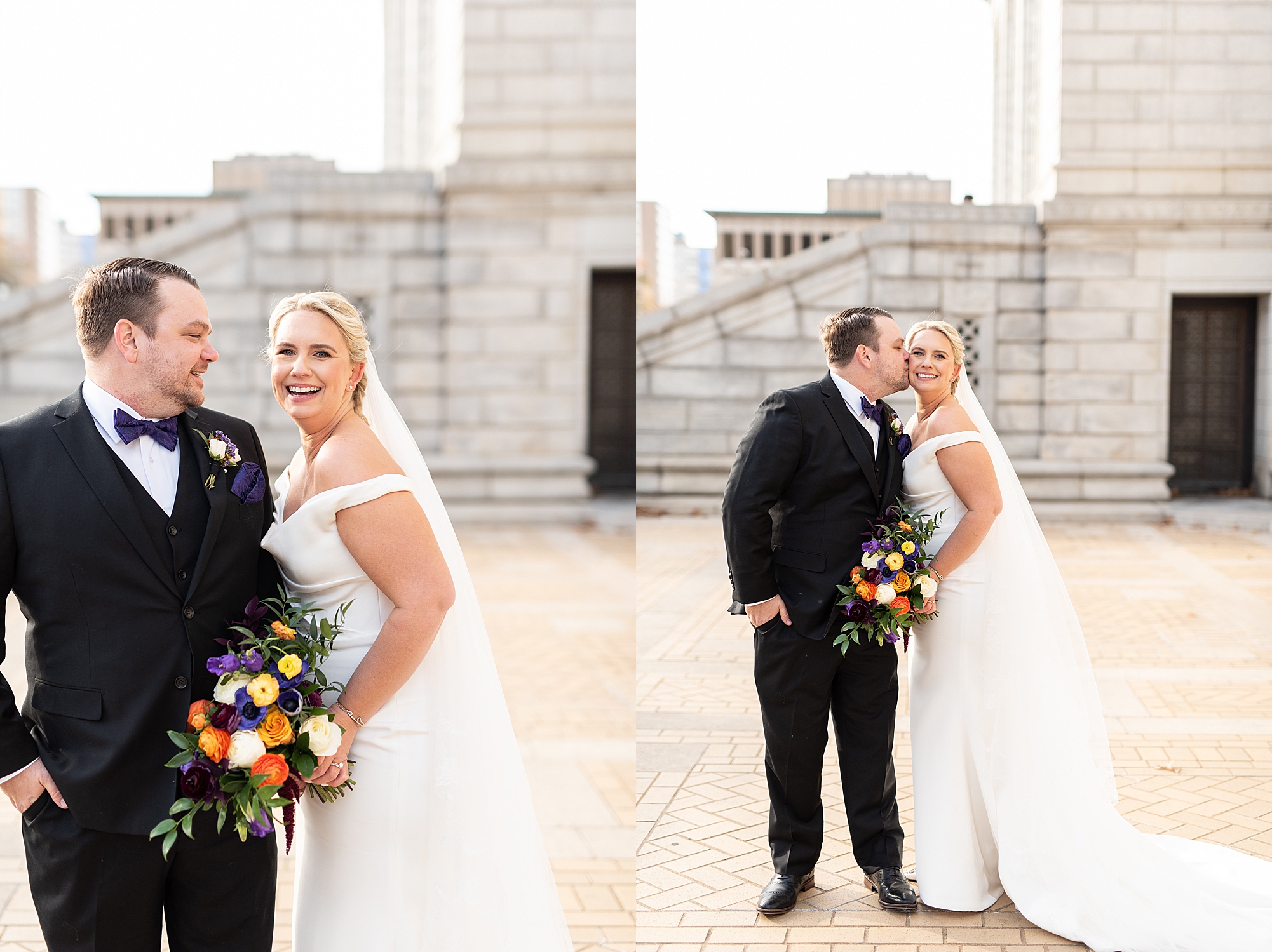 Sami and Matt have a huge love for the city of St. Louis so it was the perfect setting for their wedding day. They both got ready at the gorgeous Four Seasons Hotel, then shared a first look on the rooftop with the perfect view of the arch. They read adorable letters to each other reminiscing on their years together so far and anticipating their future together. Then we loaded up their bridal bridal party and traveled around the city for a bit hitting a few of their favorite spots like the old courthouse, Busch Stadium and the Arch Park. Their bridal party was so much fun and full of celebration!