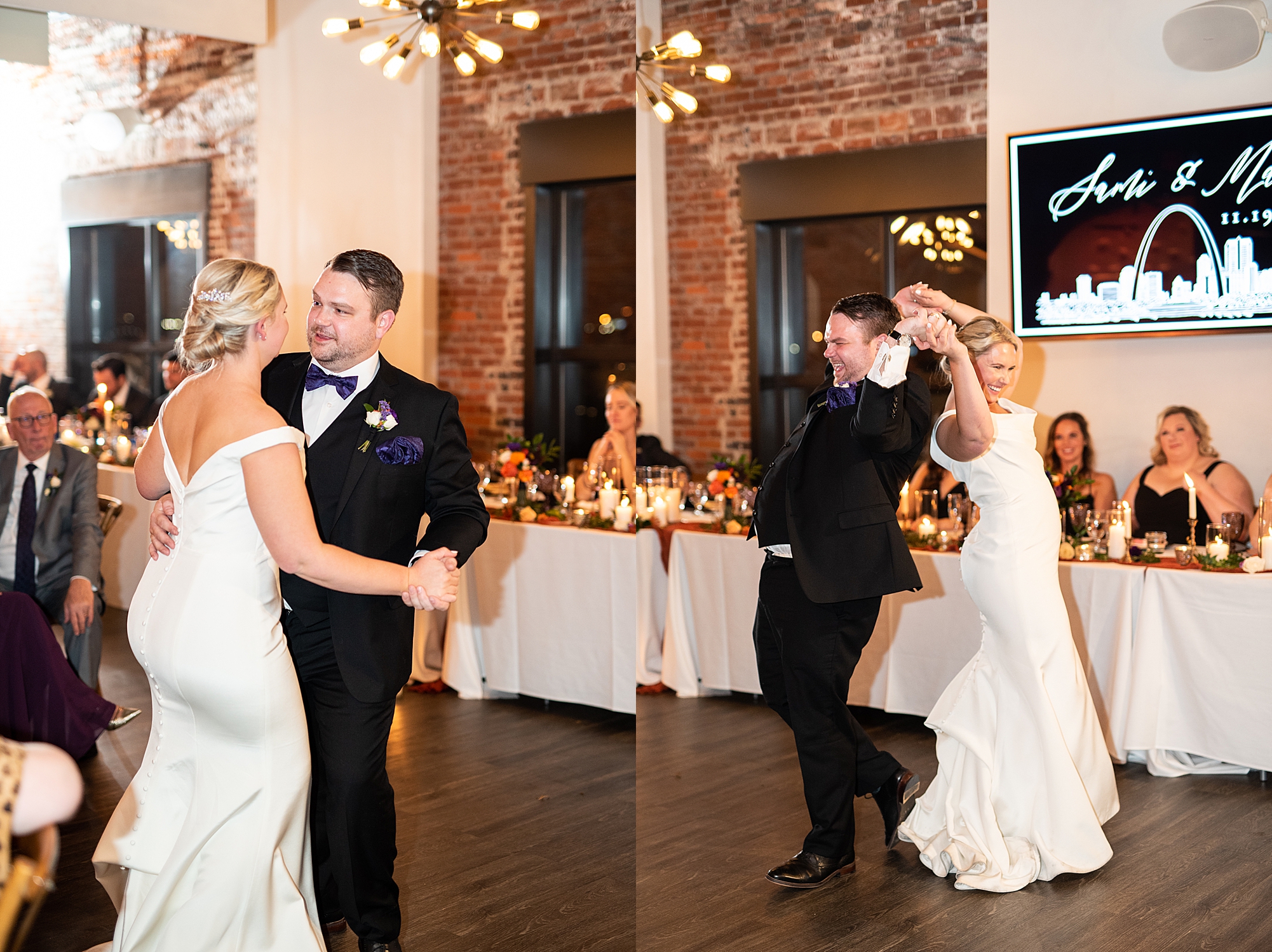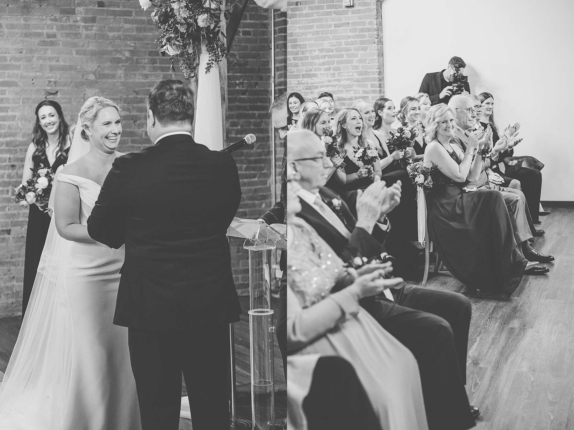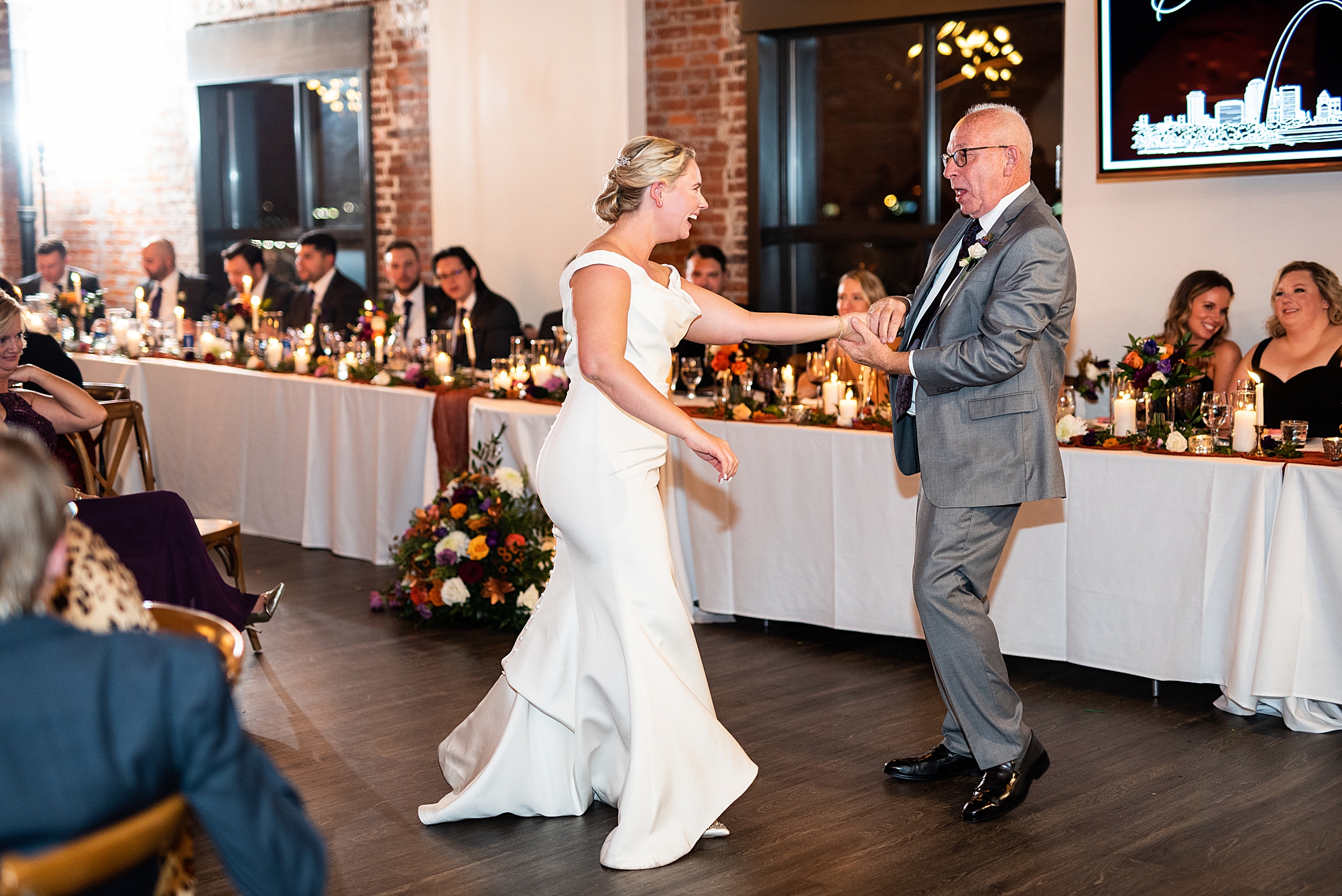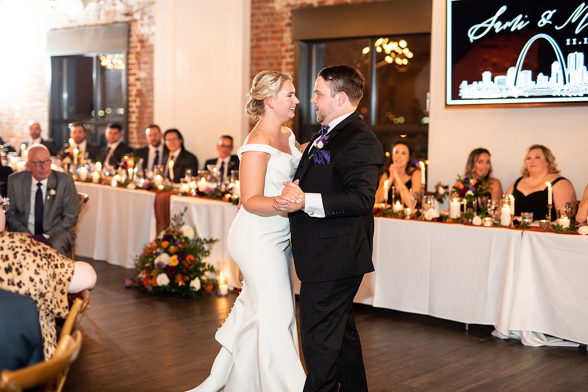 Our last stop was to 612 North, their gorgeous wedding venue on the St. Louis landing. The ceremony was so perfectly full of candle light and all of the people who love Sami and Matt. Matt had a huge smile of his face as Sami’s dad walked her down the aisle to give her away. Their family friend officiated a sweet ceremony and officially married them as Mr. and Mrs. Janes! They danced back down the aisle with huge smiles on their faces!