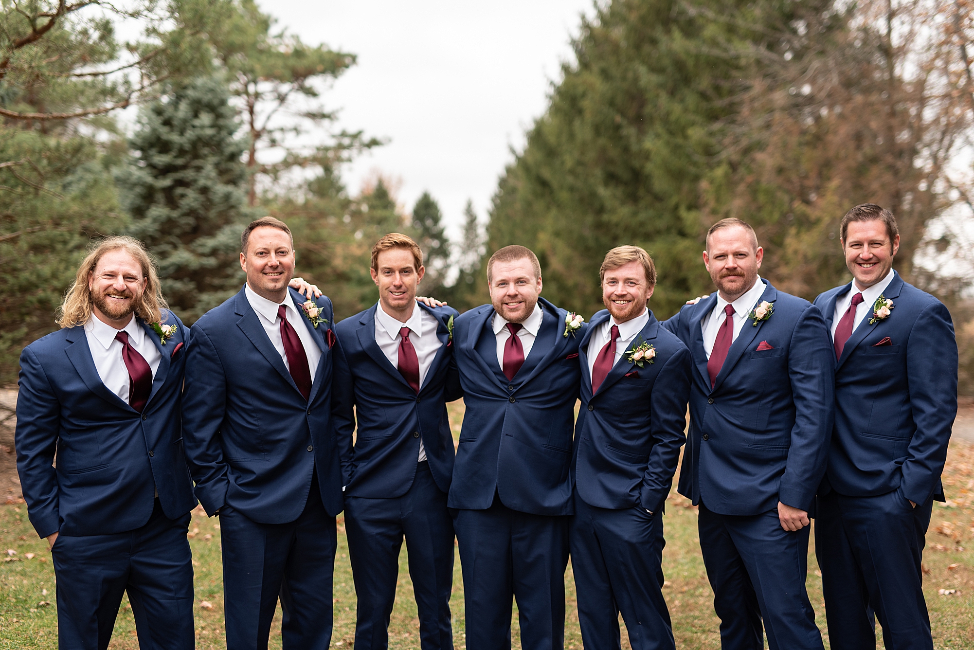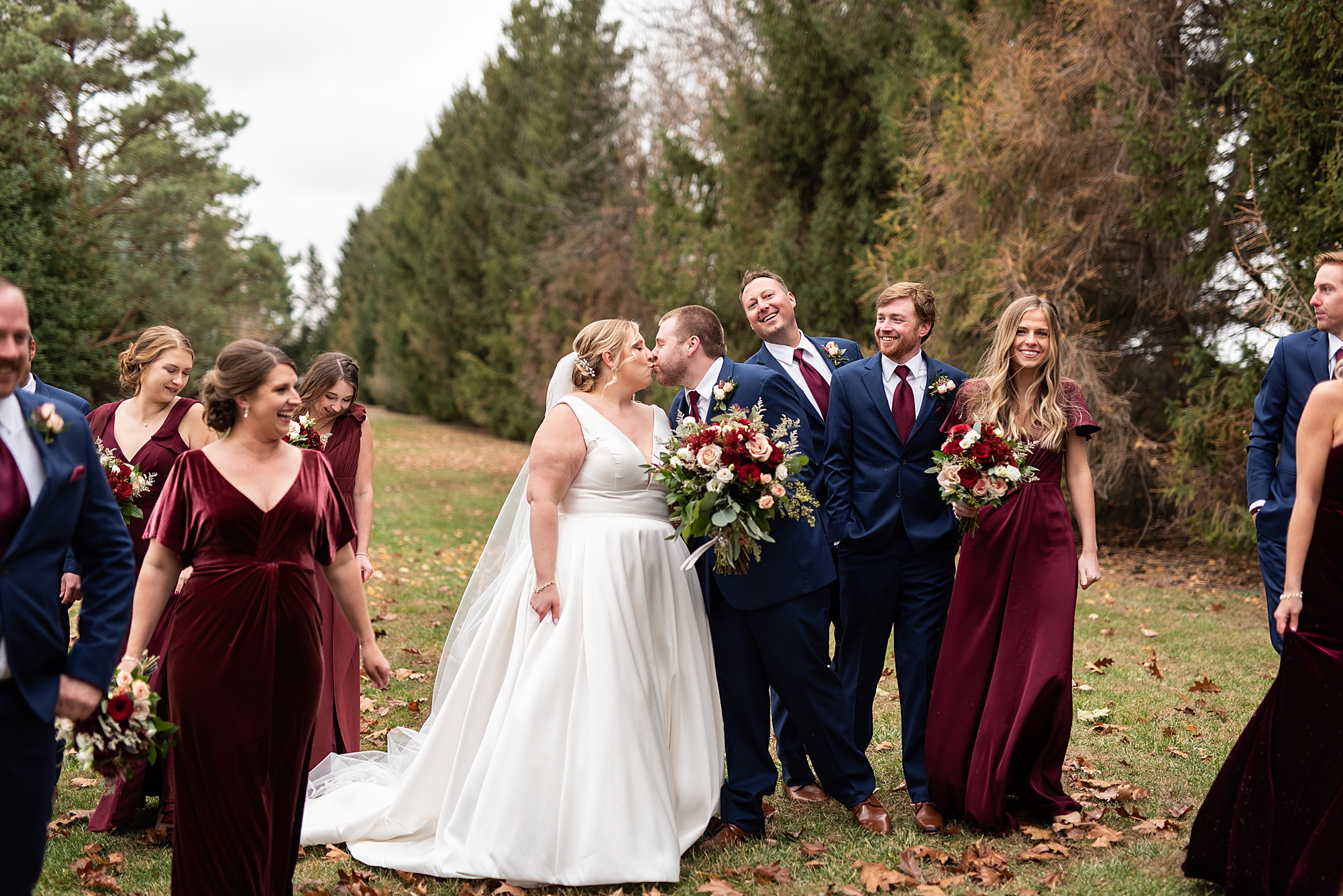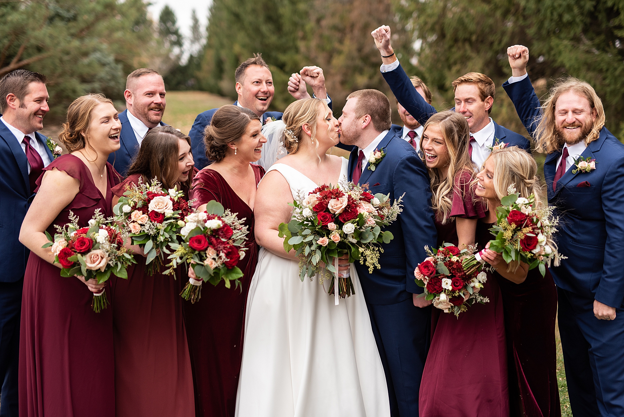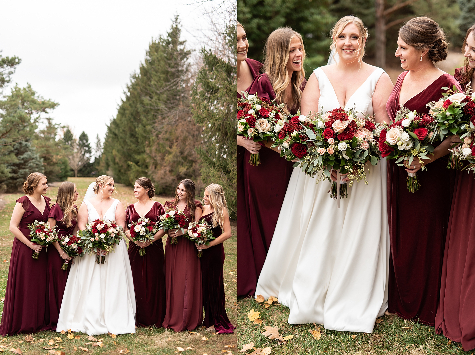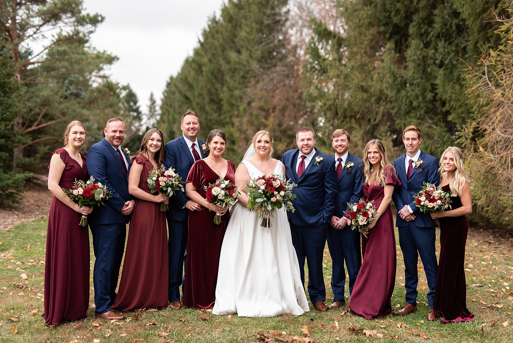The weather turned out to be pretty chilly with a little spitting rain here and there, but Sarah and Chris totally embraced it and were just so excited to finally be tying the knot. Sarah spent the morning at her childhood home, getting ready with her girls while Chris spent it at home with all of his guys surrounding him. Once everyone was ready we met up among the evergreen trees for portrait time. Sarah and Chris shared a sweet and intimate first look. Chris’s smile never left his face and he could not keep his eyes off of his beautiful bride! We took some fun photos of their bridal party surrounding them and even their adorable pup, Louie, joined in for a few! Once portraits were finished up we headed to Little Flower church to get them married!