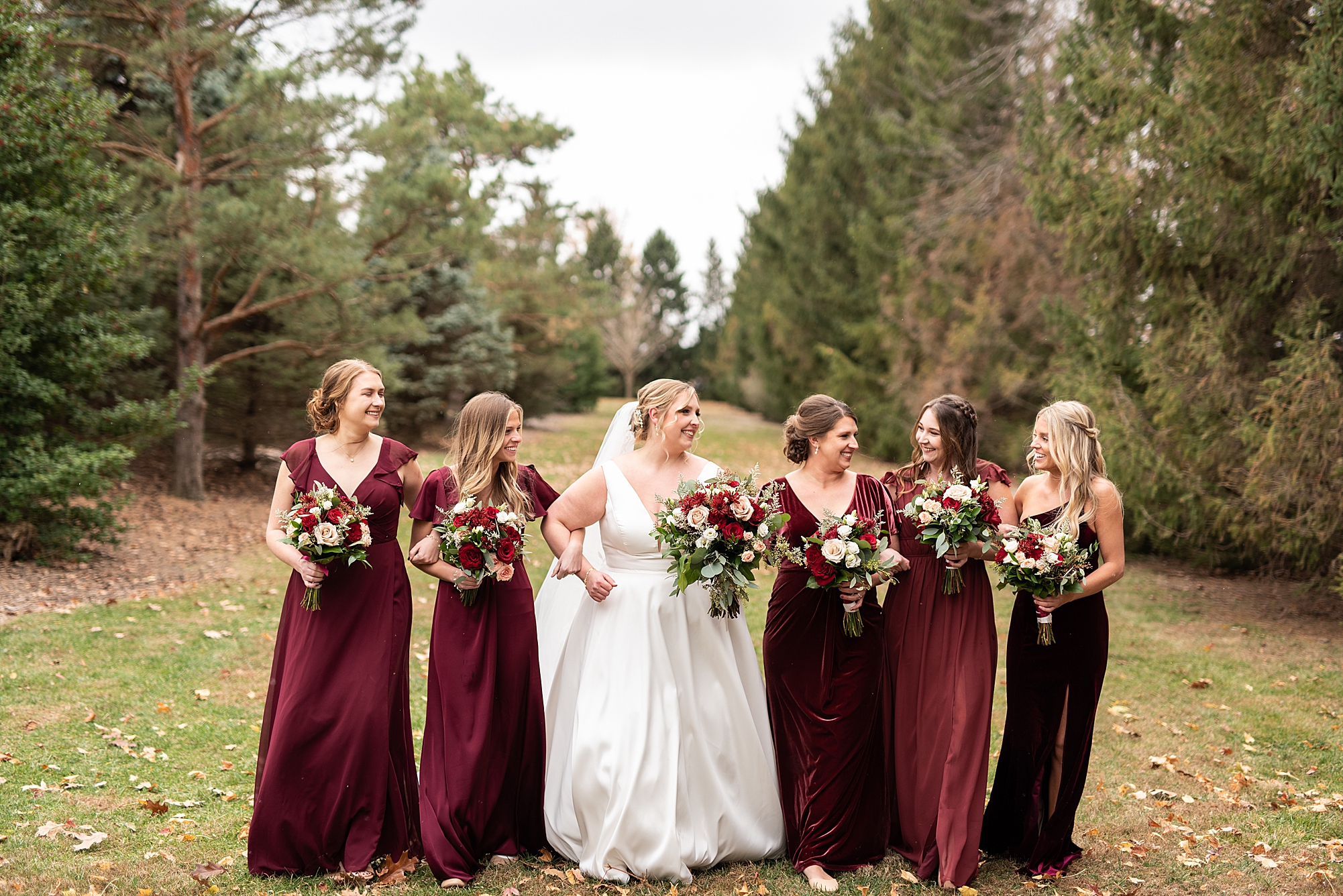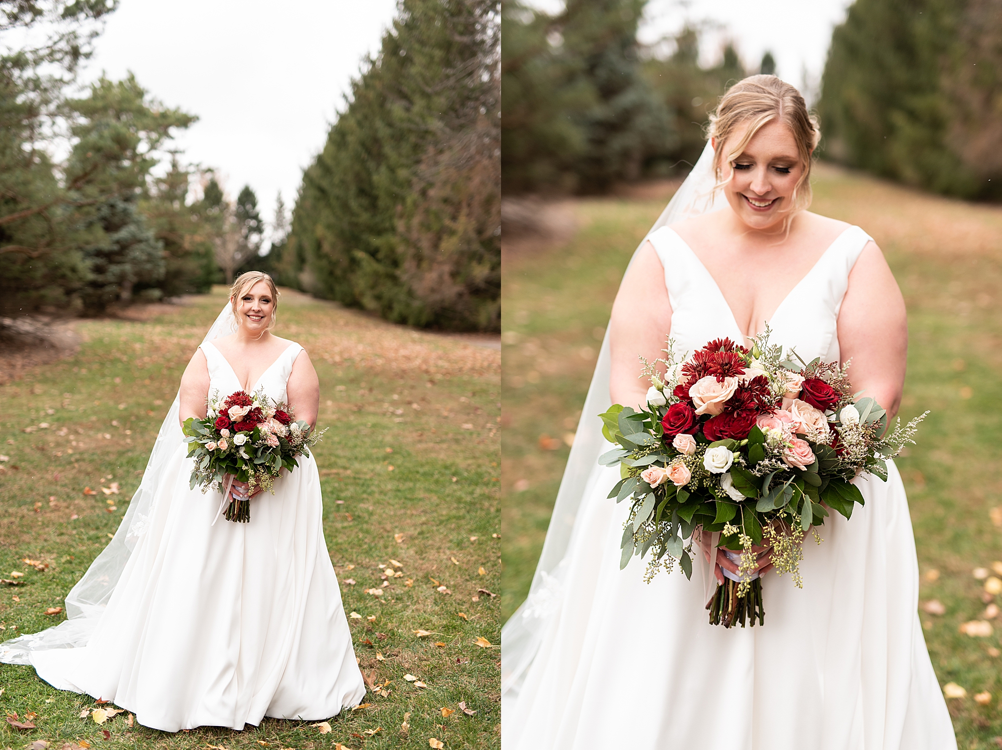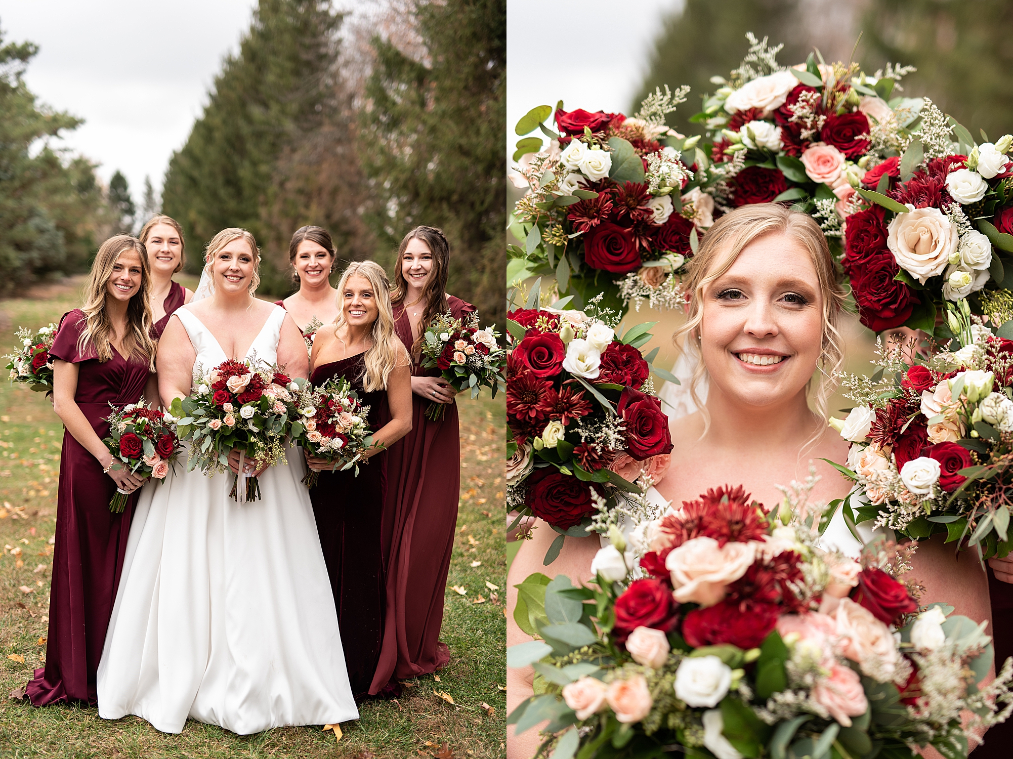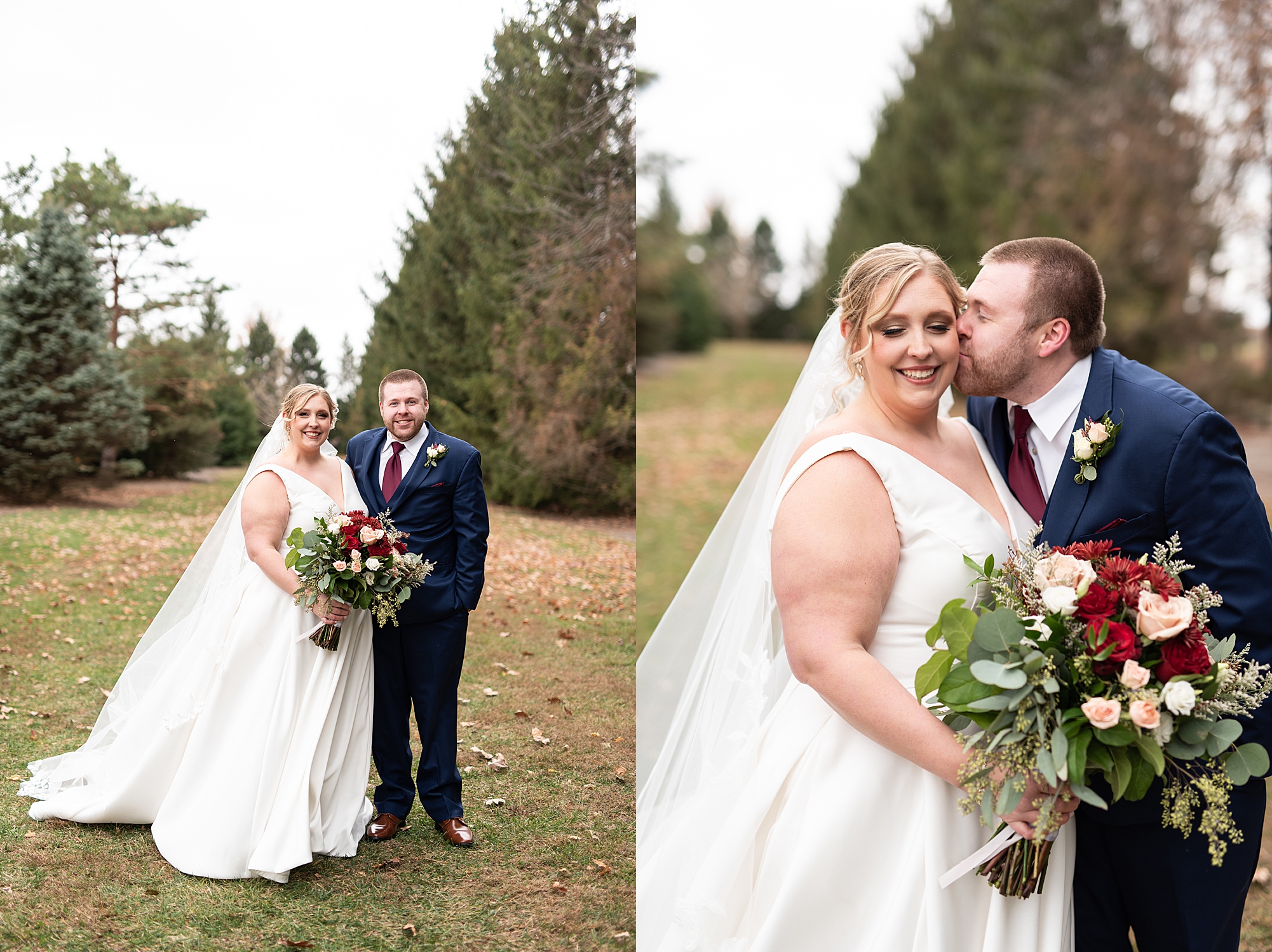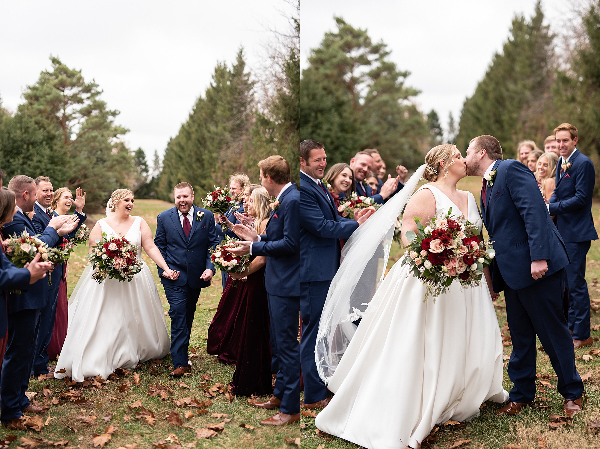 The weather turned out to be pretty chilly with a little spitting rain here and there, but Sarah and Chris totally embraced it and were just so excited to finally be tying the knot. Sarah spent the morning at her childhood home, getting ready with her girls while Chris spent it at home with all of his guys surrounding him. Once everyone was ready we met up among the evergreen trees for portrait time. Sarah and Chris shared a sweet and intimate first look. Chris’s smile never left his face and he could not keep his eyes off of his beautiful bride! We took some fun photos of their bridal party surrounding them and even their adorable pup, Louie, joined in for a few! Once portraits were finished up we headed to Little Flower church to get them married!