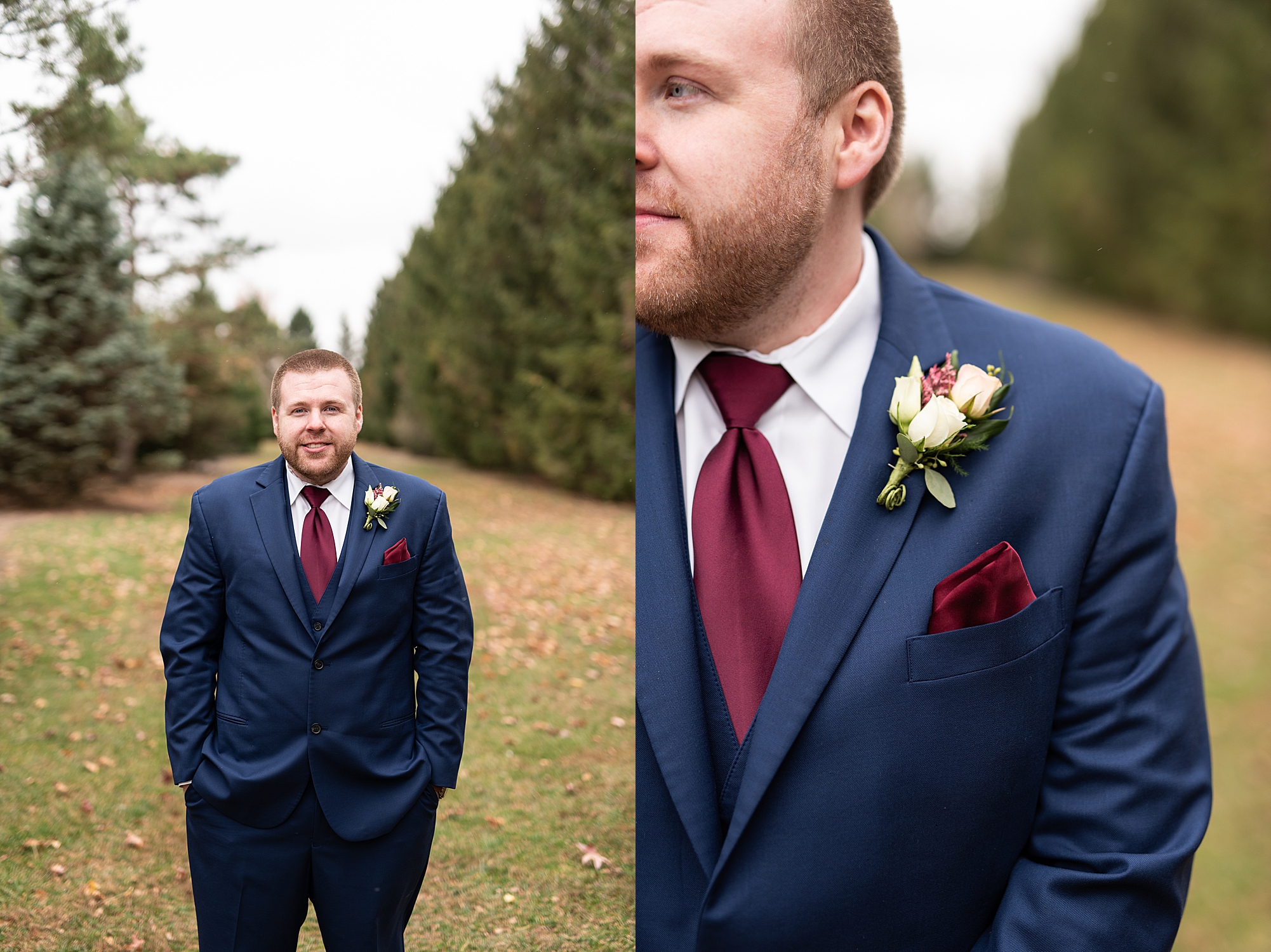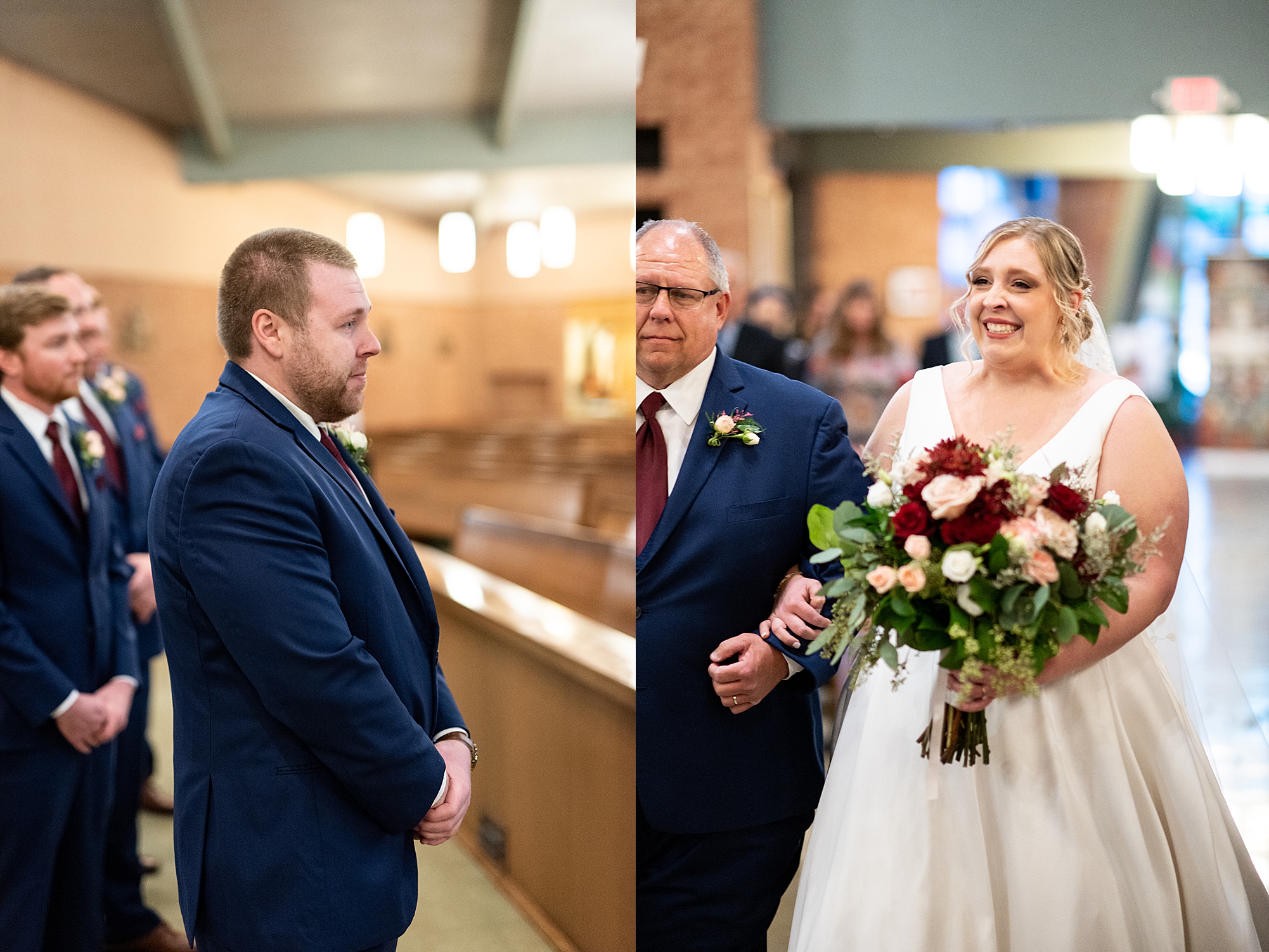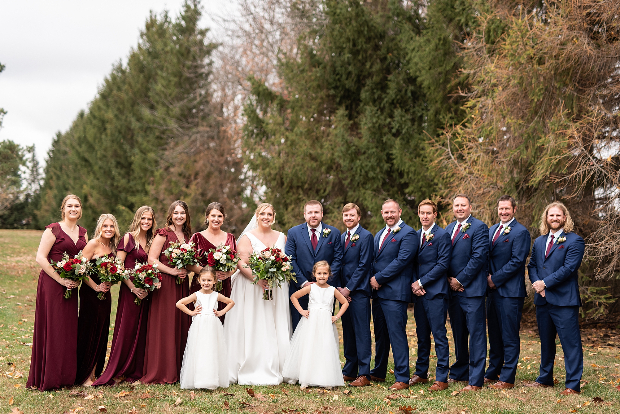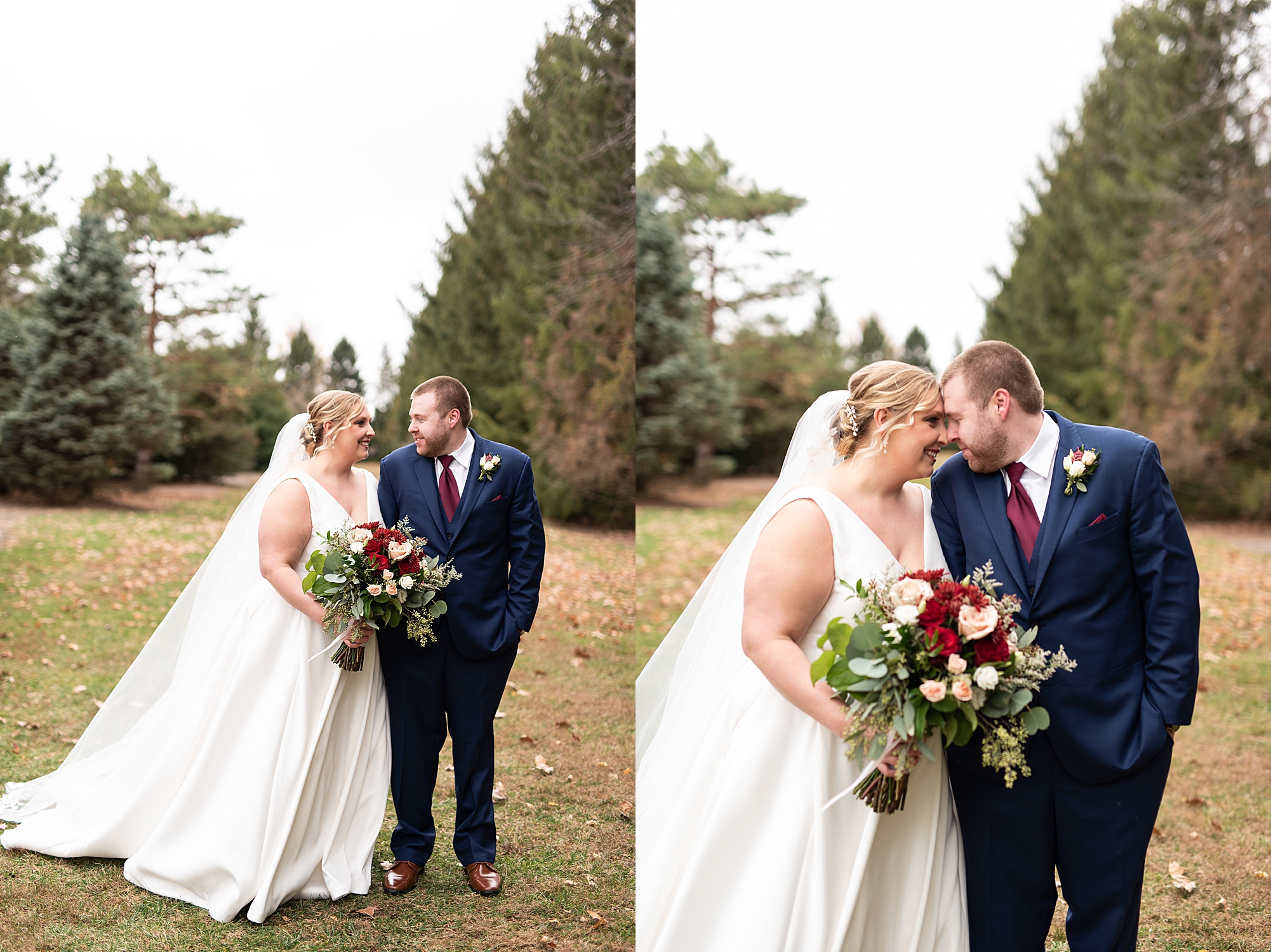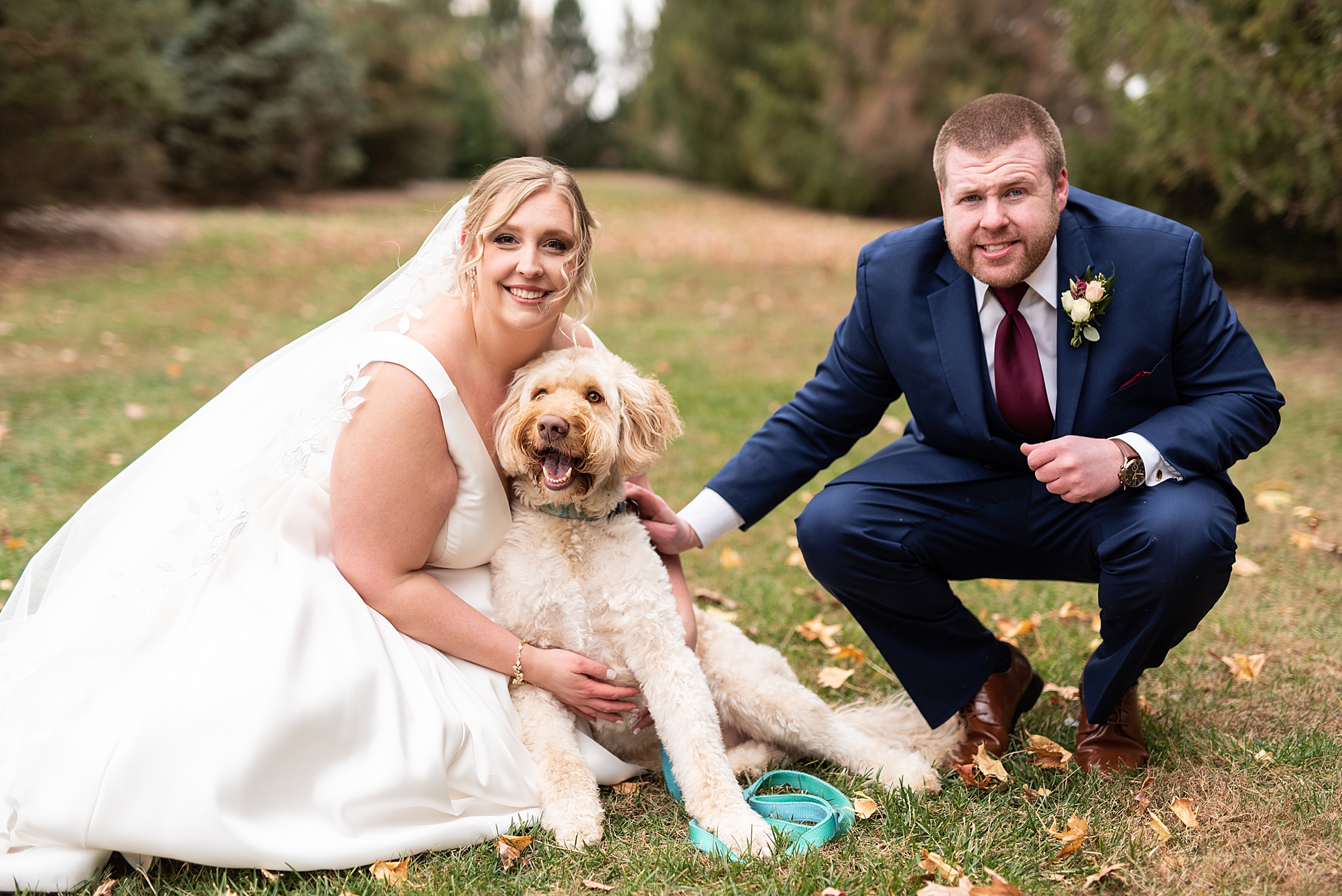 The weather turned out to be pretty chilly with a little spitting rain here and there, but Sarah and Chris totally embraced it and were just so excited to finally be tying the knot. Sarah spent the morning at her childhood home, getting ready with her girls while Chris spent it at home with all of his guys surrounding him. Once everyone was ready we met up among the evergreen trees for portrait time. Sarah and Chris shared a sweet and intimate first look. Chris’s smile never left his face and he could not keep his eyes off of his beautiful bride! We took some fun photos of their bridal party surrounding them and even their adorable pup, Louie, joined in for a few! Once portraits were finished up we headed to Little Flower church to get them married!