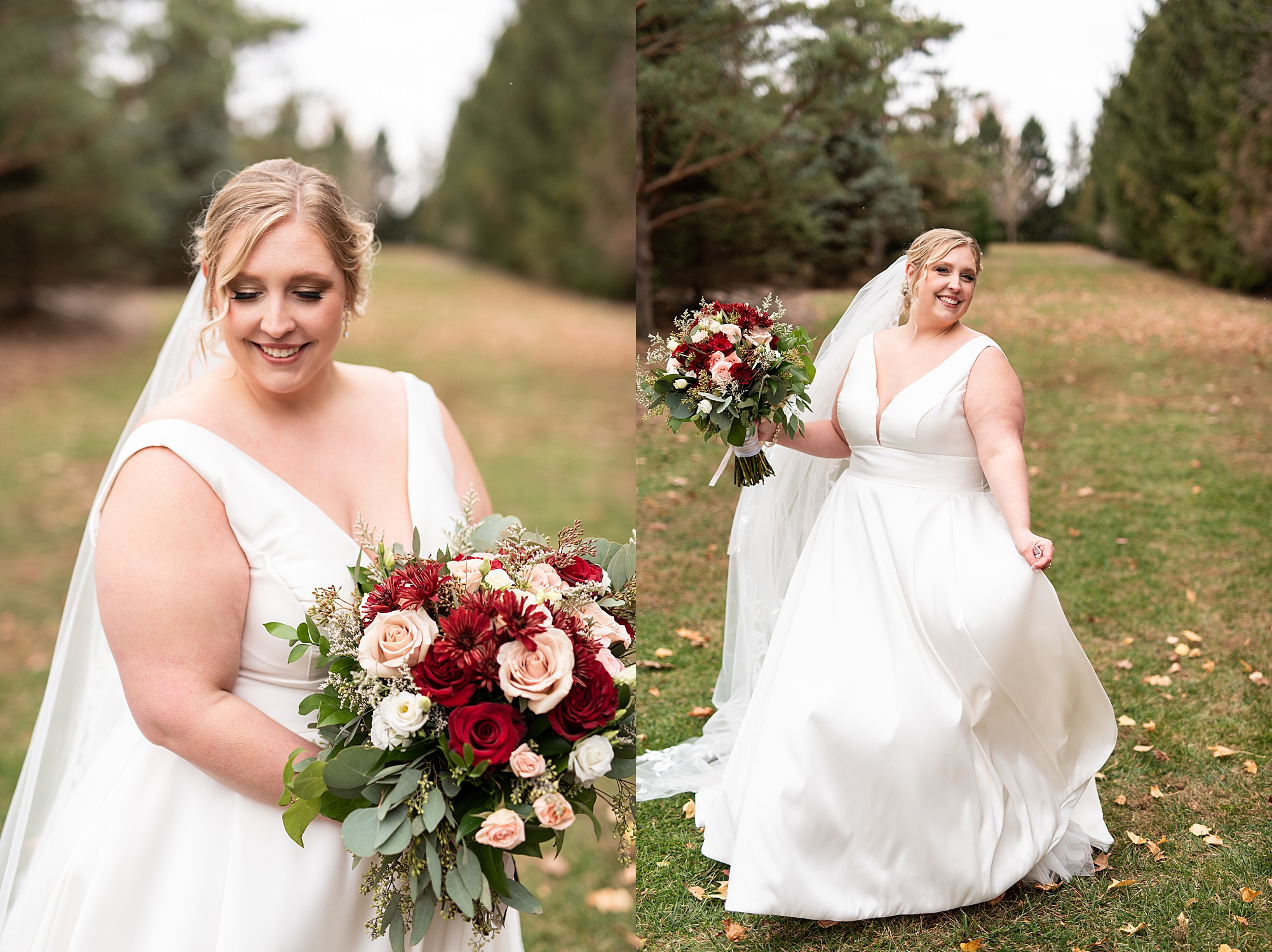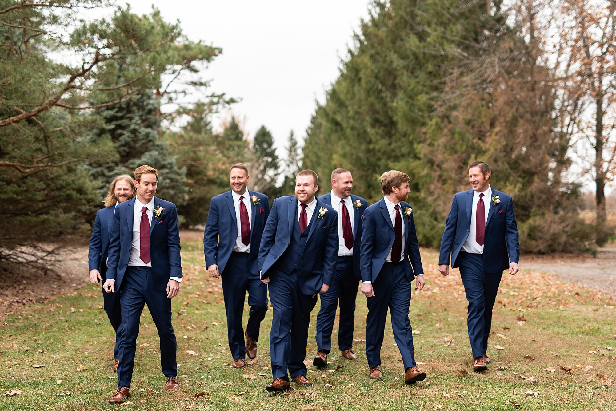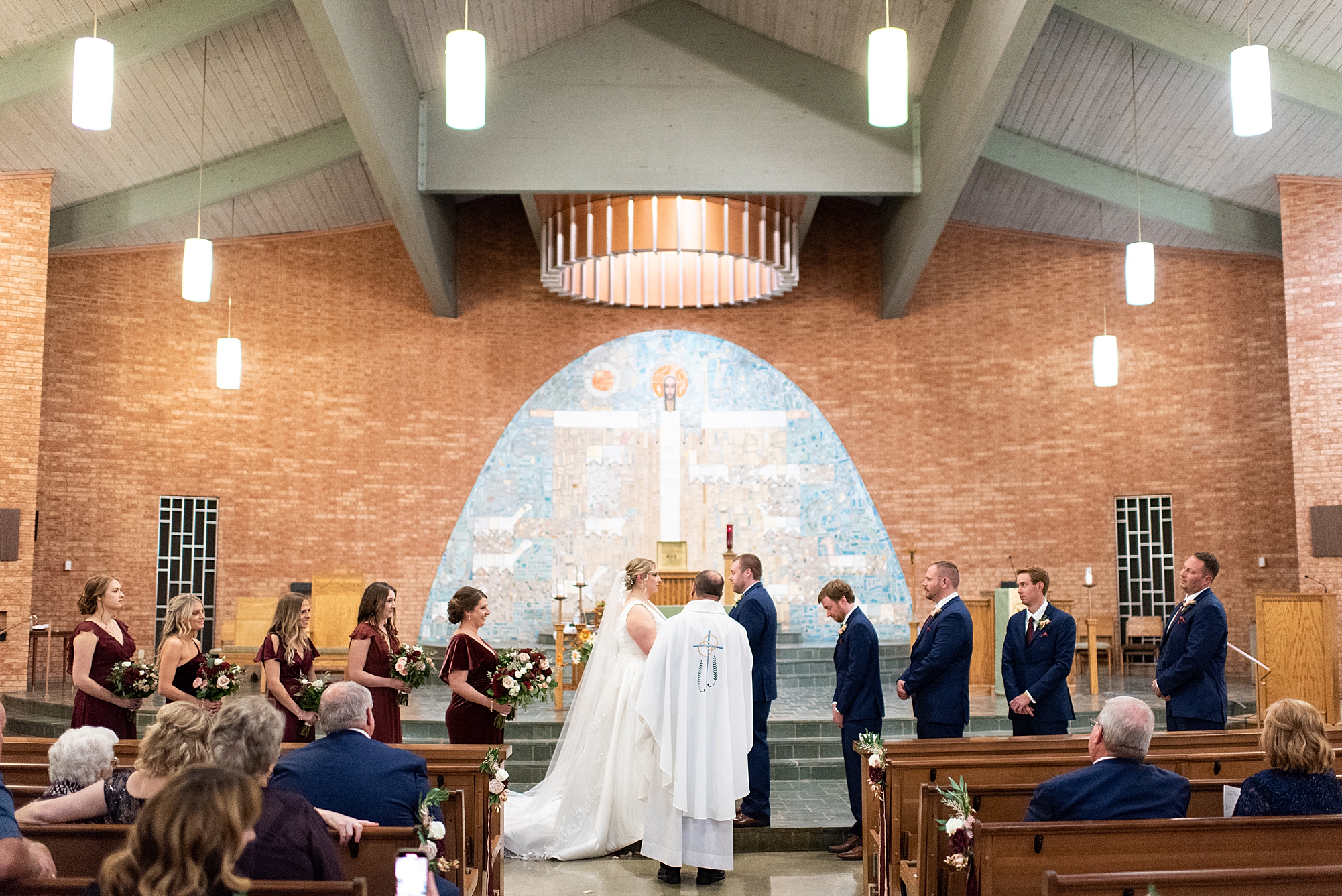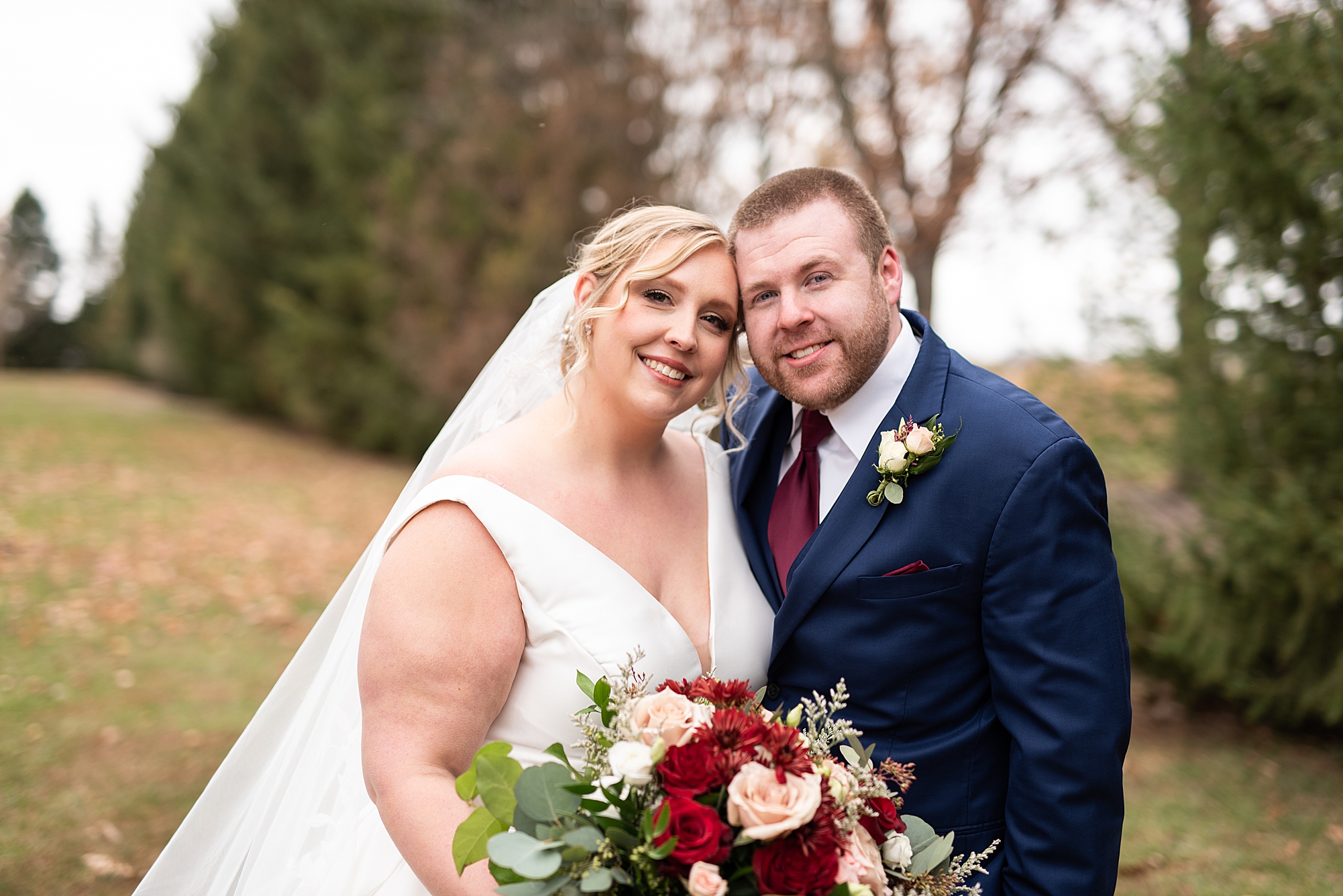 The weather turned out to be pretty chilly with a little spitting rain here and there, but Sarah and Chris totally embraced it and were just so excited to finally be tying the knot. Sarah spent the morning at her childhood home, getting ready with her girls while Chris spent it at home with all of his guys surrounding him. Once everyone was ready we met up among the evergreen trees for portrait time. Sarah and Chris shared a sweet and intimate first look. Chris’s smile never left his face and he could not keep his eyes off of his beautiful bride! We took some fun photos of their bridal party surrounding them and even their adorable pup, Louie, joined in for a few! Once portraits were finished up we headed to Little Flower church to get them married!