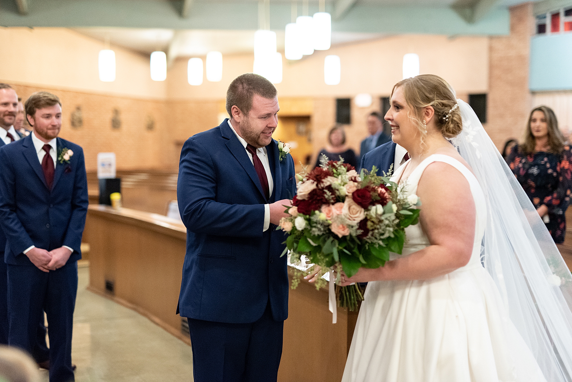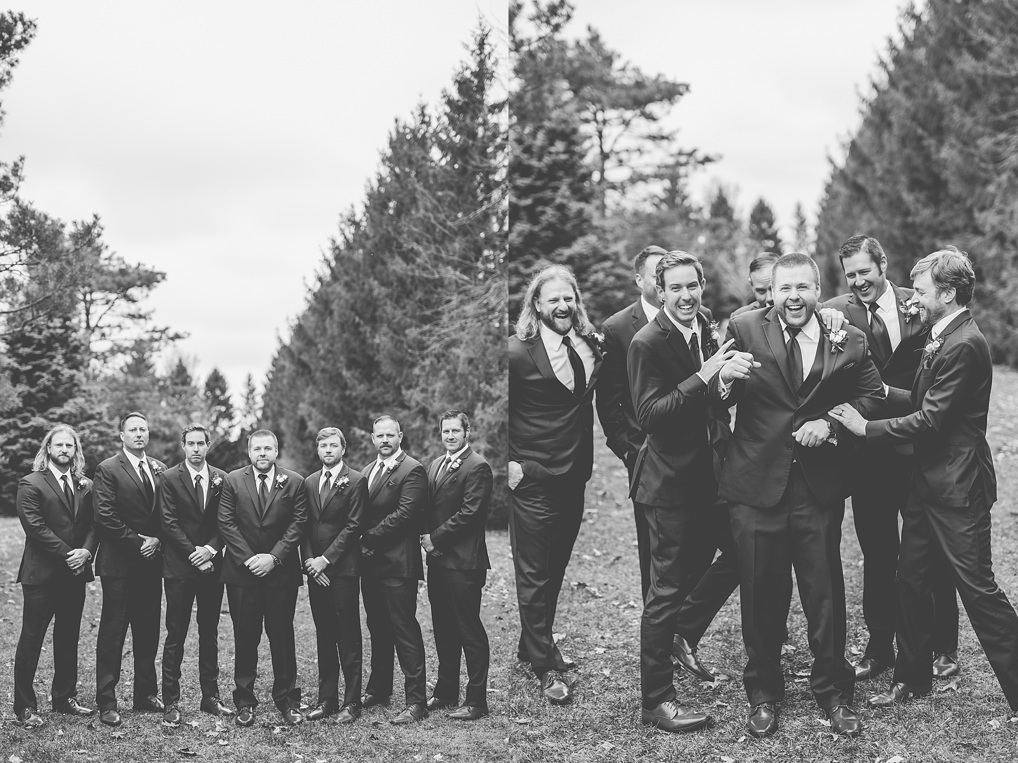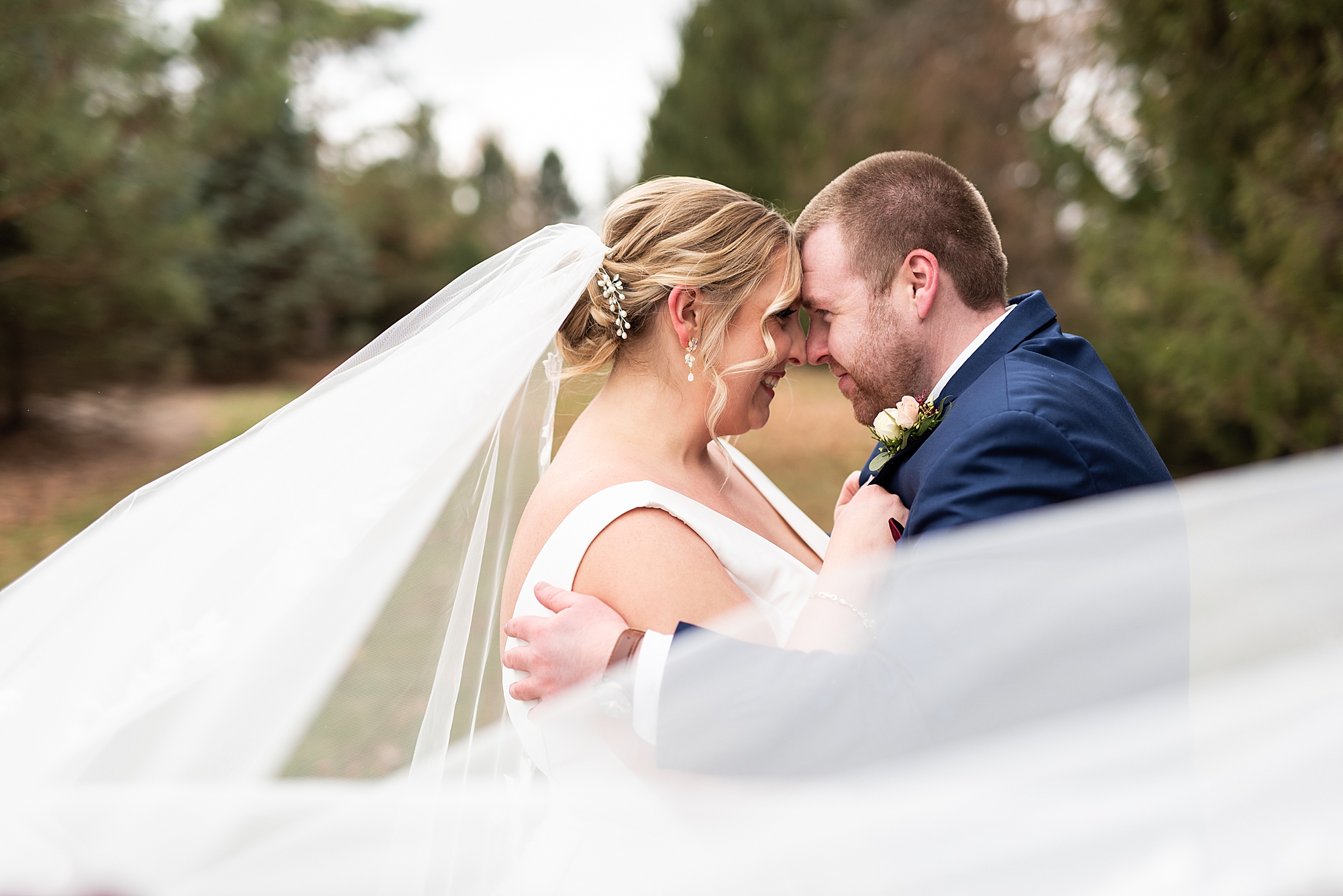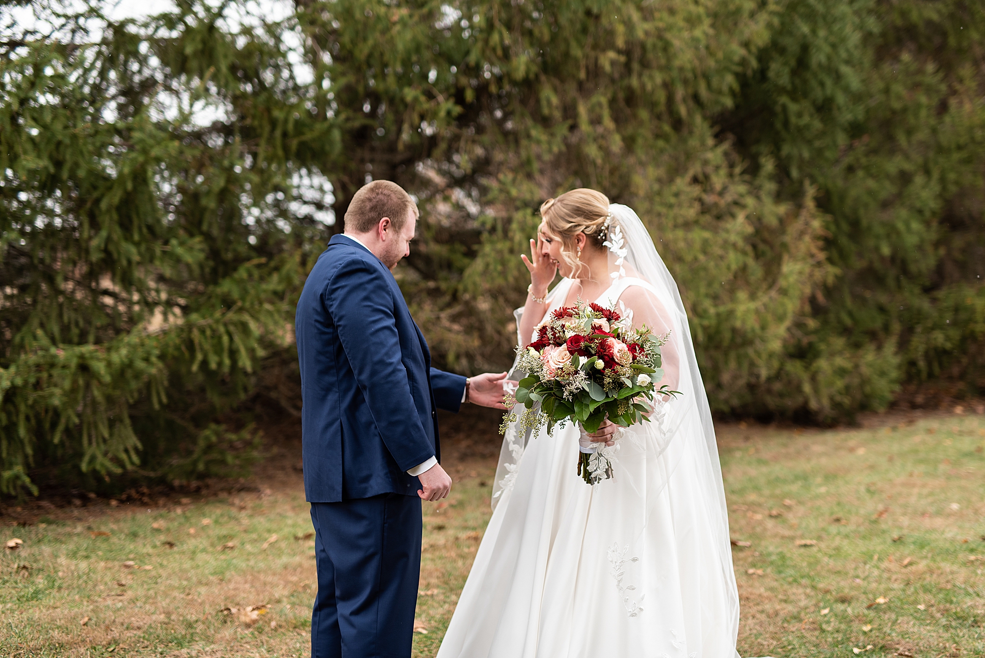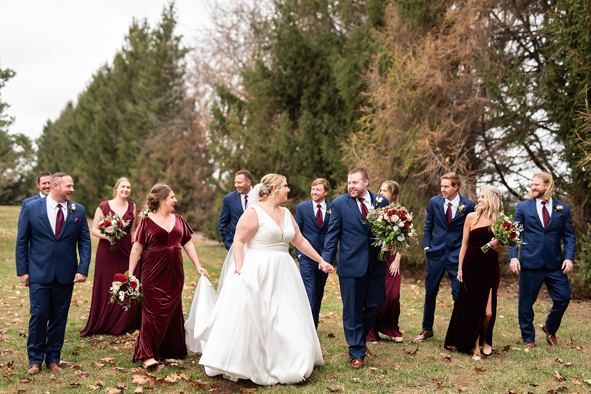 The weather turned out to be pretty chilly with a little spitting rain here and there, but Sarah and Chris totally embraced it and were just so excited to finally be tying the knot. Sarah spent the morning at her childhood home, getting ready with her girls while Chris spent it at home with all of his guys surrounding him. Once everyone was ready we met up among the evergreen trees for portrait time. Sarah and Chris shared a sweet and intimate first look. Chris’s smile never left his face and he could not keep his eyes off of his beautiful bride! We took some fun photos of their bridal party surrounding them and even their adorable pup, Louie, joined in for a few! Once portraits were finished up we headed to Little Flower church to get them married!