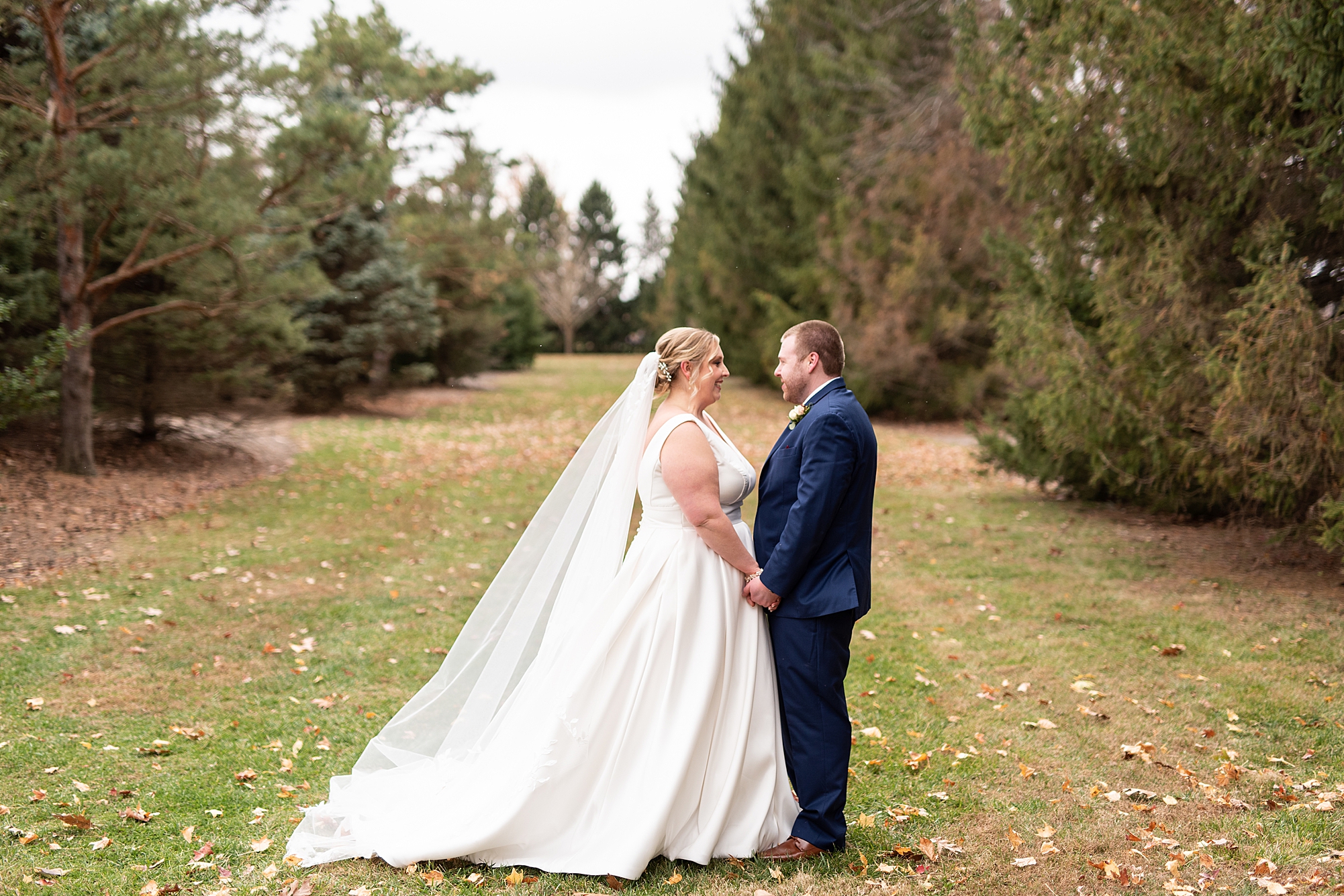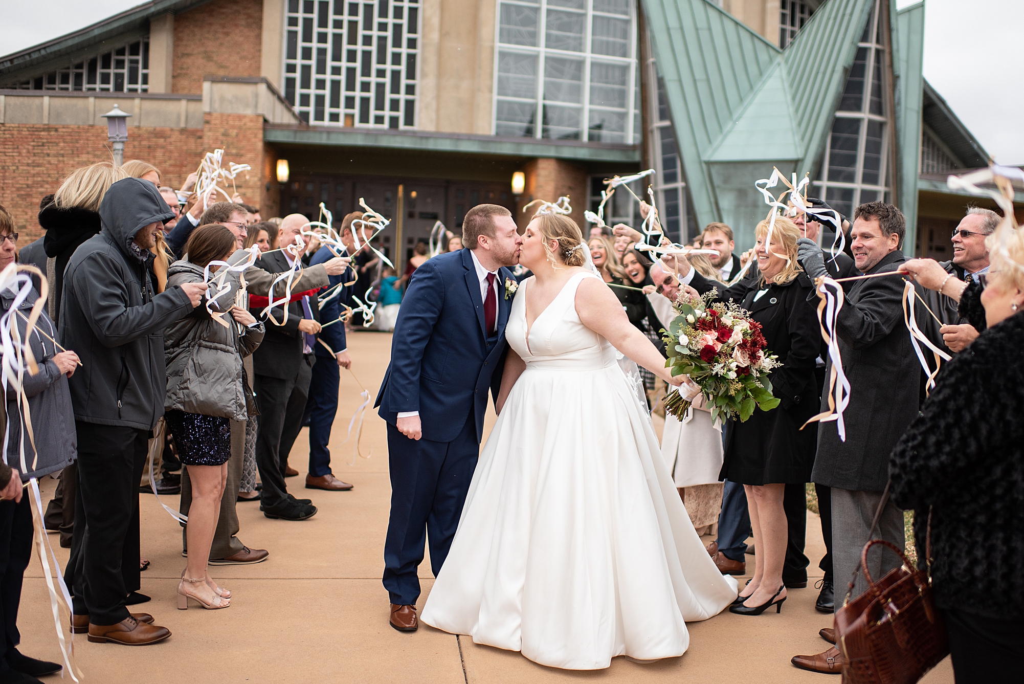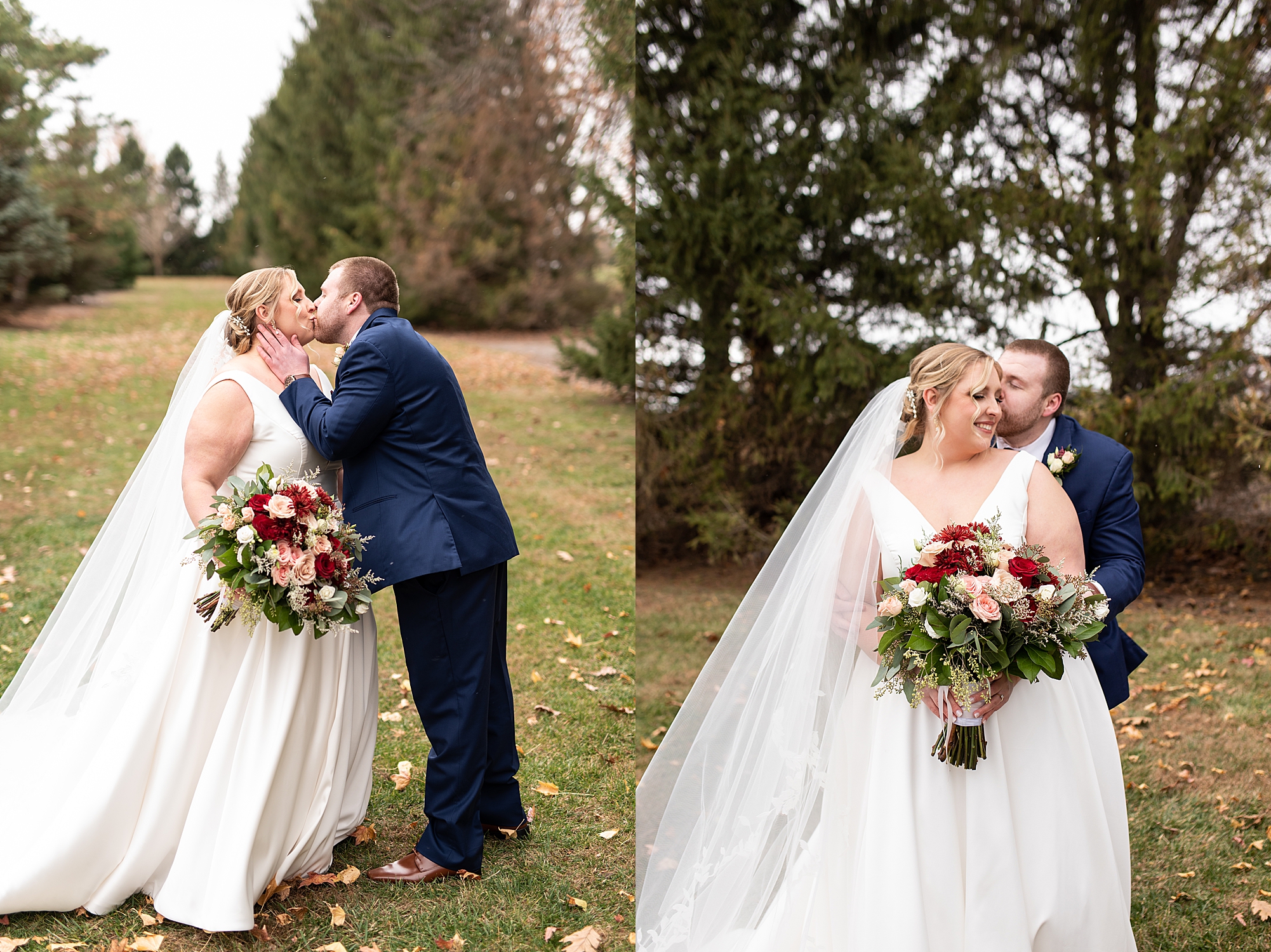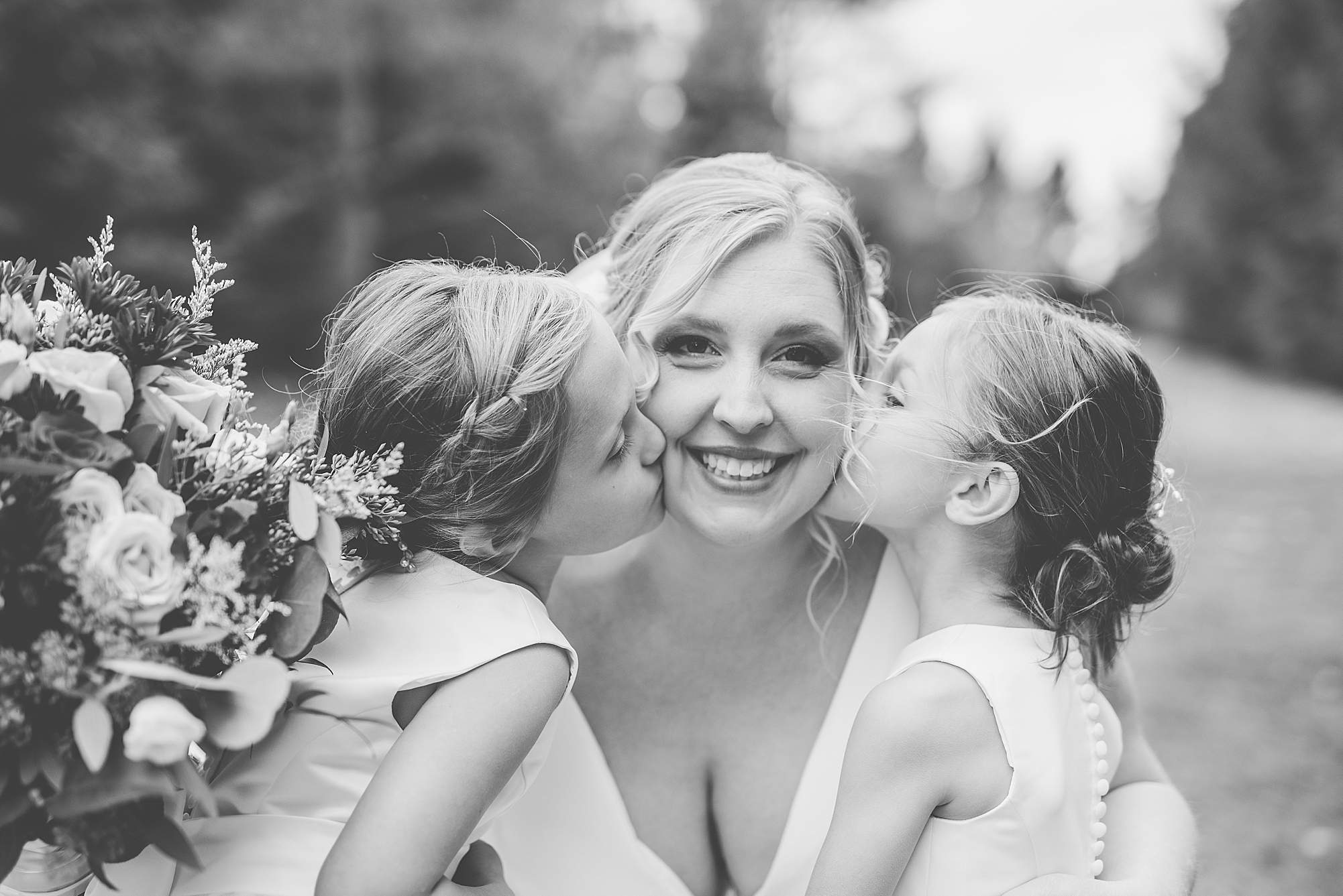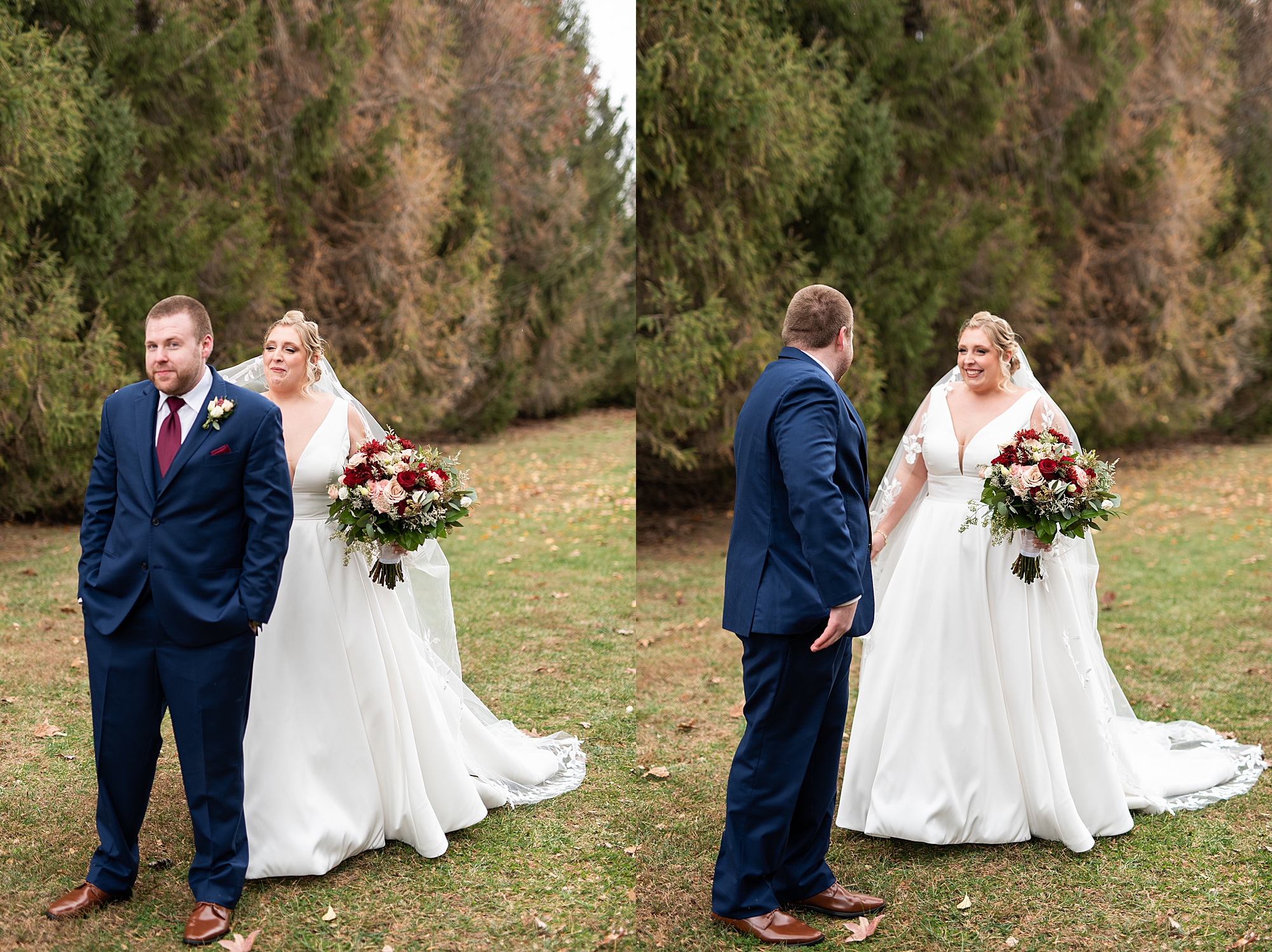 The weather turned out to be pretty chilly with a little spitting rain here and there, but Sarah and Chris totally embraced it and were just so excited to finally be tying the knot. Sarah spent the morning at her childhood home, getting ready with her girls while Chris spent it at home with all of his guys surrounding him. Once everyone was ready we met up among the evergreen trees for portrait time. Sarah and Chris shared a sweet and intimate first look. Chris’s smile never left his face and he could not keep his eyes off of his beautiful bride! We took some fun photos of their bridal party surrounding them and even their adorable pup, Louie, joined in for a few! Once portraits were finished up we headed to Little Flower church to get them married!