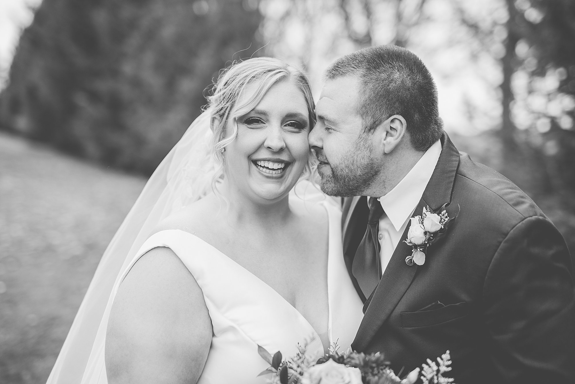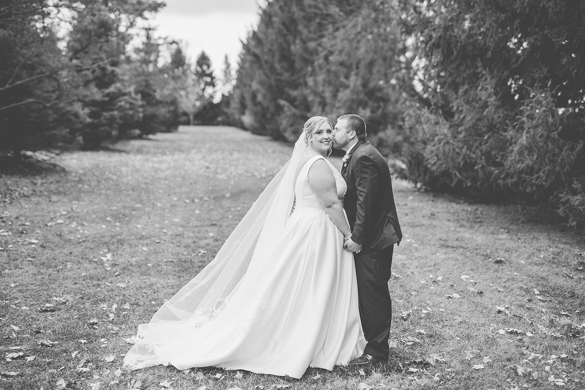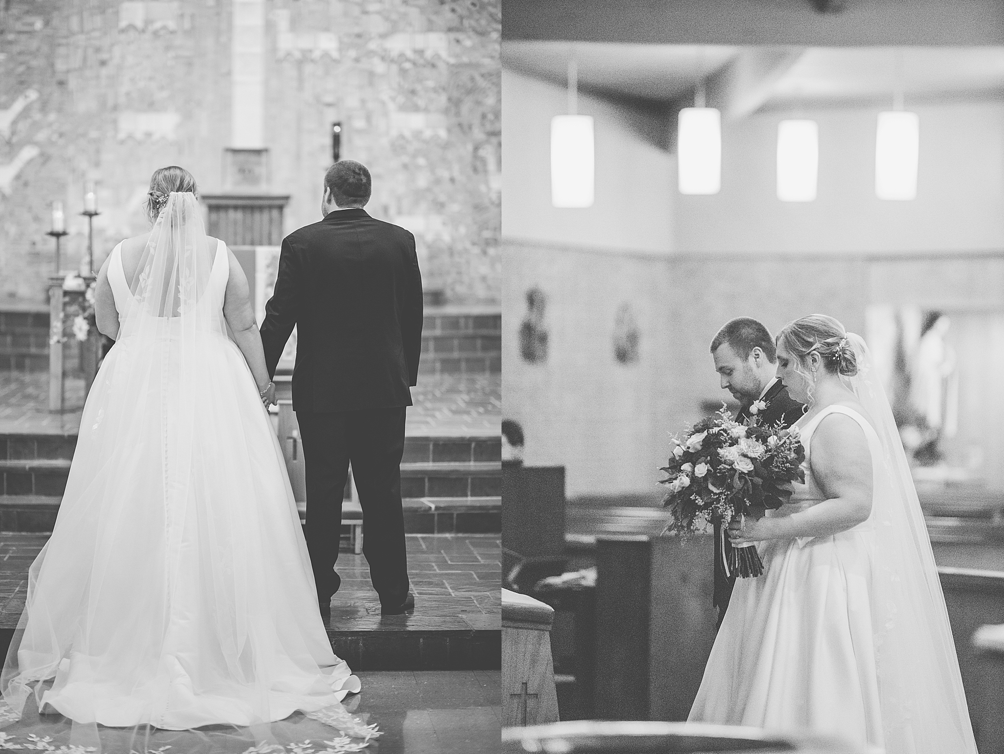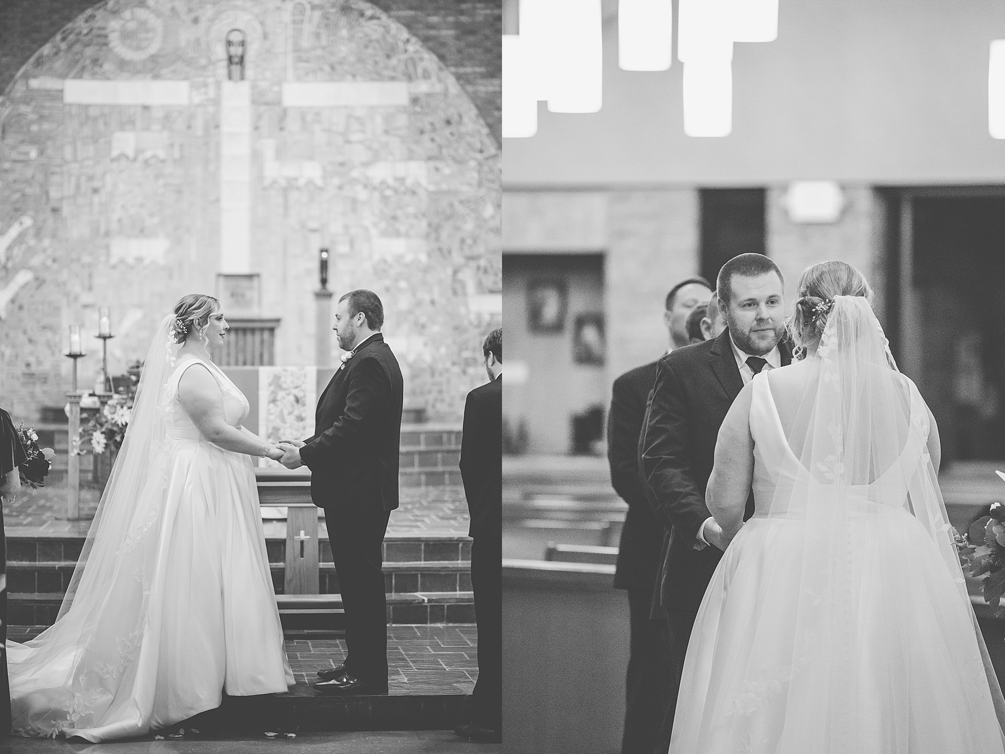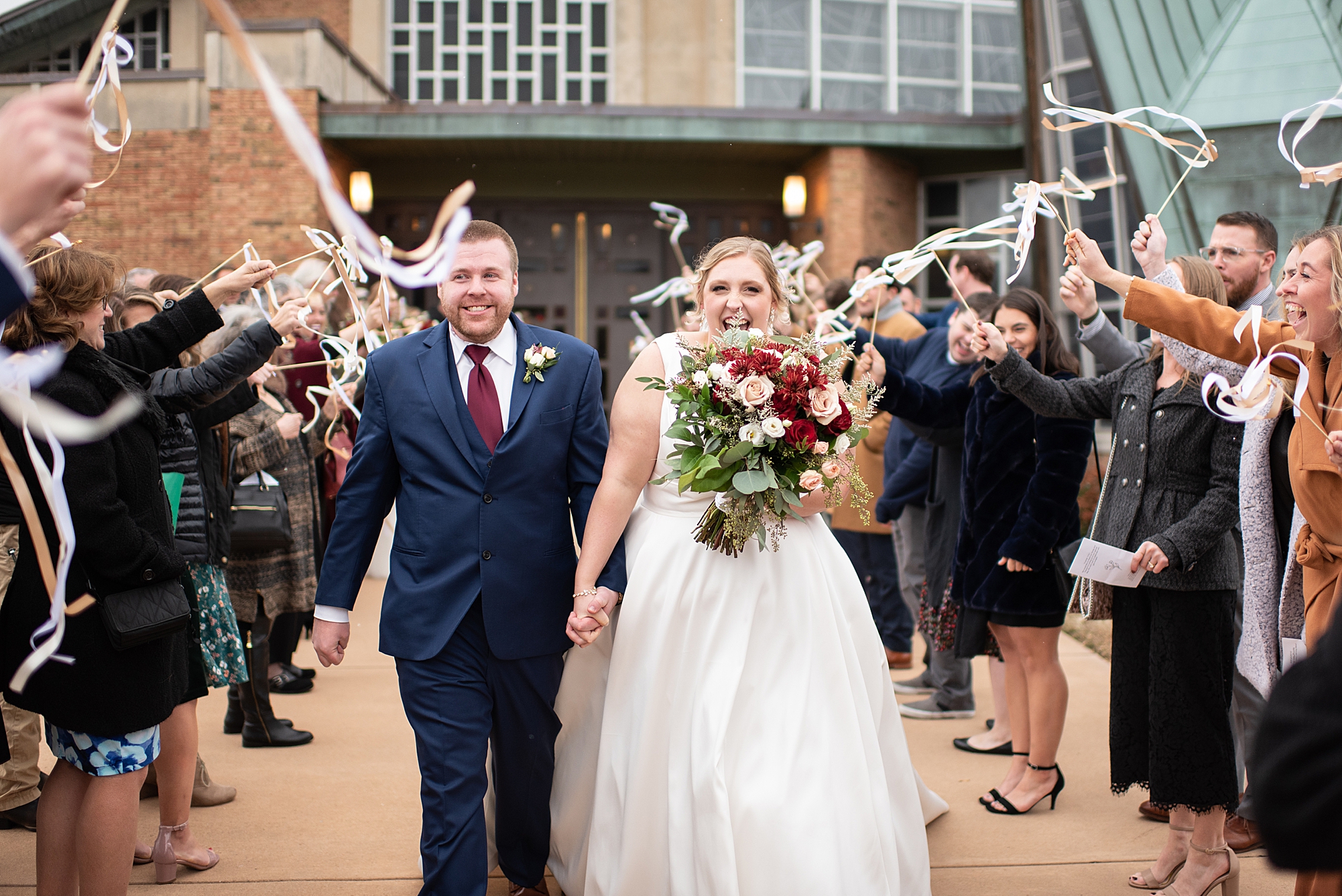 The weather turned out to be pretty chilly with a little spitting rain here and there, but Sarah and Chris totally embraced it and were just so excited to finally be tying the knot. Sarah spent the morning at her childhood home, getting ready with her girls while Chris spent it at home with all of his guys surrounding him. Once everyone was ready we met up among the evergreen trees for portrait time. Sarah and Chris shared a sweet and intimate first look. Chris’s smile never left his face and he could not keep his eyes off of his beautiful bride! We took some fun photos of their bridal party surrounding them and even their adorable pup, Louie, joined in for a few! Once portraits were finished up we headed to Little Flower church to get them married!