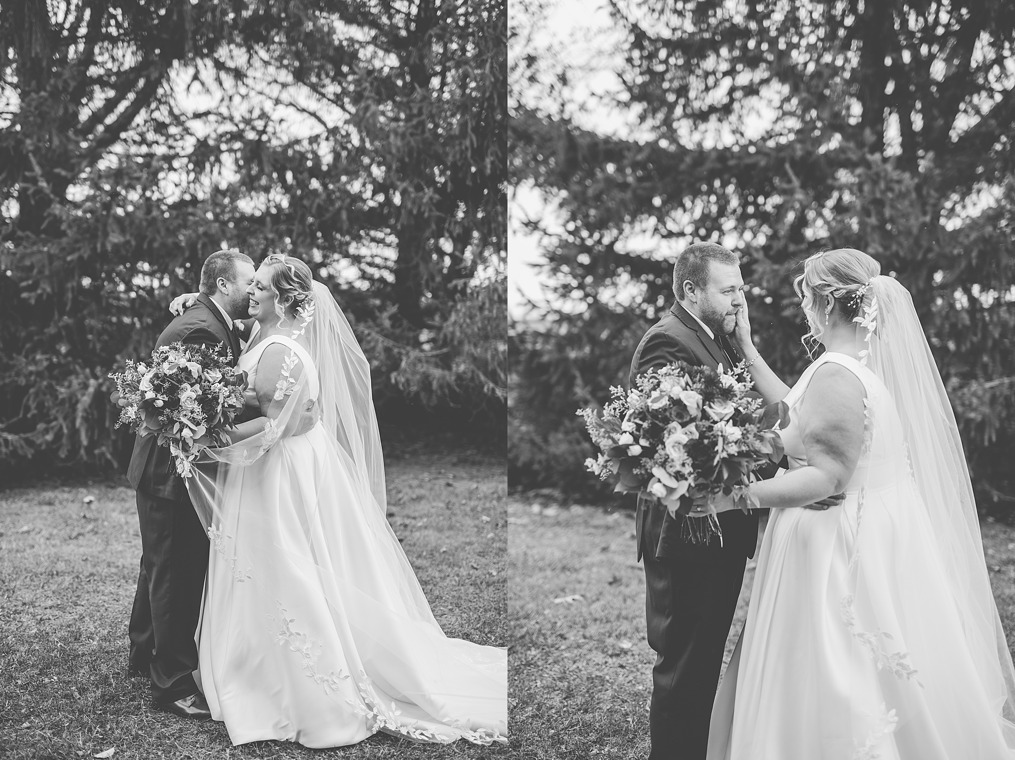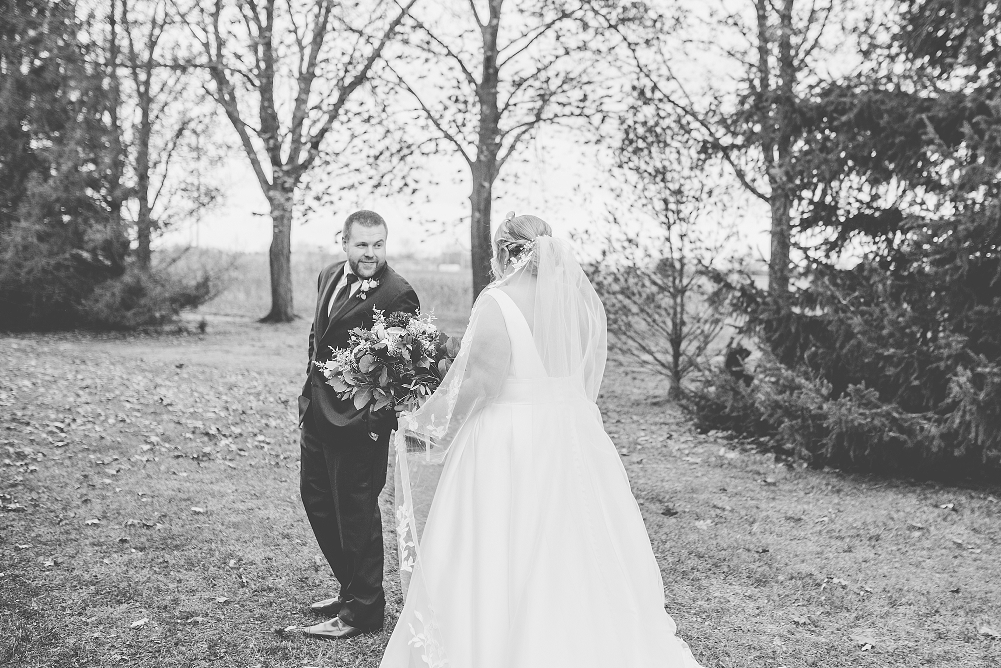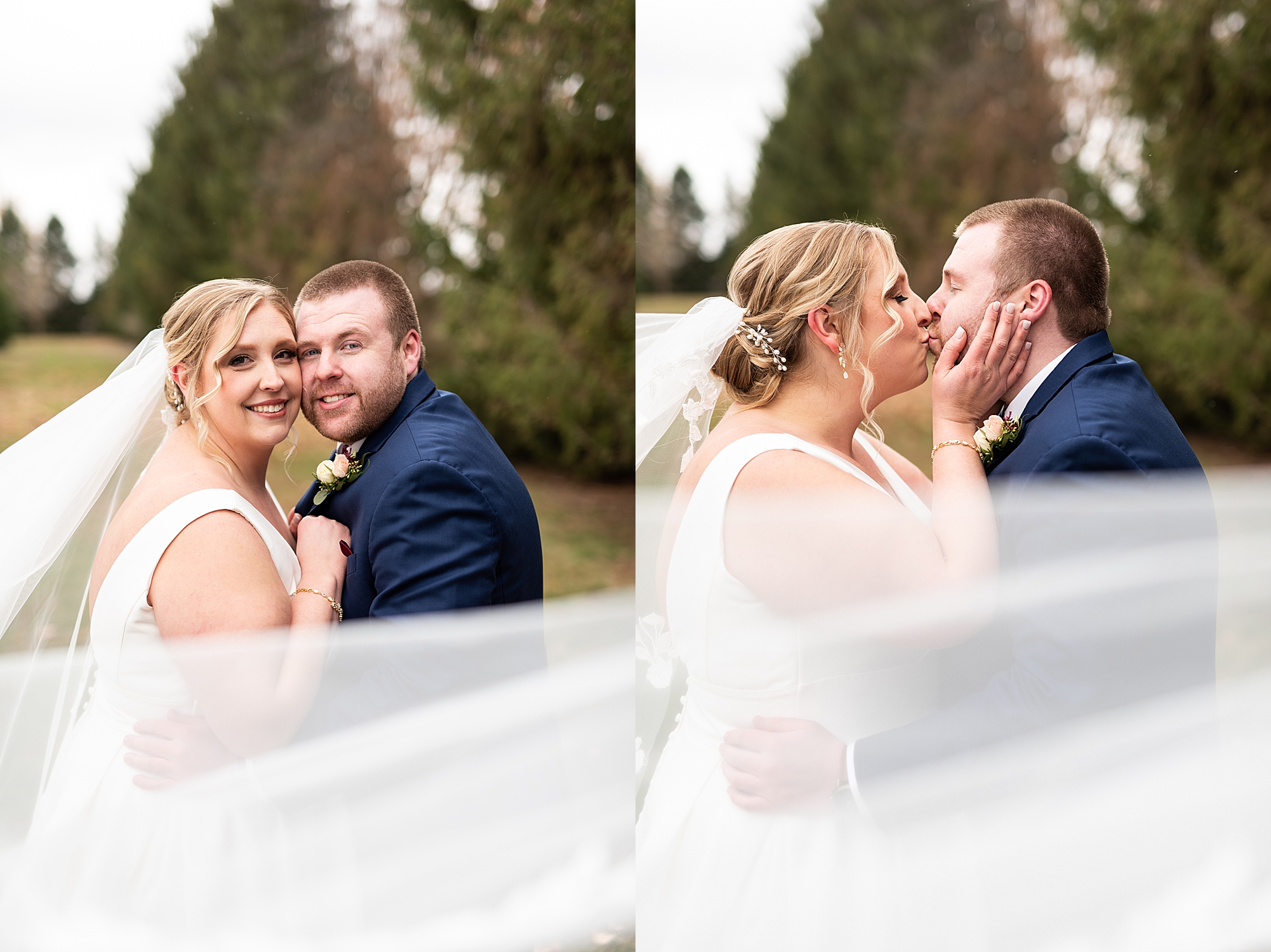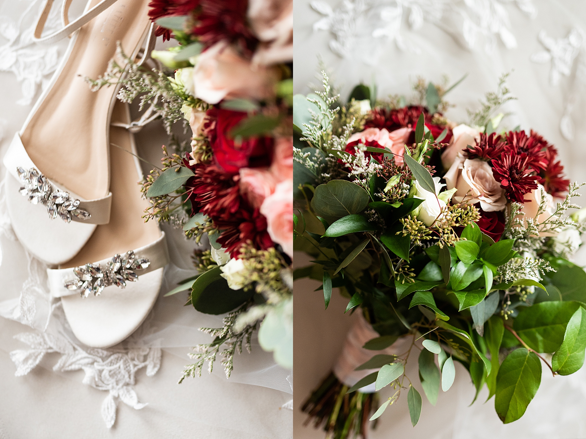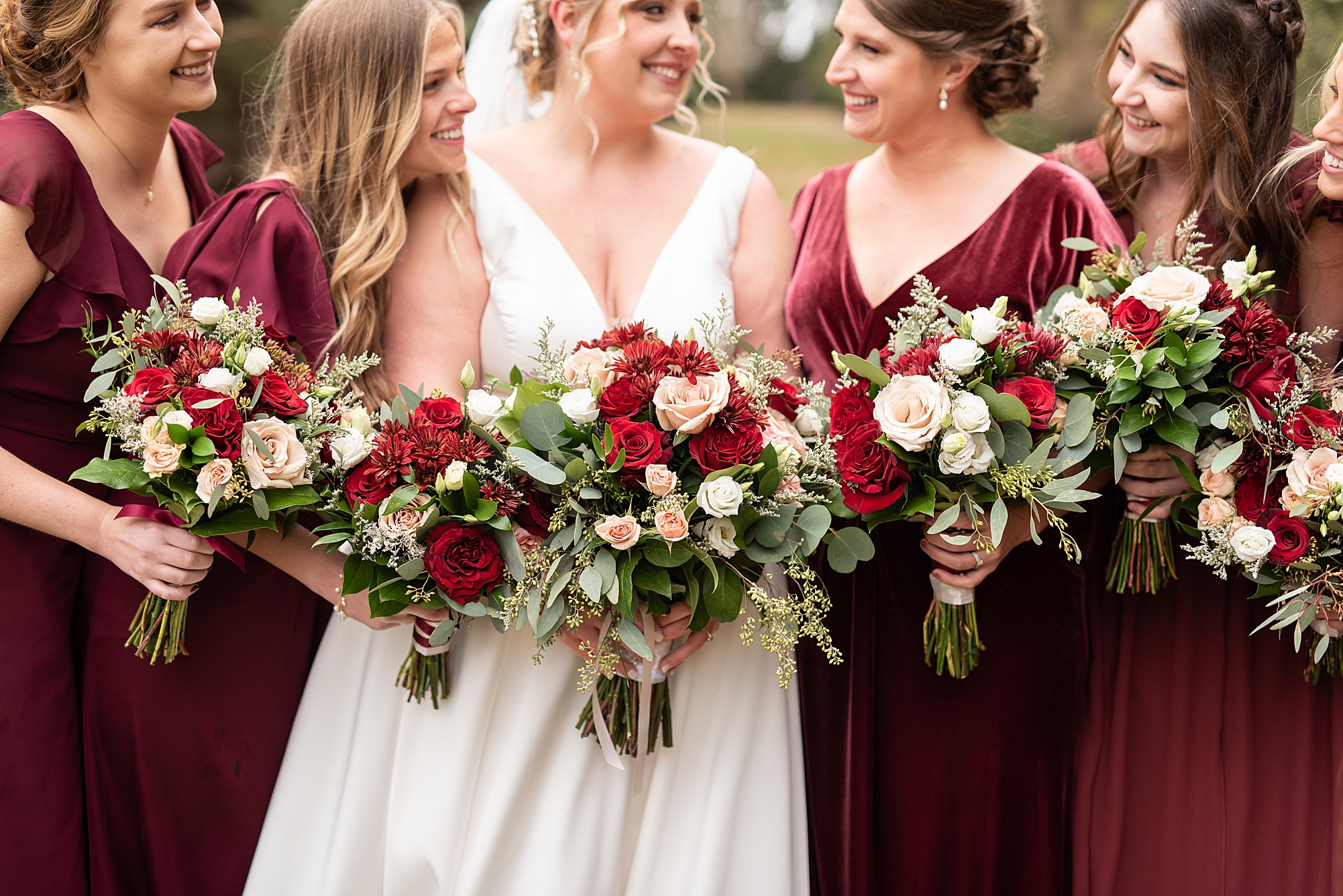 The weather turned out to be pretty chilly with a little spitting rain here and there, but Sarah and Chris totally embraced it and were just so excited to finally be tying the knot. Sarah spent the morning at her childhood home, getting ready with her girls while Chris spent it at home with all of his guys surrounding him. Once everyone was ready we met up among the evergreen trees for portrait time. Sarah and Chris shared a sweet and intimate first look. Chris’s smile never left his face and he could not keep his eyes off of his beautiful bride! We took some fun photos of their bridal party surrounding them and even their adorable pup, Louie, joined in for a few! Once portraits were finished up we headed to Little Flower church to get them married!