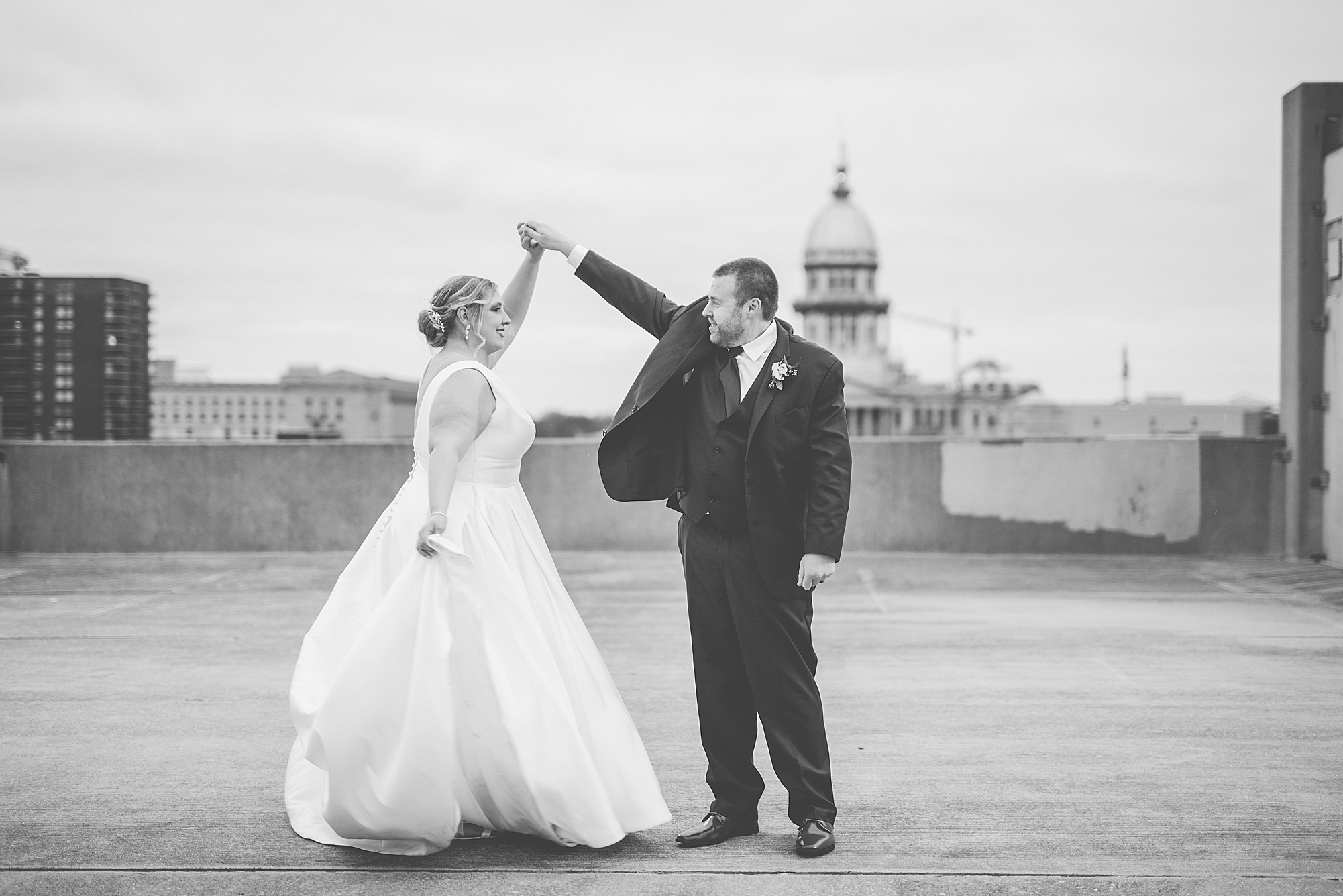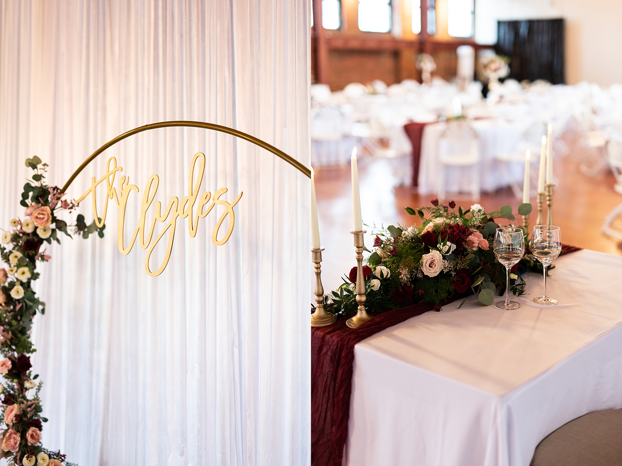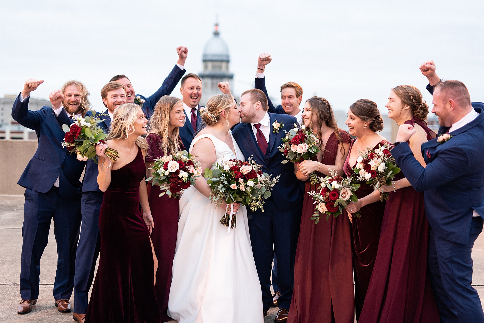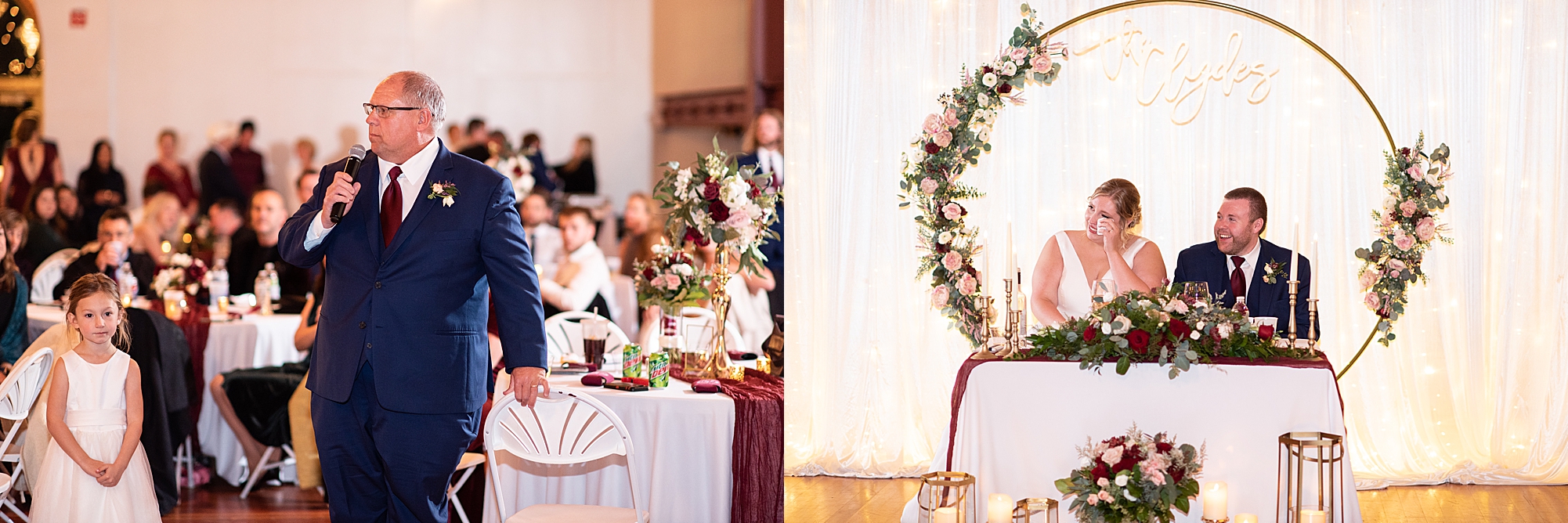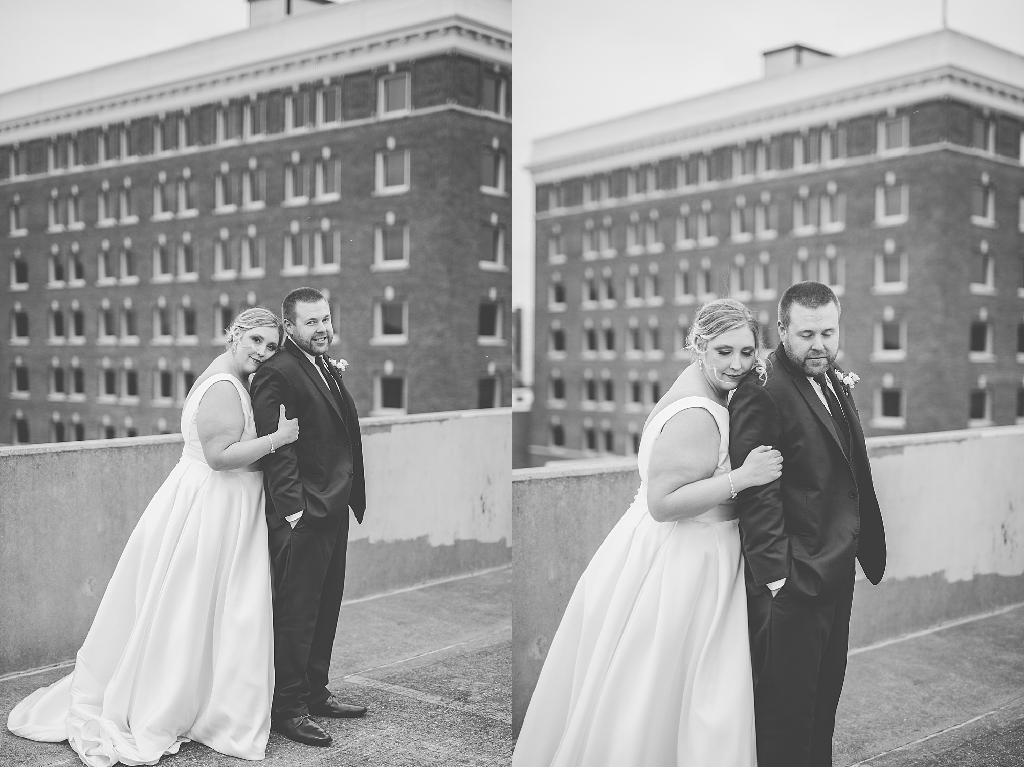 After the ceremony, Sarah and Chris loaded up their bridal party and we headed downtown Springfield for a couple more portraits of them as newlyweds. We stopped at their favorite downtown bar and even climbed a rooftop for a gorgeous cityscape! Chris did such a great job making Sarah laugh and they truly enjoyed spending every moment of their day together! Then, it was finally time to head to their reception to continue their celebration! The Artisans building was packed with all of their guests eager to welcome the newlyweds. Sarah and Chris decorated the venue so perfectly with candle light and so many gorgeous floral details. Everyone truly had such a great night dancing and celebrating Mr. and Mrs. Clyde! I could not be more honored to have been a part of such a special day for Sarah and Chris and I am so excited to share more from their big day!
