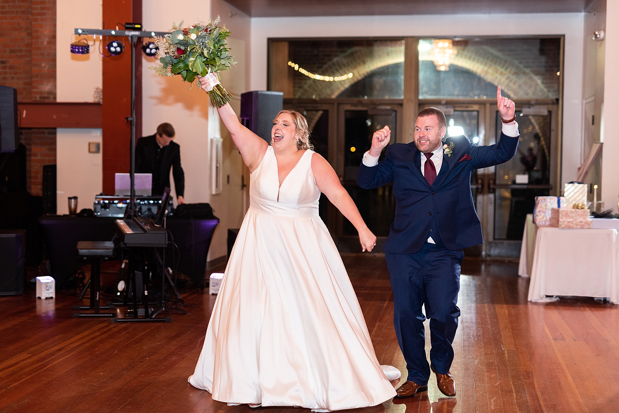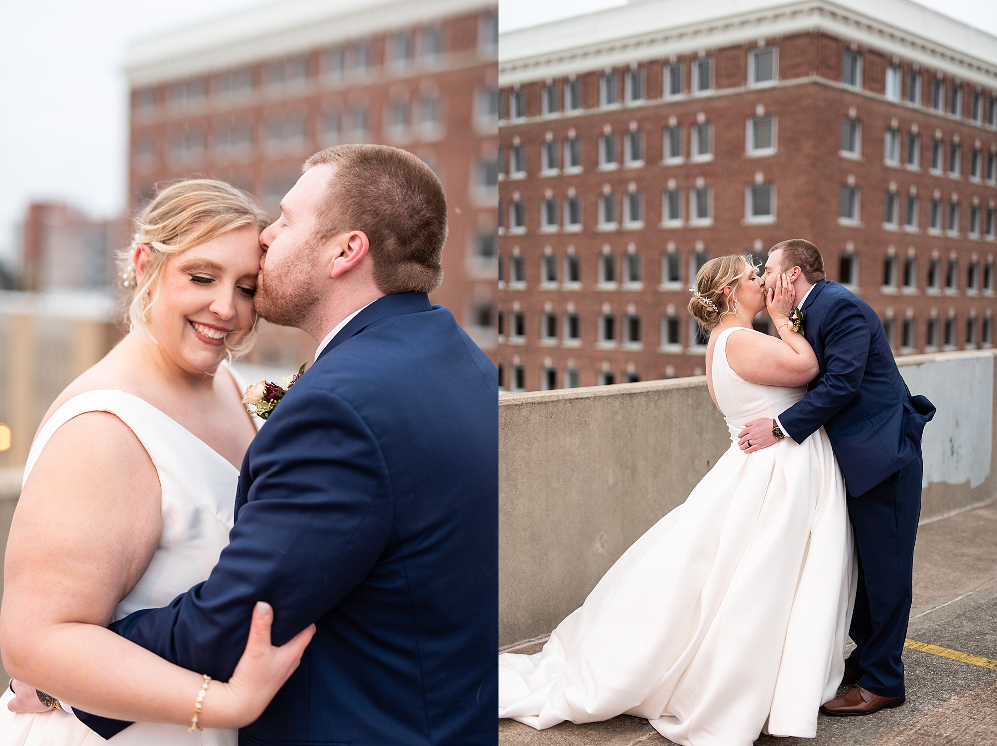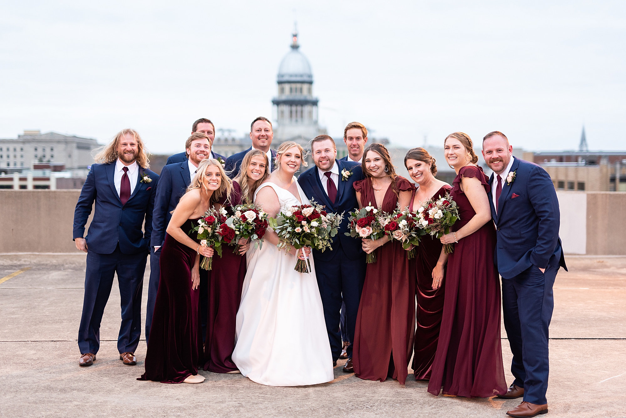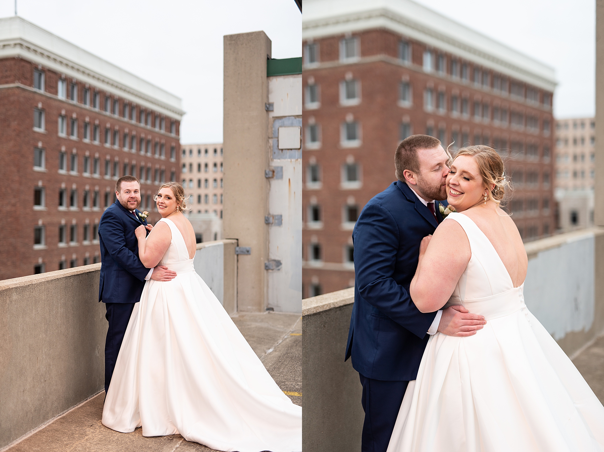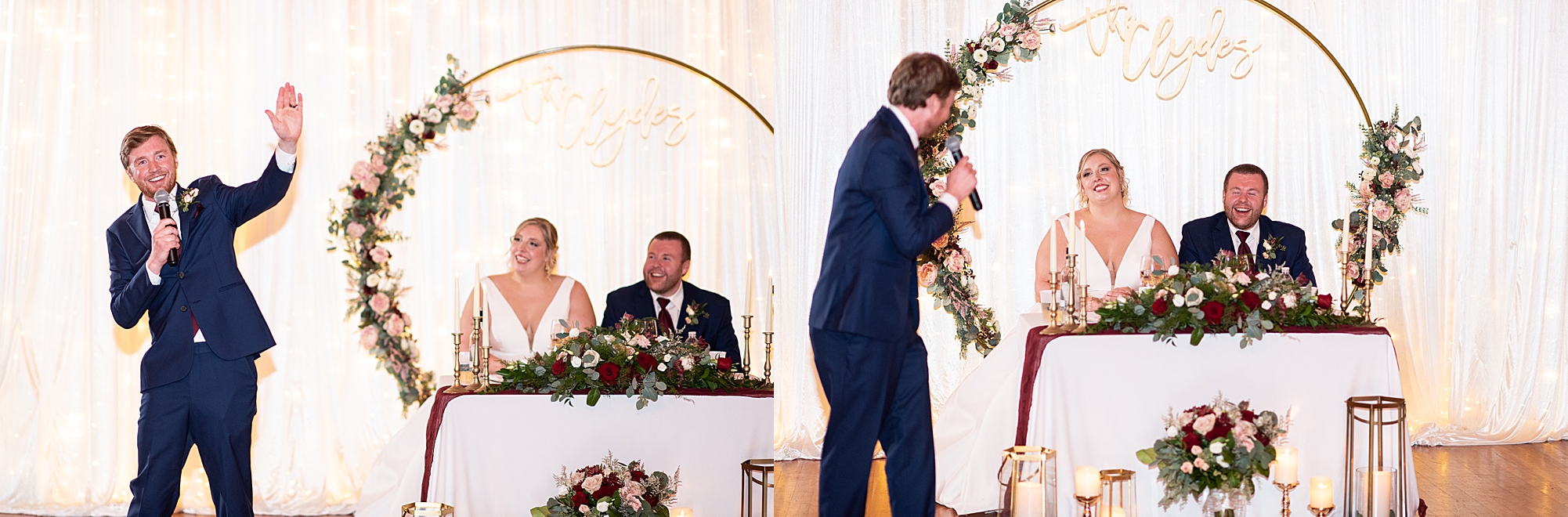 After the ceremony, Sarah and Chris loaded up their bridal party and we headed downtown Springfield for a couple more portraits of them as newlyweds. We stopped at their favorite downtown bar and even climbed a rooftop for a gorgeous cityscape! Chris did such a great job making Sarah laugh and they truly enjoyed spending every moment of their day together! Then, it was finally time to head to their reception to continue their celebration! The Artisans building was packed with all of their guests eager to welcome the newlyweds. Sarah and Chris decorated the venue so perfectly with candle light and so many gorgeous floral details. Everyone truly had such a great night dancing and celebrating Mr. and Mrs. Clyde! I could not be more honored to have been a part of such a special day for Sarah and Chris and I am so excited to share more from their big day!